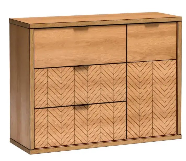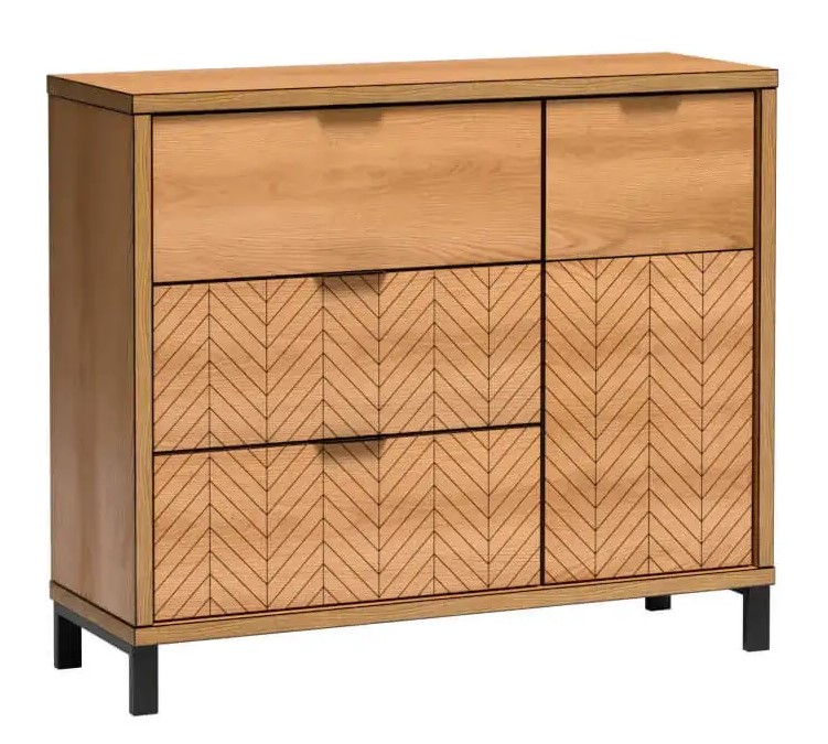 Funkcjonalna komoda z kolekcji FONTI. Pomimo swoich mniejszych rozmiarów pomieści sporo rzeczy! Po lewej stronie znajdziemy 3 pojemne szuflady na ubrania, bielizne, drobiazgi a po prawej stronie szafkę z półką, która dzieli w niej przestrzeń na pół. Dostępna w kolorze dąb karmel.
