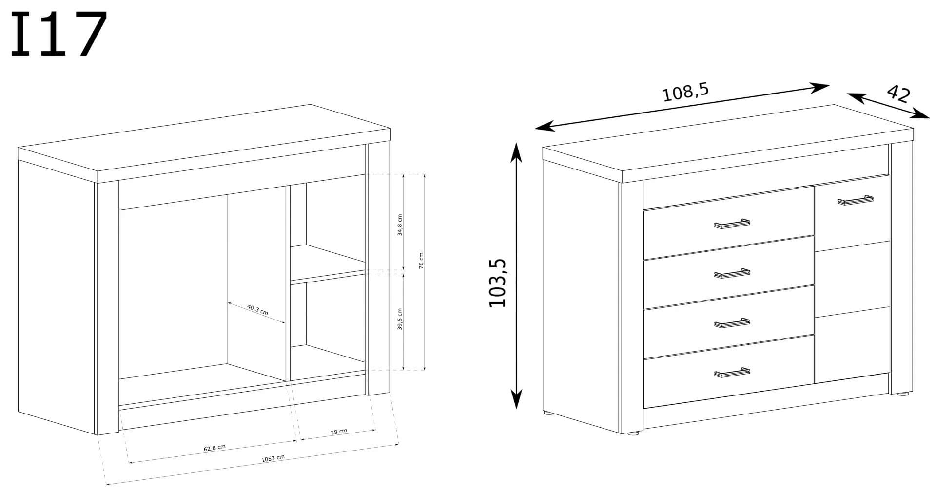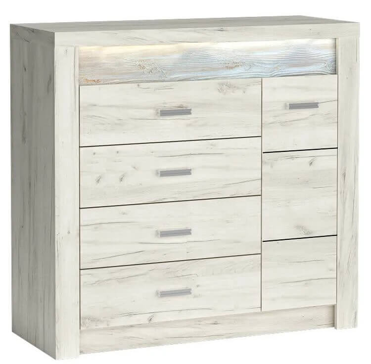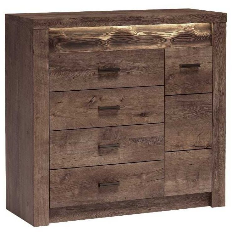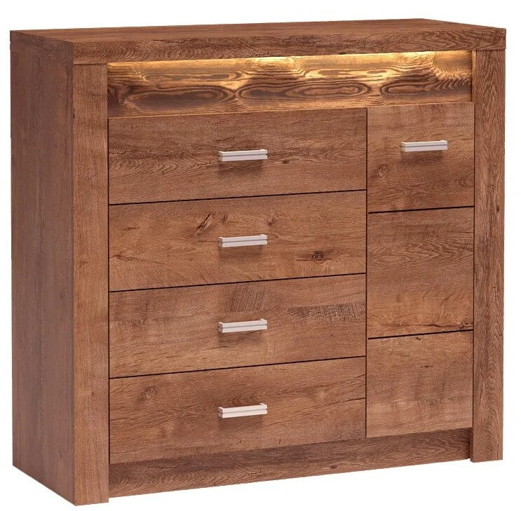 Duża, stabilna i wytrzymała komoda. Posiada cztery pojemne szuflady, w których można przechować wiele ubrań, dokumentów, akcesoriów. Po boku znajduje się szafka z półką w środku, która dzieli przestrzeń na pół, można przez to wykorzystać miejsce mebla w 100%. Komoda idealnie sprawdza się w sypialni, salonie, ale tak i w biurze i gabinecie. Mebel wpasuje się w wiele aranżacji, ale nawet sam wygląda dobrze i wpada w oko. Metalowe uchwyty podkreślają oryginalność mebla. Dostępna w trzech wybarwieniach.