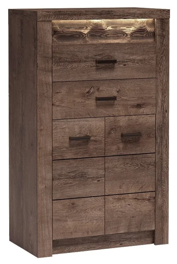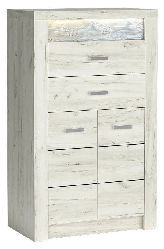 Komoda o wysokości 127 cm. Dolna część to szafa z podwójnymi drzwiami, a w niej półka do przechowywania, która dzieli przestrzeń na pół, przez co miejsce w komodzie da się wykorzystać w 100%. Komoda posiada dwie szuflady, otwierane przez piękne, metalowe uchwyty. Opcja blatu LED dodatkowo urozmaica wygląd mebla. Dostępna w trzech wybarwieniach.