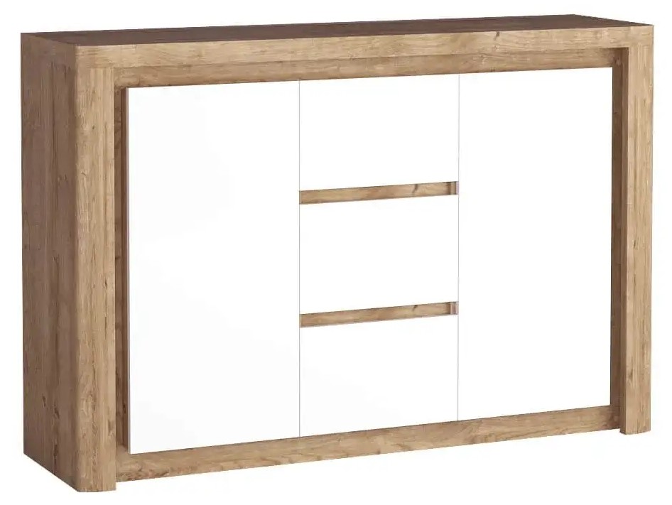 Nowatorska komoda z trzema szufladami w środkowej części i dwoma szafkami. Cudowny, naturalny kolor ribbeck w połączeniu z białymi frontami w połysku. Komoda jest bardzo duża i pojemna. Doskonale pasować będzie do sypialni czy pokoju dziecięcego. Zastosowane w niej zawiasy i prowadnice z cichym domykiem nie spowodują, ze musisz martwić się czy kogoś nie obudzisz. Każda z szaf ma po jednej półce, dzięki czemu zyskujemy miejsce do przechowywania. Komoda w zestawie ma oświetlenie, które wieczorem umili relaks przy naturalnej, ciepłej barwie LEDów.