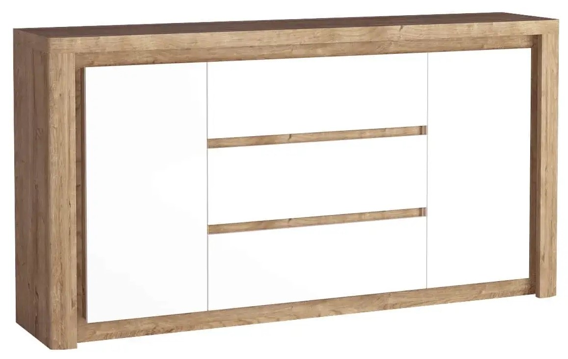 Największa komoda z kolekcji LIVINIO. Jest bardzo szeroka, ma aż 184 cm szerokości! W środkowej część znajdziemy trzy bardzo duże szuflady, wysuwane na prowadnicach z cichym domykiem. Taki sam system zastosowano w drzwiach od szaf. Mebel jest bardzo stabilny i pojemny. Użyte połączeni kolorów frontu i korpusu idealnie wpasuje się w każde wnętrze. Wykorzystać możemy podświetlenie dostępne w zestawie, które oświetli nam górę blatu jak i boki komody.