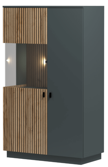 Czarny front komody stanowi kontrastujący element, który nadaje całości charakteru i głębi. Ten odważny akcent tworzy zaskakującą równowagę z jasnym kolorem lameli, przyciągając uwagę i podkreślając wyjątkowość mebla.