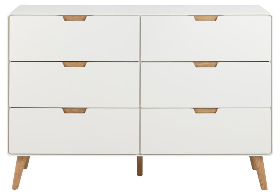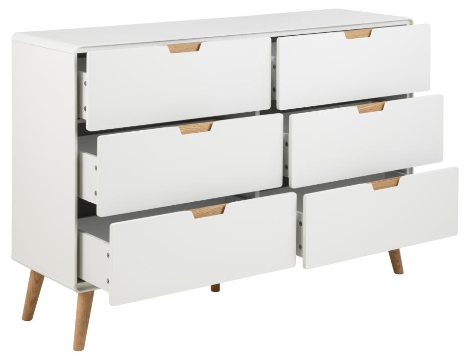 Przestronna komoda Lowell z 6 szufladami zapewnia dużo miejsca do przechowywania ubrań, zabawek i książek. Pomalowana na biało szuflada będzie pasować do niemal każdego pomieszczenia dzięki swojemu minimalistycznemu wyglądowi. Dębowe detale dobrze uzupełniają ogólną estetykę. Jest to rozwiązanie do przechowywania, które bez wysiłku łączy funkcjonalność i design. Wyposażona w 6 szuflad z cichym domykiem . Pomalowane na biało szuflady z dębowymi uchwytami .Stożkowe dębowe nogi . Certyfikat FSC. Wymaga montażu Waga komody: 61 kg. Materiał korpusu i szuflad: MDF, Materiał nóg: drewno dębowe Wysokość nóg: 17 cm Wymiary kartonów: 54x19x79cm waga 35kg, 46x10x149cm, waga 32kg