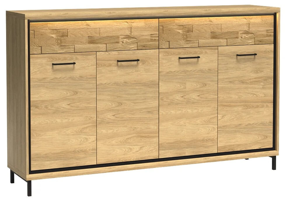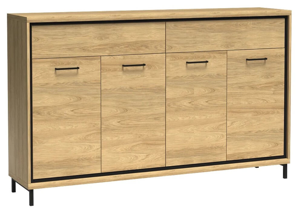 Duża komoda o szerokości aż 177 cm. Dolna część to dwie szafy z podwójnymi drzwiami. W każdej z nich znajduje się półka do przechowywania. Komoda posiada dwie szuflady, otwierane na dotyk, które wysuwają się na prowadnicach. Zawiasy, jakie zastosowano w drzwiach, to najwyżej jakości zawiasy z cichym domykiem, solidne, metalowe. Czarne uchwyty i ozdobna listwa dookoła mebla tworzy ciekawe połączenie z jasną płytą mebla. Kolor najbardziej zbliżony do naturalnego koloru drewna. Komoda pasuje do sypialni, salonu, czy pokoju młodzieżowego, jest uniwersalna i bardzo pojemna. Nowoczesny, industrialny styl. Wykorzystać ją możemy również jako szafa w jadalni do trzymania talerzy, pięknej wazy czy świątecznych dekoracji.