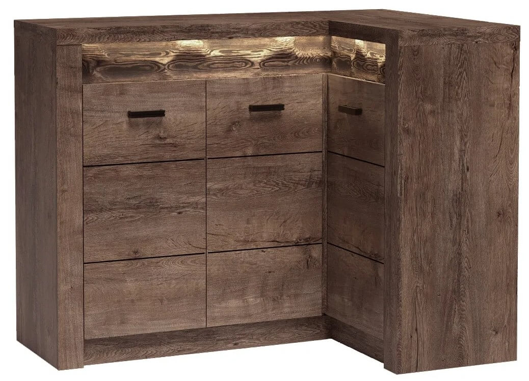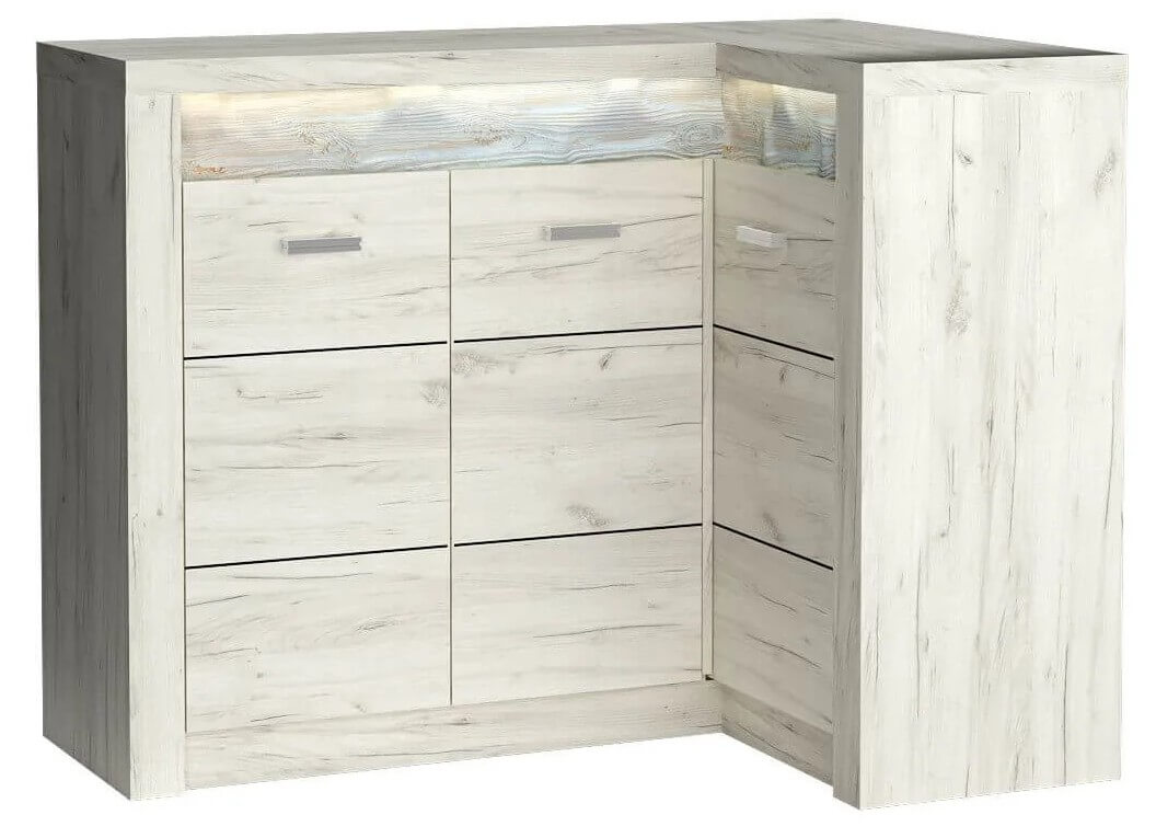 Komoda narożna z kolekcji Indianapolis. Szafki po lewej stronie są połączone i tworzą całość. Znajduję się w niej jedna pojemna półka tak jak i w prawej stronie. Komoda daje dużo możliwości co do jej wykorzystania. Jest pojemna, dzięki niej organizacja jest bardzo łatwa, komoda wpasuje się w każdy kąt. Dostępna jest również wersja odwrotna mebla. Metalowe uchwyty idealnie wpajają się w całość mebla, pokazując przy tym, jak bardzo jest przemyślany każdy detal. Dostępna w trzech wybarwieniach.