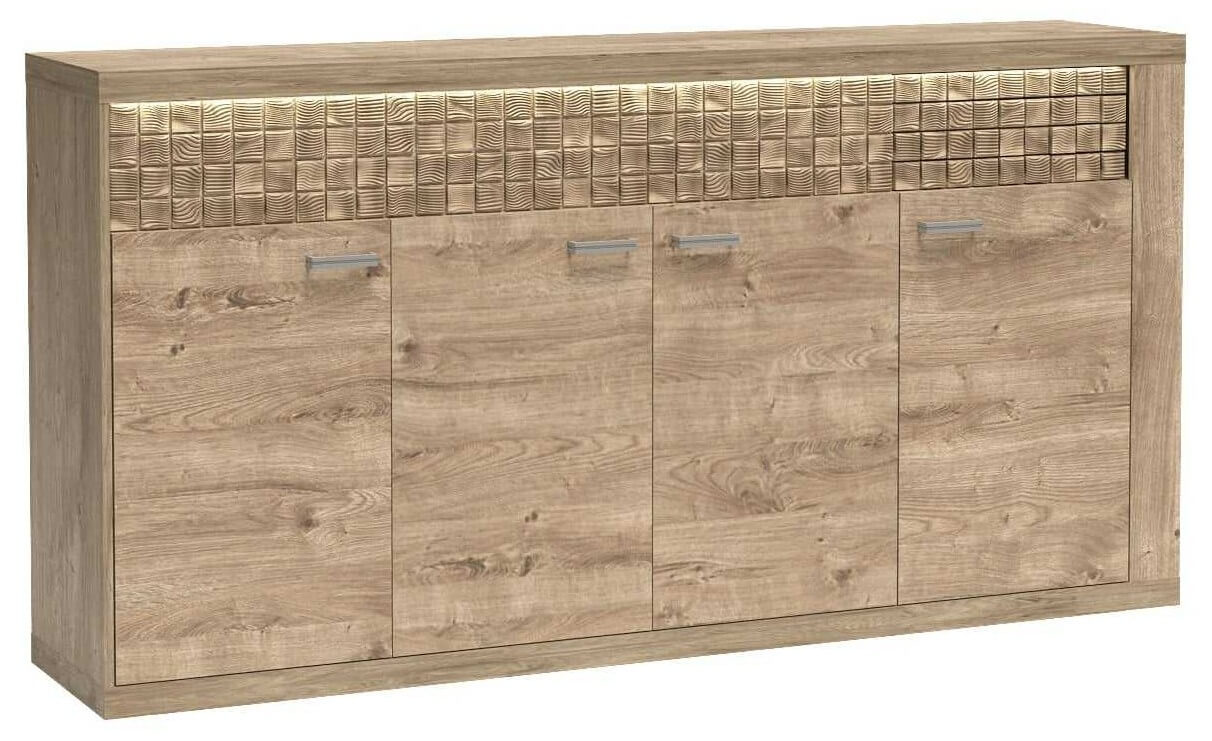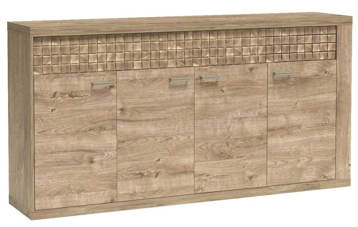 Duża komoda z czterema szafkami. W środku pojemne dwie półki a wyżej szuflady z systemem Push To Open. Mebel pomieści wiele ubrań, akcesoriów i dokumentów. Będzie pasować do salonu, biura, przedpokoju czy gabinetu. Przyciągnie uwagę nie jednego gościa. Komoda została wykonana z solidnego materiału, co czyni ją wytrzymałą i gwarantuje wiele dobrych i miłych lat użytkowania mebla. Metalowe uchwyty i cichy domyk podkreślają delikatność i pokazują dbałość w najmniejsze detale. Dostępna w jednym wybarwieniu.