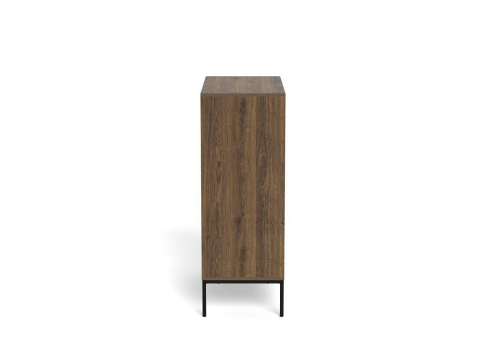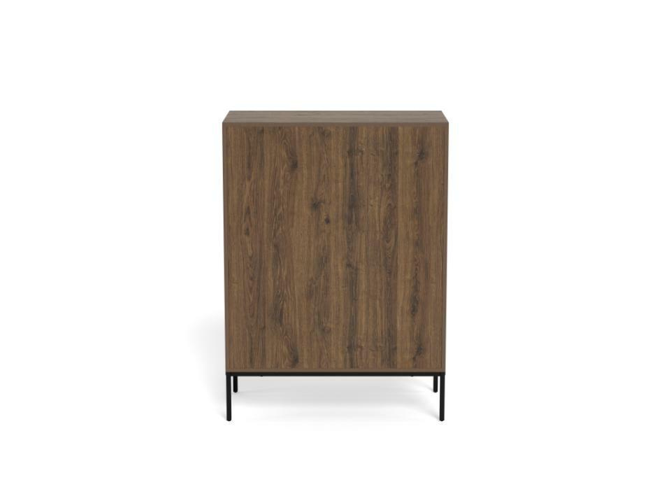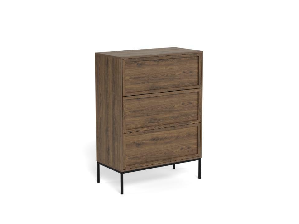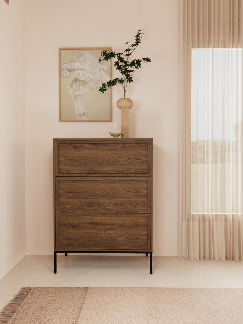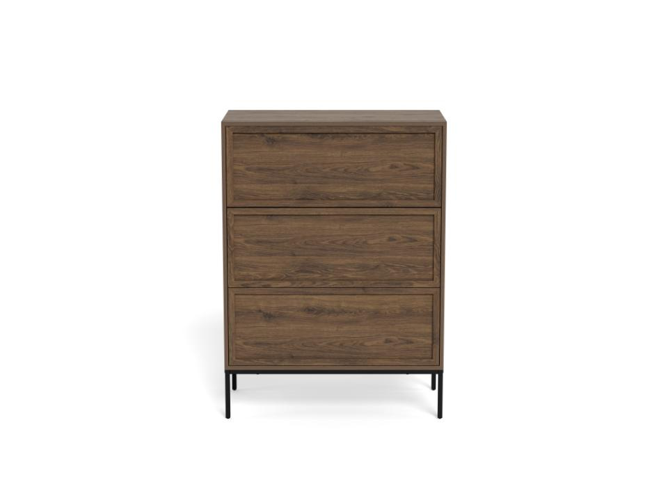Ta komoda pomoże Ci utrzymać porządek i jednocześnie wzbogacić Twoją przestrzeń. Nadająca ciepły klimat, stylizowana na dąb wędzony, łatwa w pielęgnacji powierzchnia. Osadzone w smukłej ramie, trzy szuflady z mechanizmem push-to-open, obszyte listwami, tworzą gładki, elegancki front. Czarne, kwadratowe, stalowe nogi nadają konstrukcji optycznej lekkości.