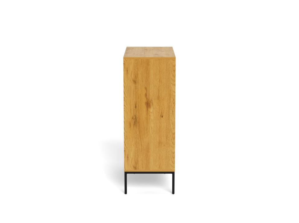 Ta komoda pomoże Ci utrzymać porządek i jednocześnie wzbogacić przestrzeń. Nadając wyrafinowany charakter, komoda zachwyca łatwą w pielęgnacji powierzchnią z melaminy w kolorze dzikiego dębu. Osadzone w smukłej ramie, trzy szuflady otwierane na naciśnięcie, obszyte listwami, tworzą gładki, elegancki front. Czarne, kwadratowe, stalowe nogi nadają konstrukcji optycznej lekkości.