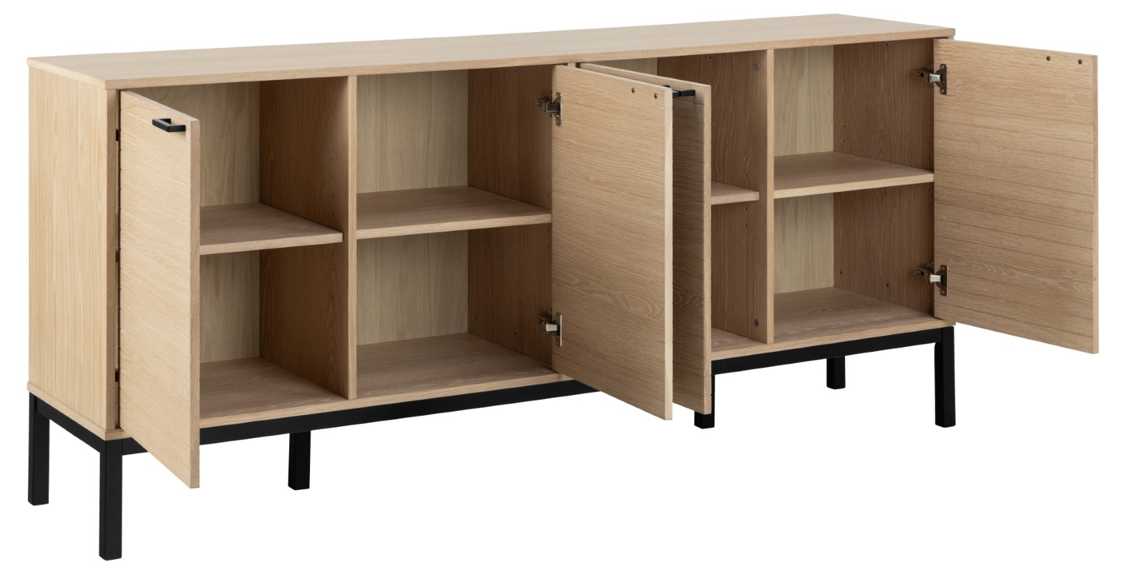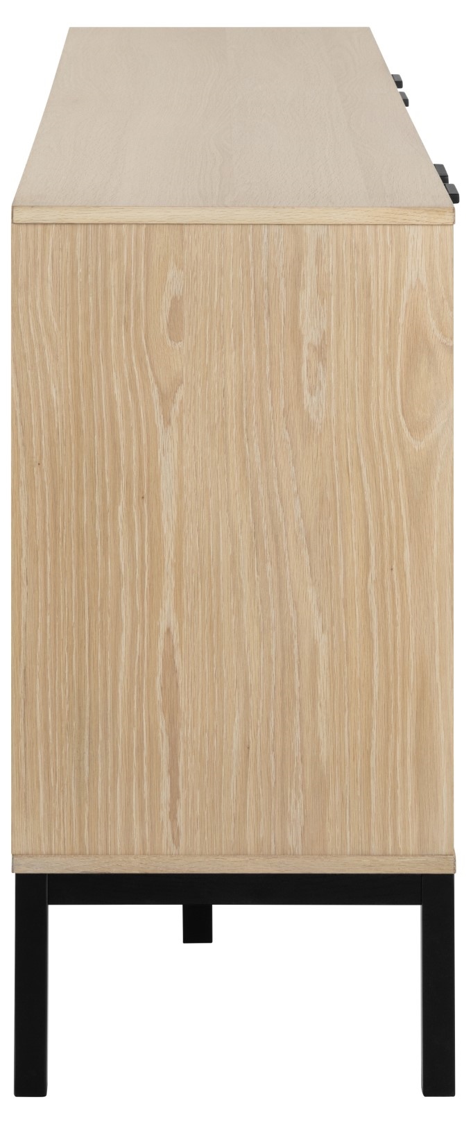 Ta efektowna szafka wnosi do wnętrza orzeźwiającą energię. Dzięki kontrastowemu wyglądowi, uzyskanemu poprzez połączenie białego pigmentowanego olejowanego forniru dębowego i czarnego lakierowanego forniru dębowego, szafka zwiększa dynamikę w pomieszczeniu. Posiada 6 regulowanych półek ukrytych za 4 drzwiami ozdobionymi dekoracyjnymi lamelami. Materiał płyta MDF z dębowym fornirem oraz metalowa podstawa Wymaga montażu. Kredens Kensington, blat, rama, 4 drzwi i 4 półki fornir dębowy olejowany pigmentowany na biało, podstawa dąb lakierowany NC czarny matowy, z frontem lamelowym, 180x40x80 cm