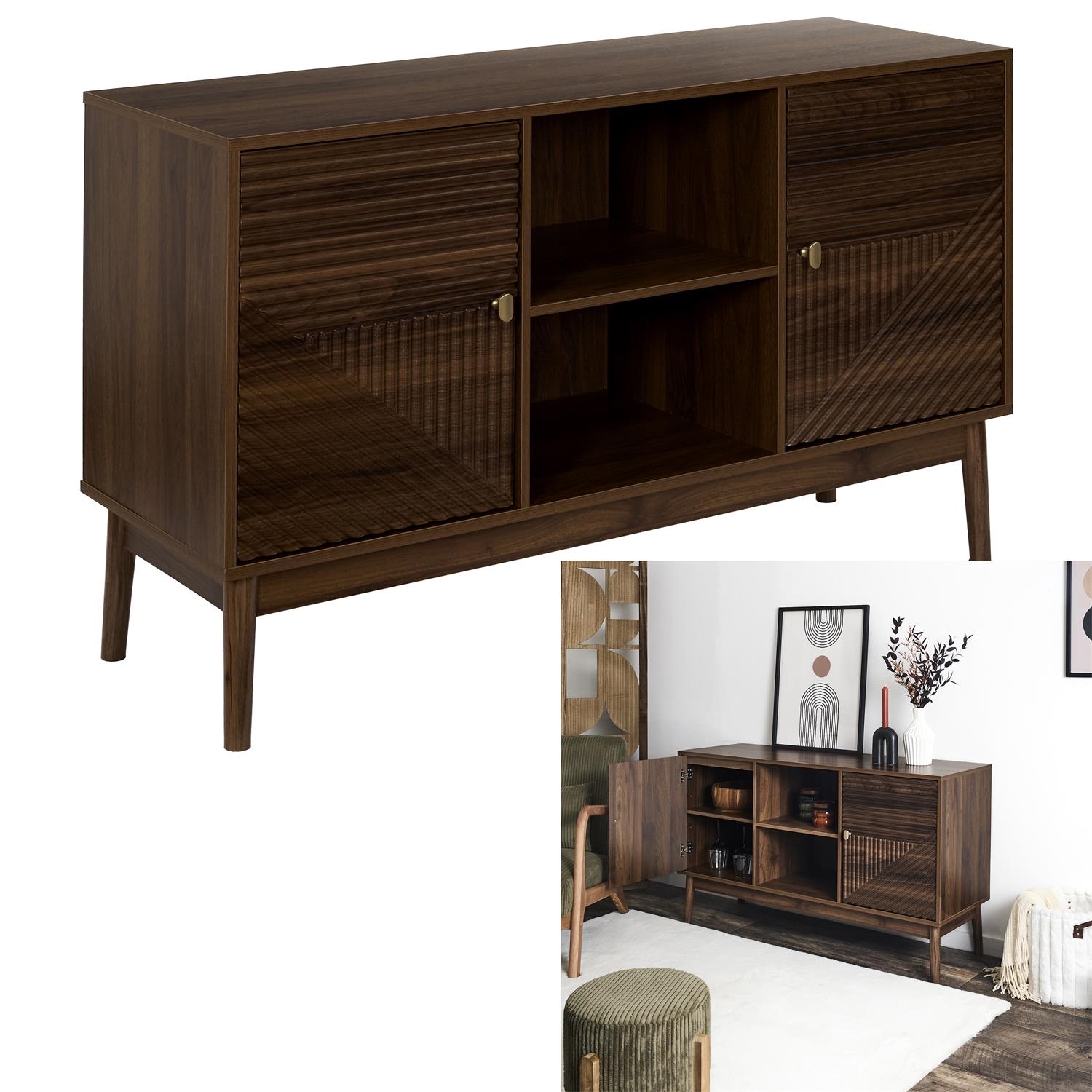 Komoda wymaga montażu Materiał: Płyta MDFw okleinie imitującej orzech. Nogi drewno sosnowe, uchwyty metal. Komoda wyposażona w 2 fronty za którymi kryją się dodatkowe półki. Max. obciążenie mebla 40kg.