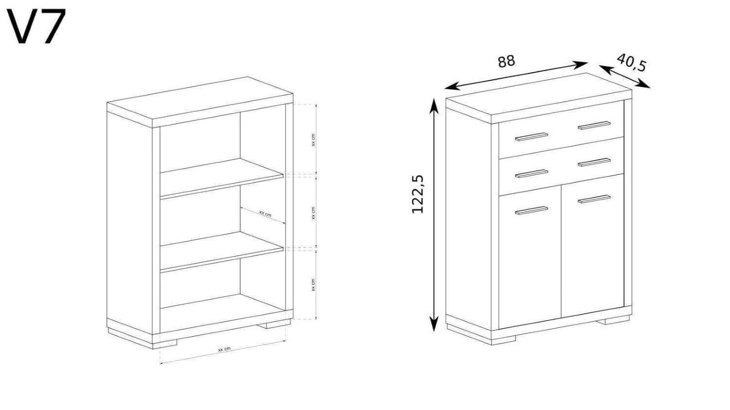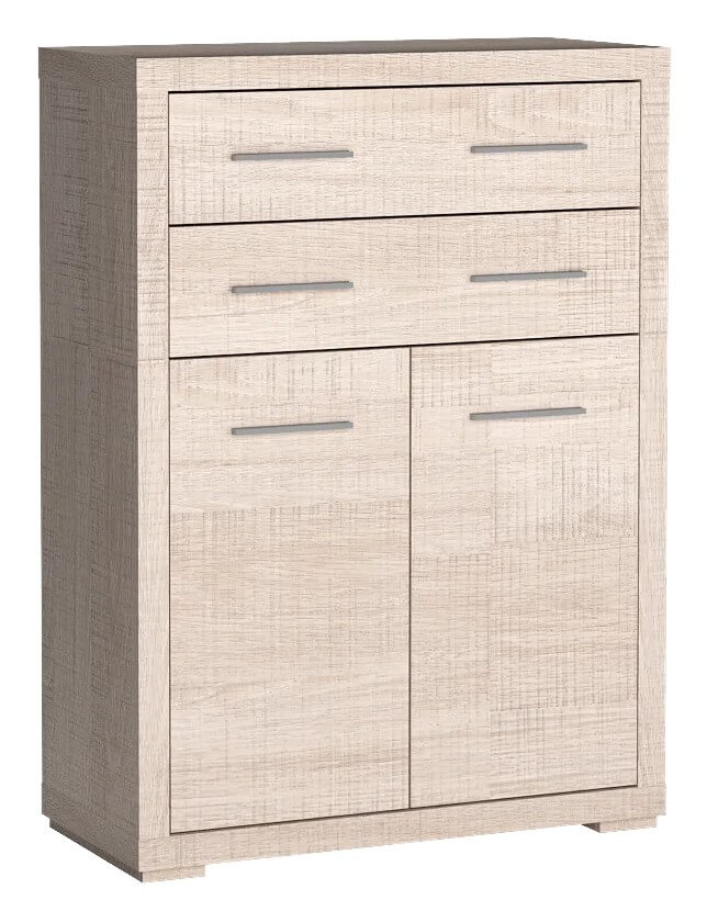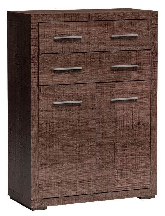 Prosta wysoka komoda z kolekcji Vegas. Posiada dwie pojemne szuflady, idealne na ubrania, czy dokumenty. Poniżej nich, znajduje się dwoje drzwi, za którymi jest przegroda i półka, pozwala to na dobrą organizację, oraz zagospodarowanie sporej ilości rzeczy. Metalowe uchwyty uwydatniają wyjątkowość mebla, Pasuje do salonu, jak i biura, można stworzyć z nią wiele aranżacji. Dostępna w dwóch wybarwieniach.