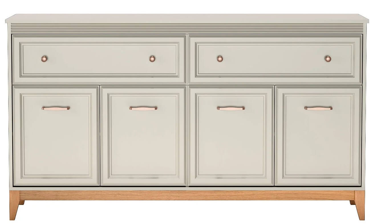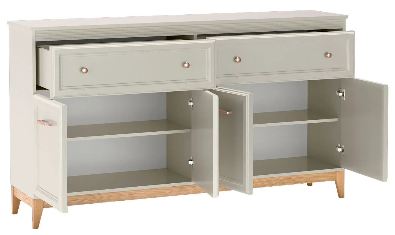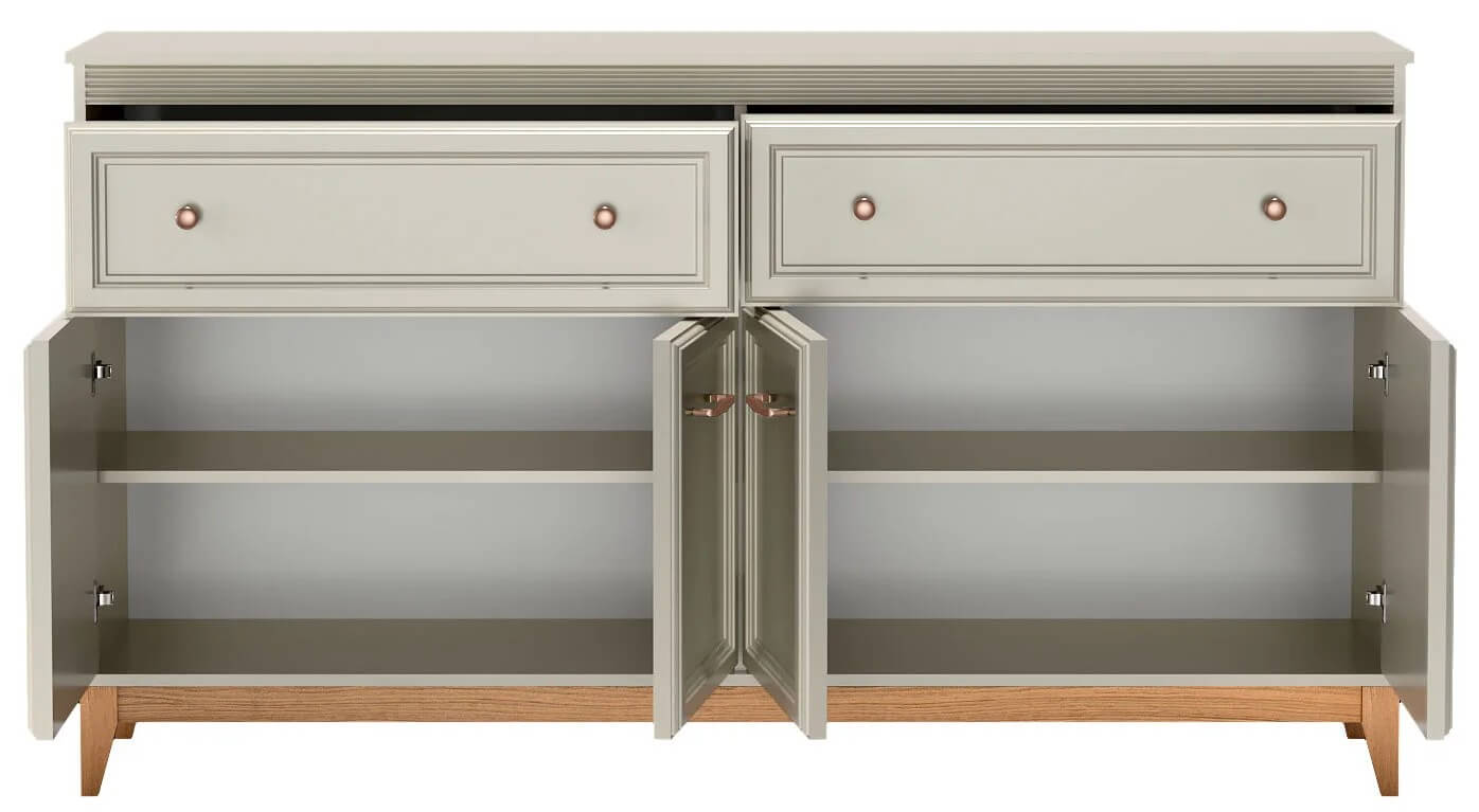 Stabilna konstrukcja oparta na drewnianych nogach nadaje meblowi lekkości, a frezowane fronty podkreślają jego elegancki charakter. Dwie przestronne szuflady w górnej części pomogą Ci uporządkować drobne akcesoria, a cztery zamykane szafki w dolnej części zapewnią mnóstwo miejsca na przechowywanie.