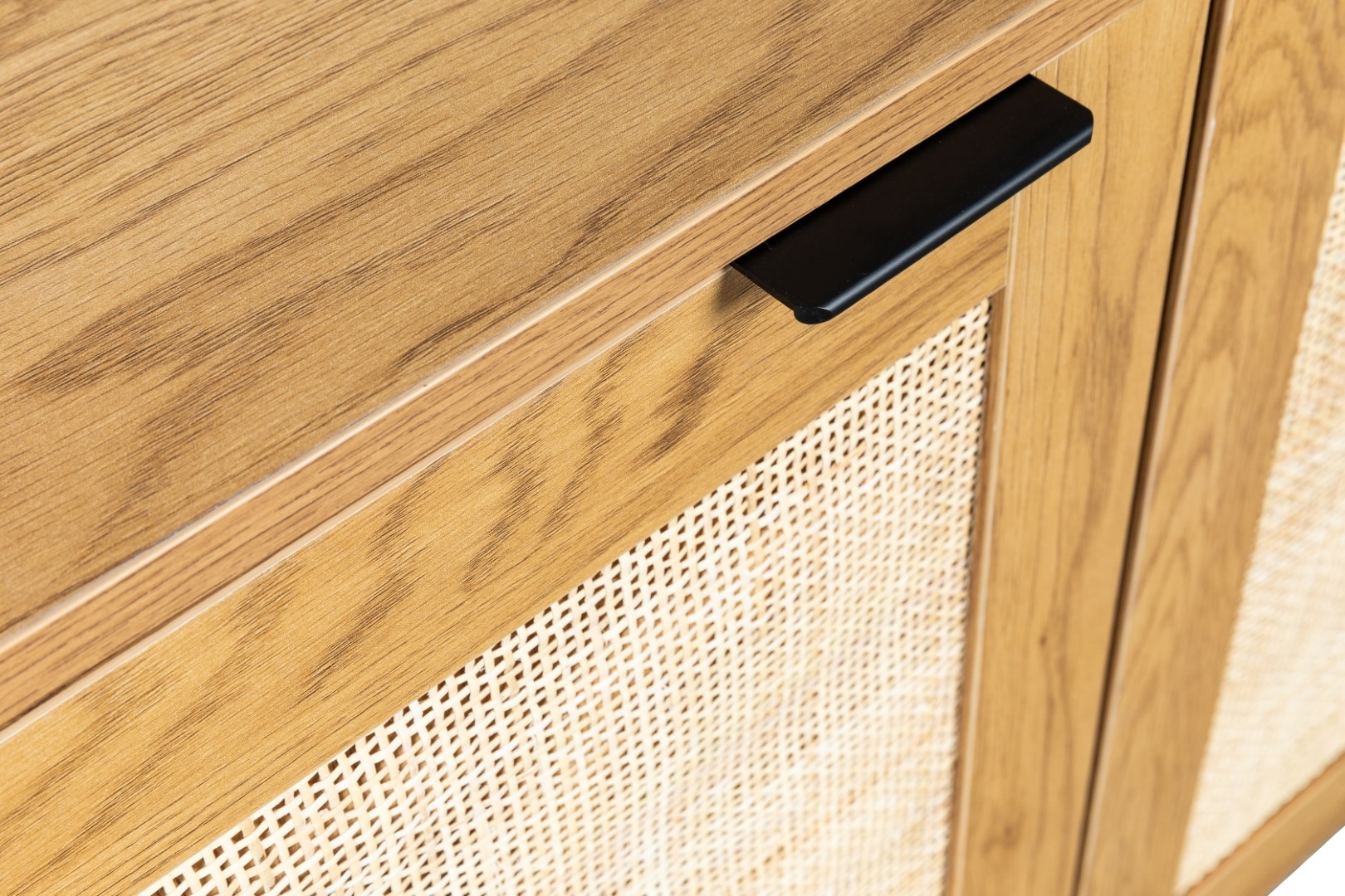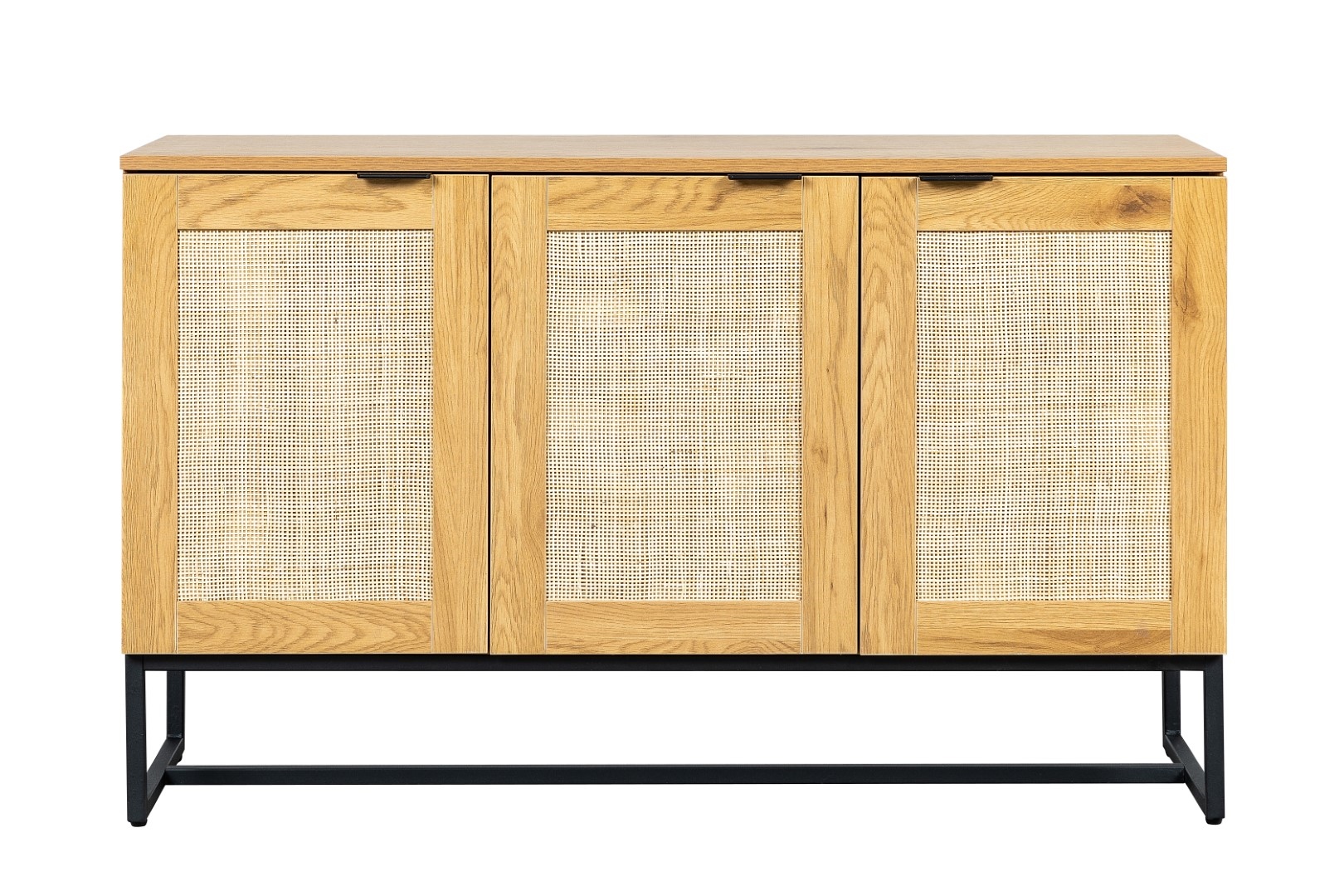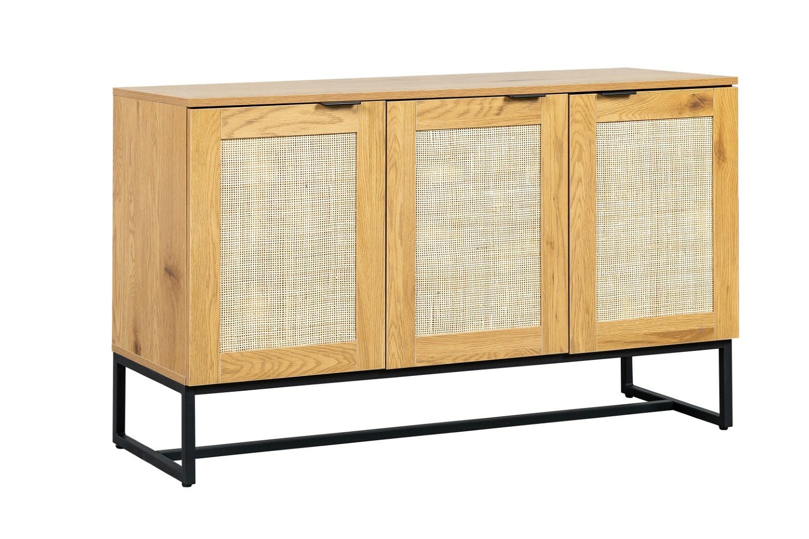 Komoda w stylu boho z rattanowymi frontami to idealny mebel do sypialni lub salonu w naturalnych, jasnych kolorach. Komoda z trzema frontami skrywa w sobie półki, na których możemy przechowywać nie tylko ubrania, ale również talerze. Komoda stoi stabilnie dzięki metalowej podstawie. Nogi komody zostały polakierowane proszkowo na czarno. Dębowa okleina, którą została wykończona szafka, niezwykle dokładnie imituje naturalny kolor oraz teksturę drewna. Swoją wytrzymałość komoda zawdzięcza trwałym materiałom jak płyta MDF, z której wykonany został korpus oraz metal użyty na podstawie. Fronty szafki w środku wykonane zostały z naturalnego rattanu. Naturalny rattan to nie tylko niewiarygodnie dobrze wyglądający materiał. Rattan przede wszystkim gwarantuje cyrkulację powietrza w komodzie. Wymiary kartonu: 130x48x15cm