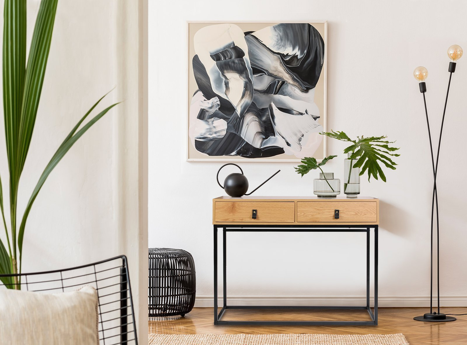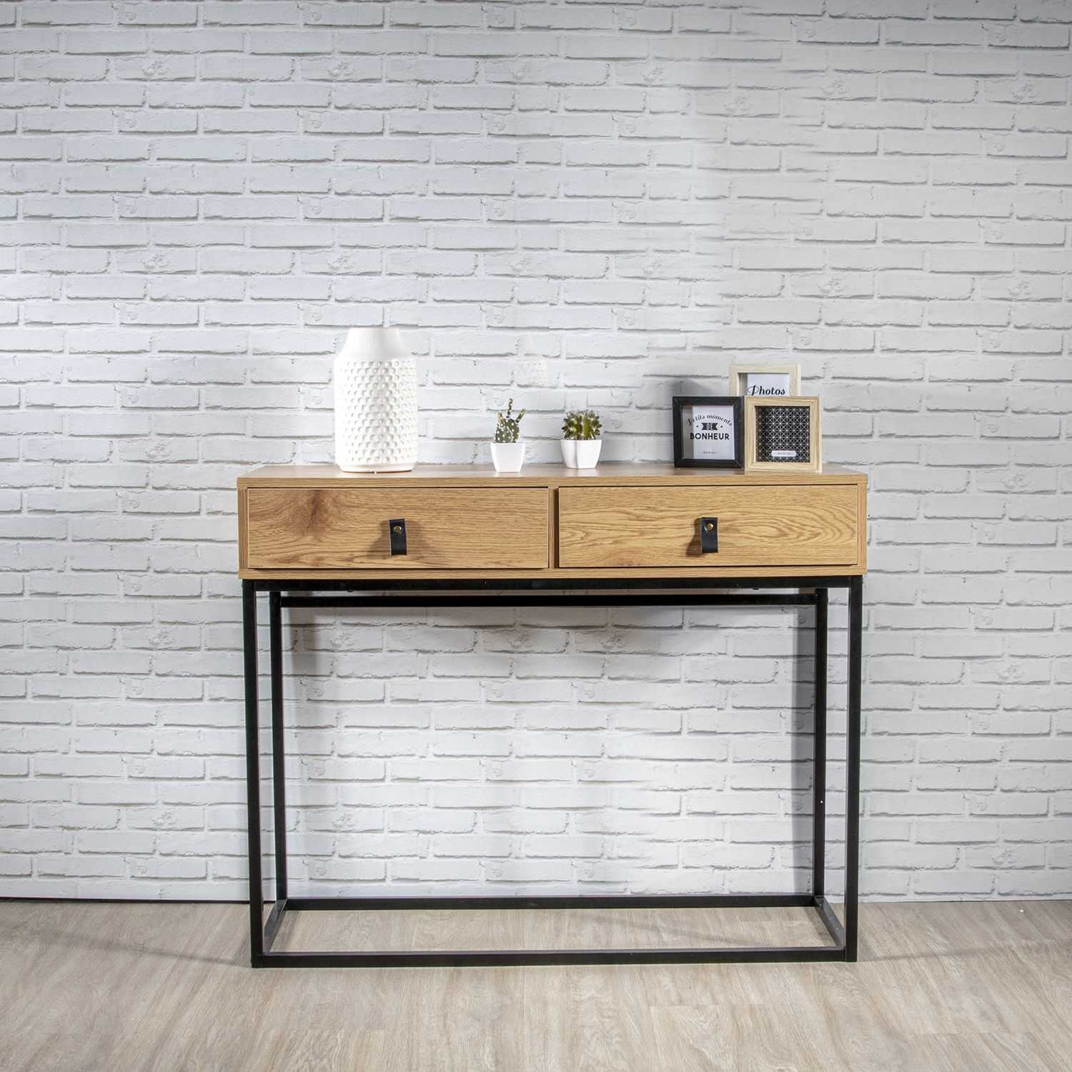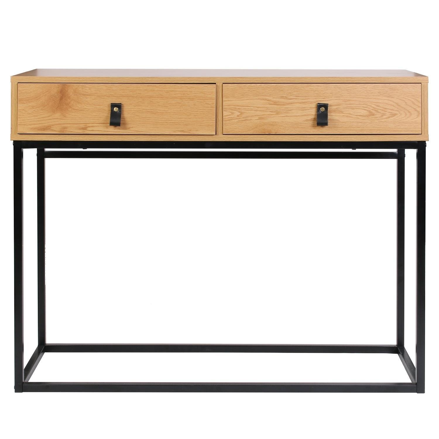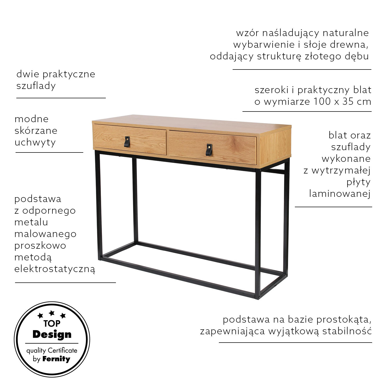 Konsola zaprojektowana została z myślą o uniwersalnym wpisaniu się w różne potrzeby. Pięknie wygląda w domowym salonie, ale świetnie uzupełni również wnętrze w przestrzeni biurowej. Prostota jej formy stanowi kluczowy motyw w łatwej aranżacji z jej zastosowaniem. Konsola Abbott powstała ze sprawdzonych materiałów najwyższej jakości. Blat wykonano z trwałej i solidnej płyty laminowanej w kolorze złotego dębu. Nogi natomiast zaprojektowane zostały z bardzo wytrzymałego metalu, pomalowanego proszkowo na czarno. Blat oraz szuflady dają mnóstwo przestrzeni, którą można dowolnie zagospodarować. Ciekawe ułożenie nóg daje nie tylko stabilną podporę mebla, ale również sprawia, że całość wygląda niebanalnie.