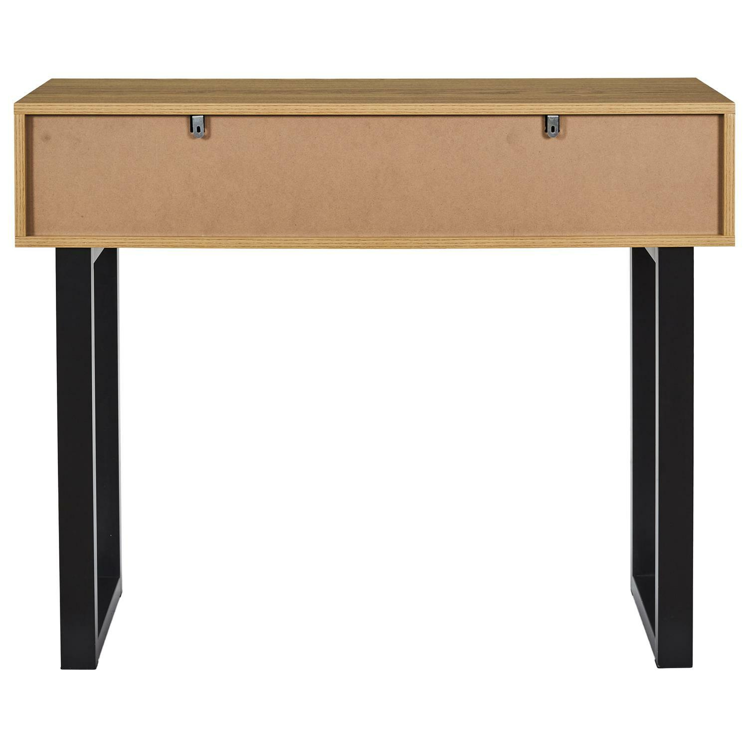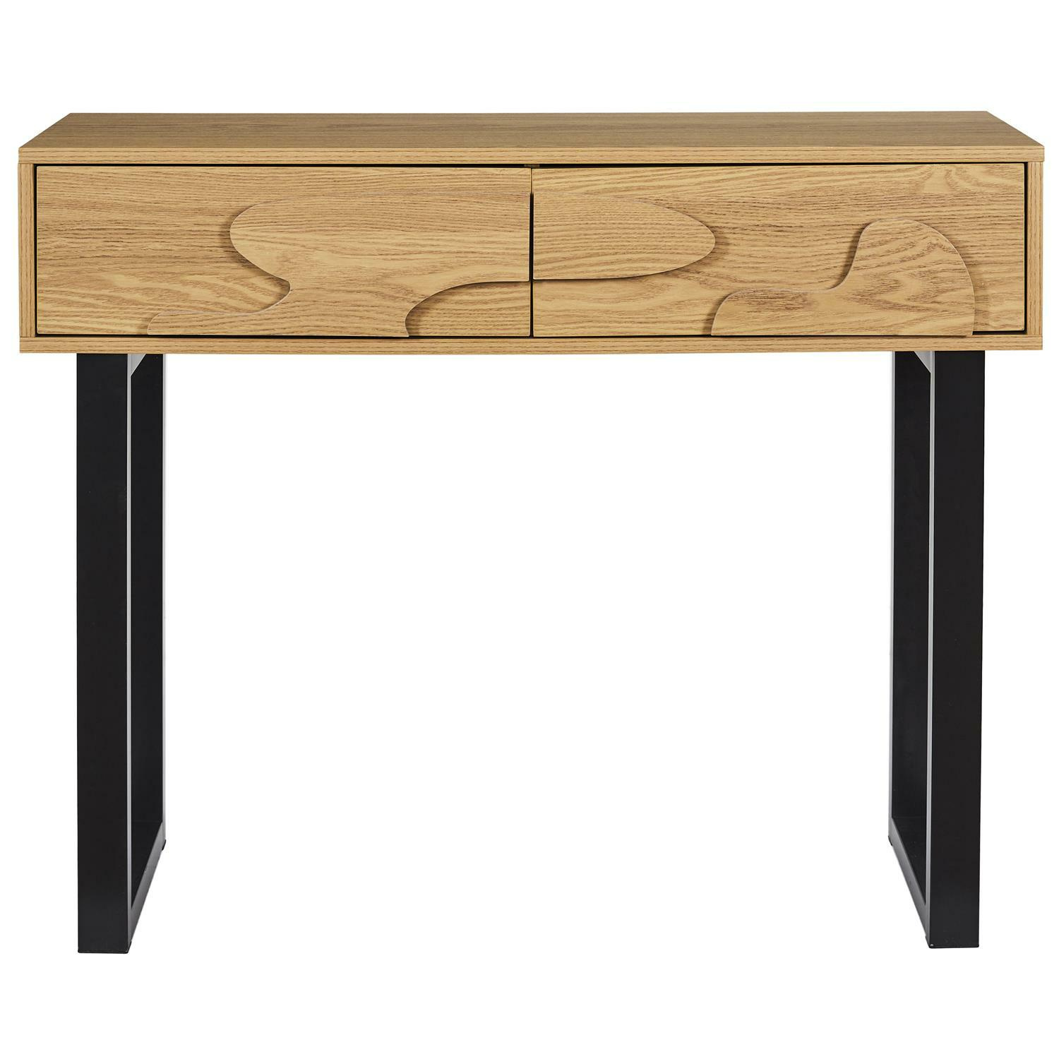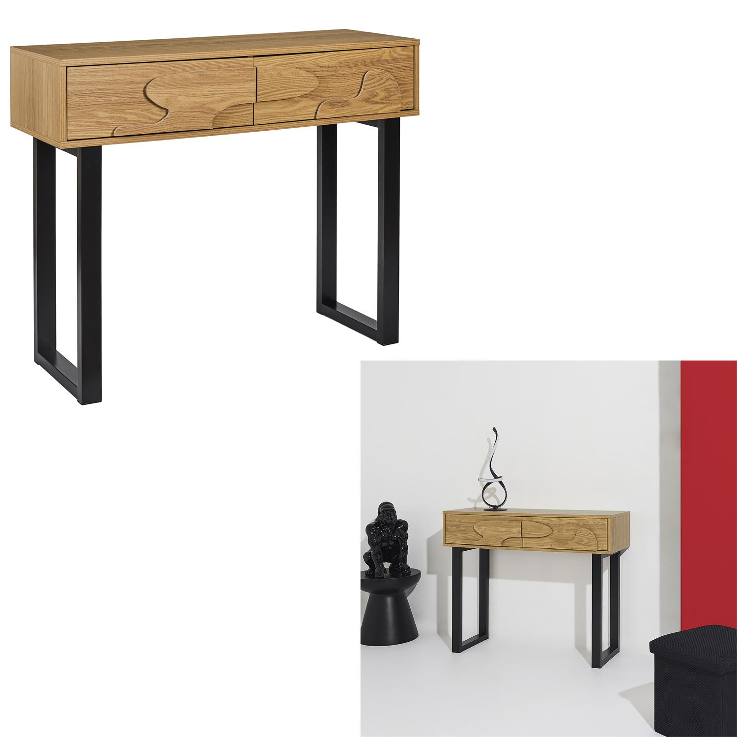 Konsola Calypso to idealny mebel do przedpokoju lub salonu w stylu Boho. Konsola Calypso wykonana została z płyty MDF w oklinie imitującej strukturę i kolor dębu. Konsola wyposażona została w dwie szuflady. Pojemne szuflady otwierają się dzięki metalowym, kulkowym prowadnicą. Podstawą konsoli są nogi w kształcie płozy. Nogi wykonane z metalu malowanego proszkowo w kolorze czarnym. Maksymalne obciążeni konsoli 40kg. Konsola wymaga montażu.