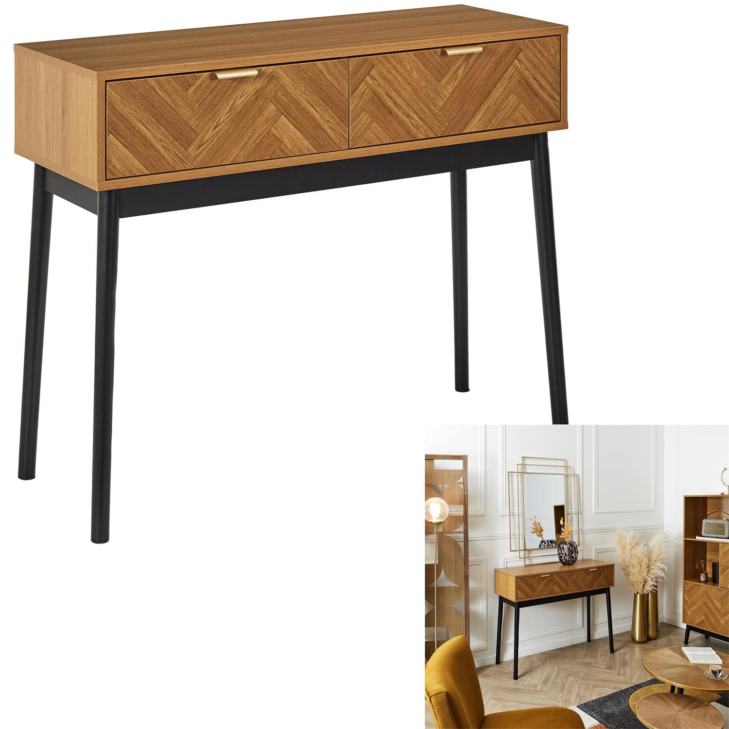 Konsola Felix to połączenie stylu retro z nowoczesnymi rozwiązaniami. Nogi konsoli lekko rozchodzące się na zewnątrz nawiązują do stylu skandynawskiego. Stolik to połączenie ciekawych frontów w jodełkę oraz czarnych prostych nóg. Konsola wyposażona jest w 2 szuflady na szynach kulkowych. Uchwyty to polakierowane na złoty kolor metalowe rączki.