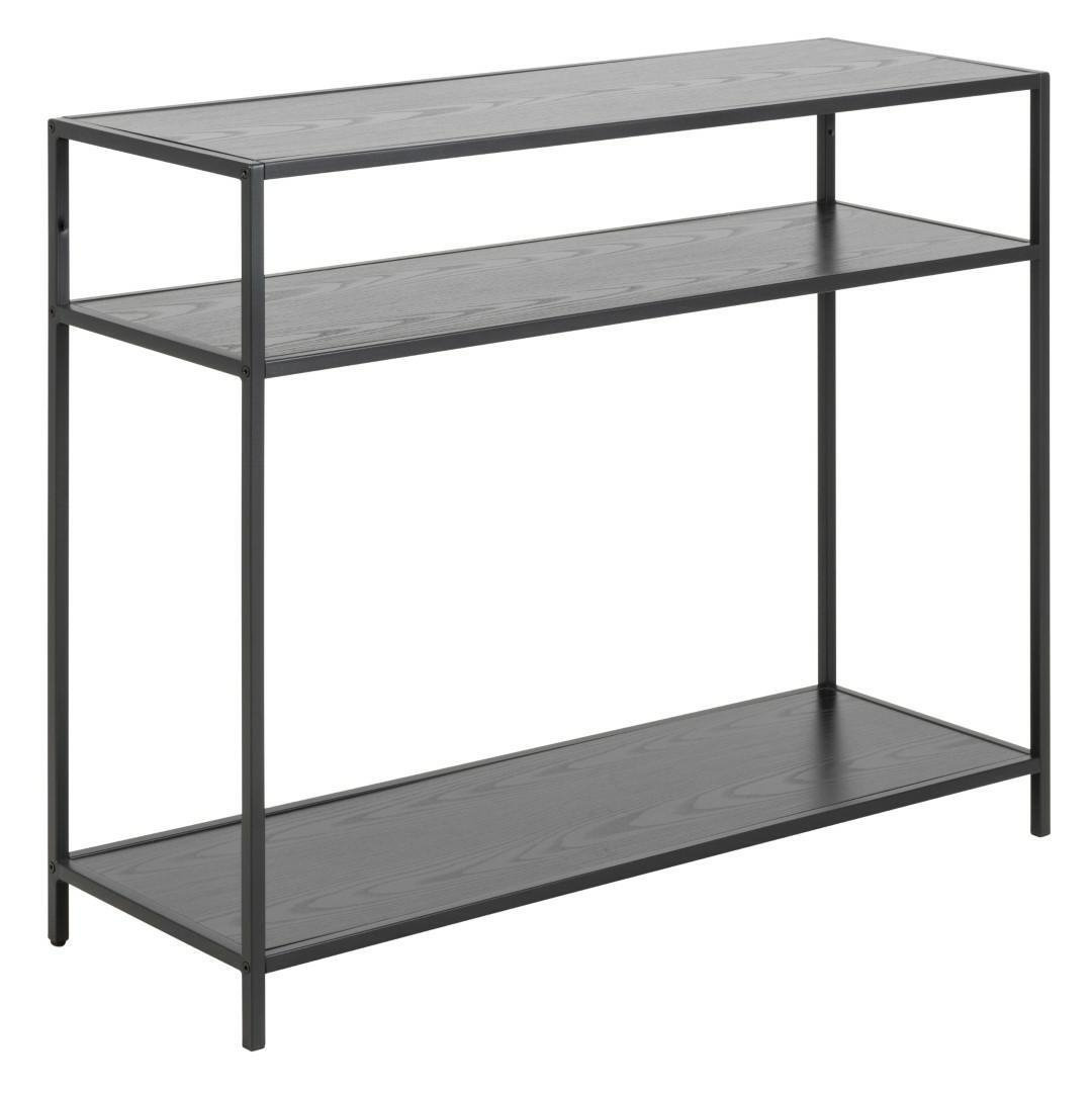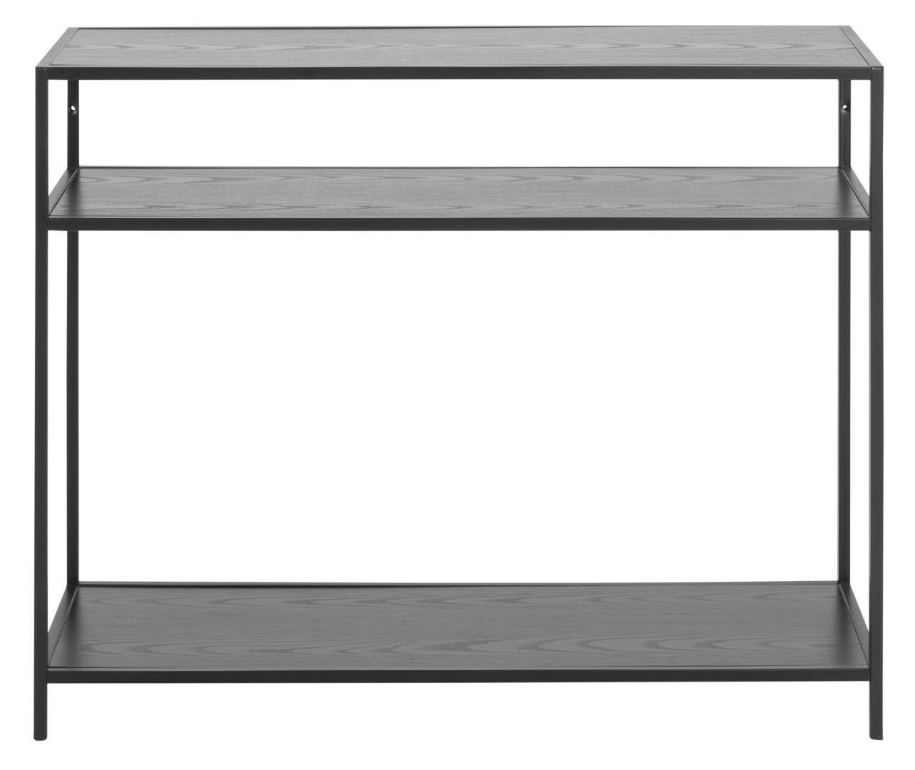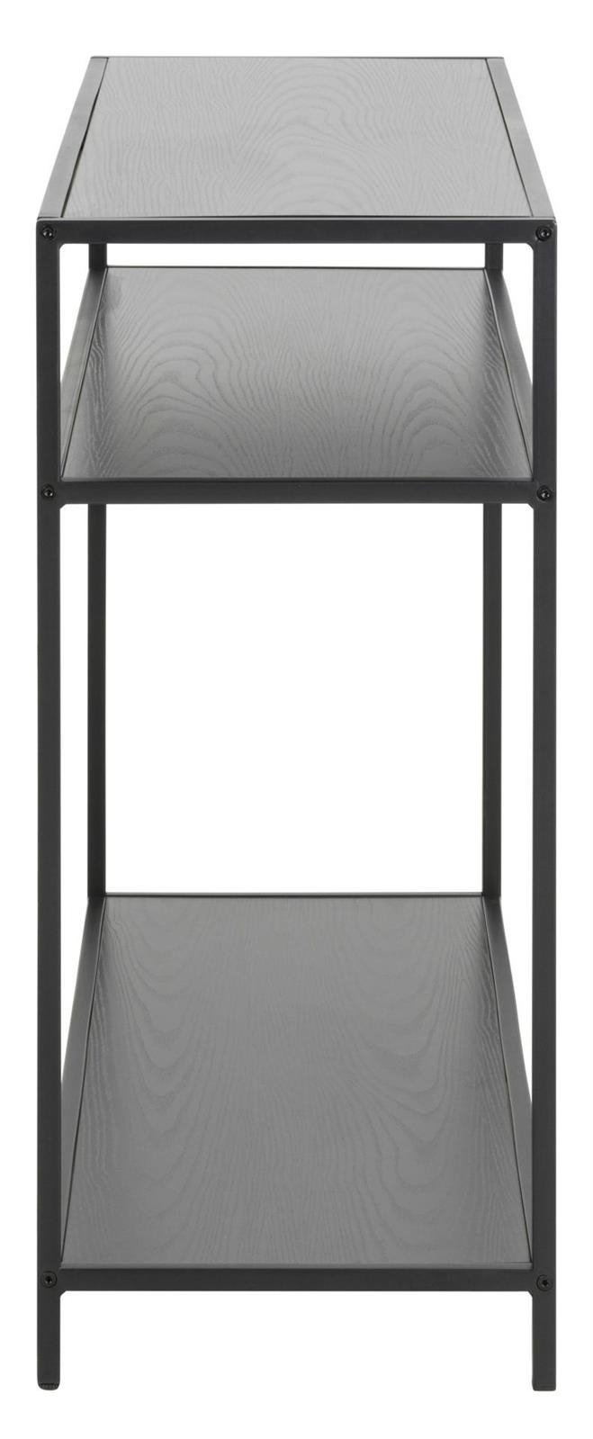 Konsola Seaford to industrialny mebel o prostej i eleganckiej formie. Metalowa konstrukcja została pomalowana proszkowo na czarno. Czarne półki z MDF zostały pokryte czarną okleiną o strukturze drewna dębu. Konsola składa się z trzech półek.