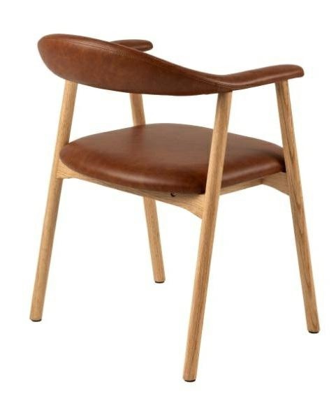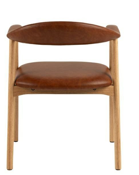 Charakteryzujące się lekką formą i czystą estetyką krzesło z podłokietnikami i otwartym oparciem wyróżnia się współczesnym, skandynawskim stylem. Drewniany stelaż z litego drewna pokryty olejem, wypełnia przestrzeń ciepłą i zachęcającą atmosferą. Aby podkreślić elegancję krzesła, siedzisko pokryte jest sztuczną skórą w kolorze brandy. Nowoczesne krzesło do jadalni w skandynawskim stylu . Praktyczna i elegancka tapicerka ze sztucznej skóry w kolorze brandy. Olejowany dąb zapewnia ciepły i naturalny wygląd. Certyfikat FSC. Krzesło nie sztapluje się. Krzesło wymaga montażu Wysokośc oparcia: 32cm Głębokość siedziska: 45cm Szerokość siedziska: 47cm Wyskośc podłokietniakod siedziska: 21cm Wymiary kartonu: 28x58x75cm Waga kartonu: 7,75kg