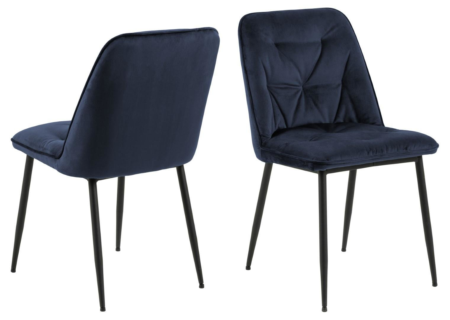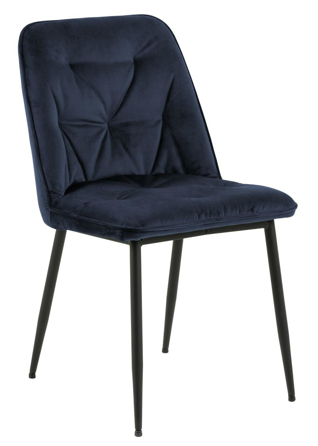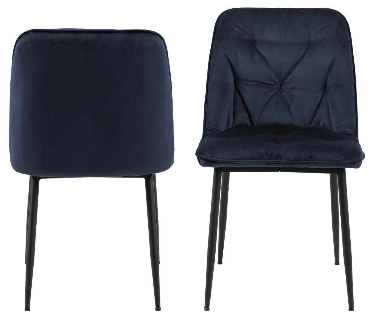 Krzesło Brooke standard jest krzesłem tapicerowanym miękką welwetową tkaniną Vic fabric midnight blue 77AC FR. Krzesło posiada wygodne oparcie, które zostało ozdobione pikowaniem dodającym mu stylu. Podstawą krzesła są malowane proszkowo na czarno metalowe nogi. Maksymalne obciążenie: 120 kg.