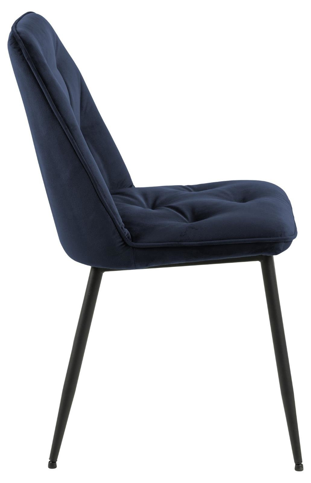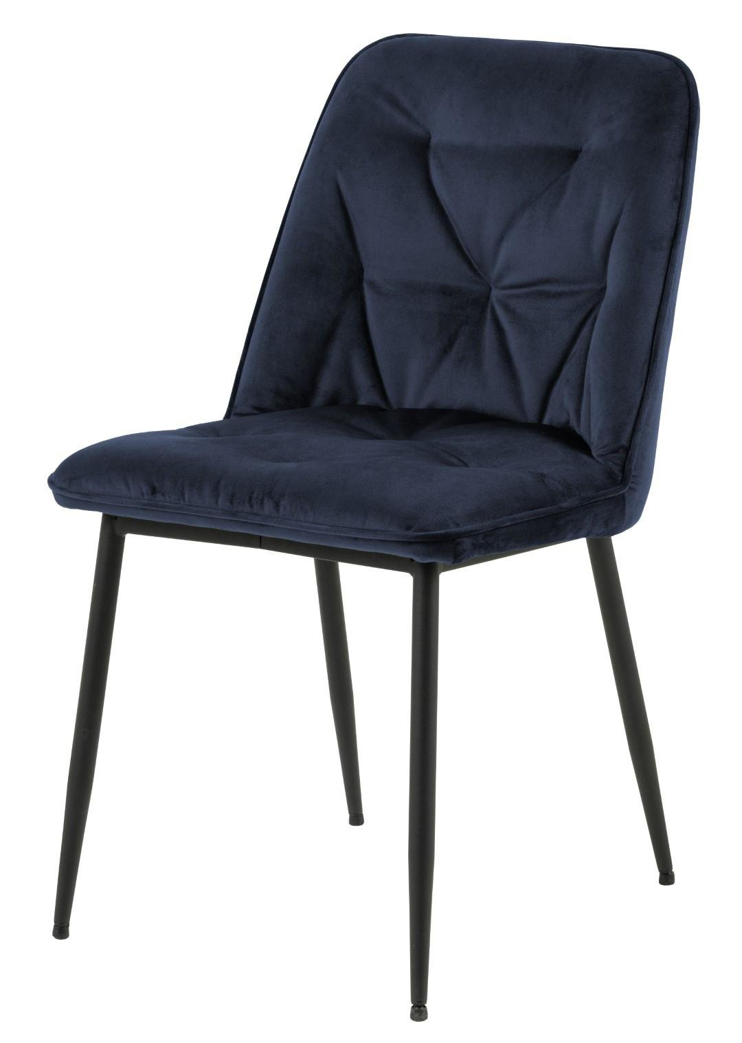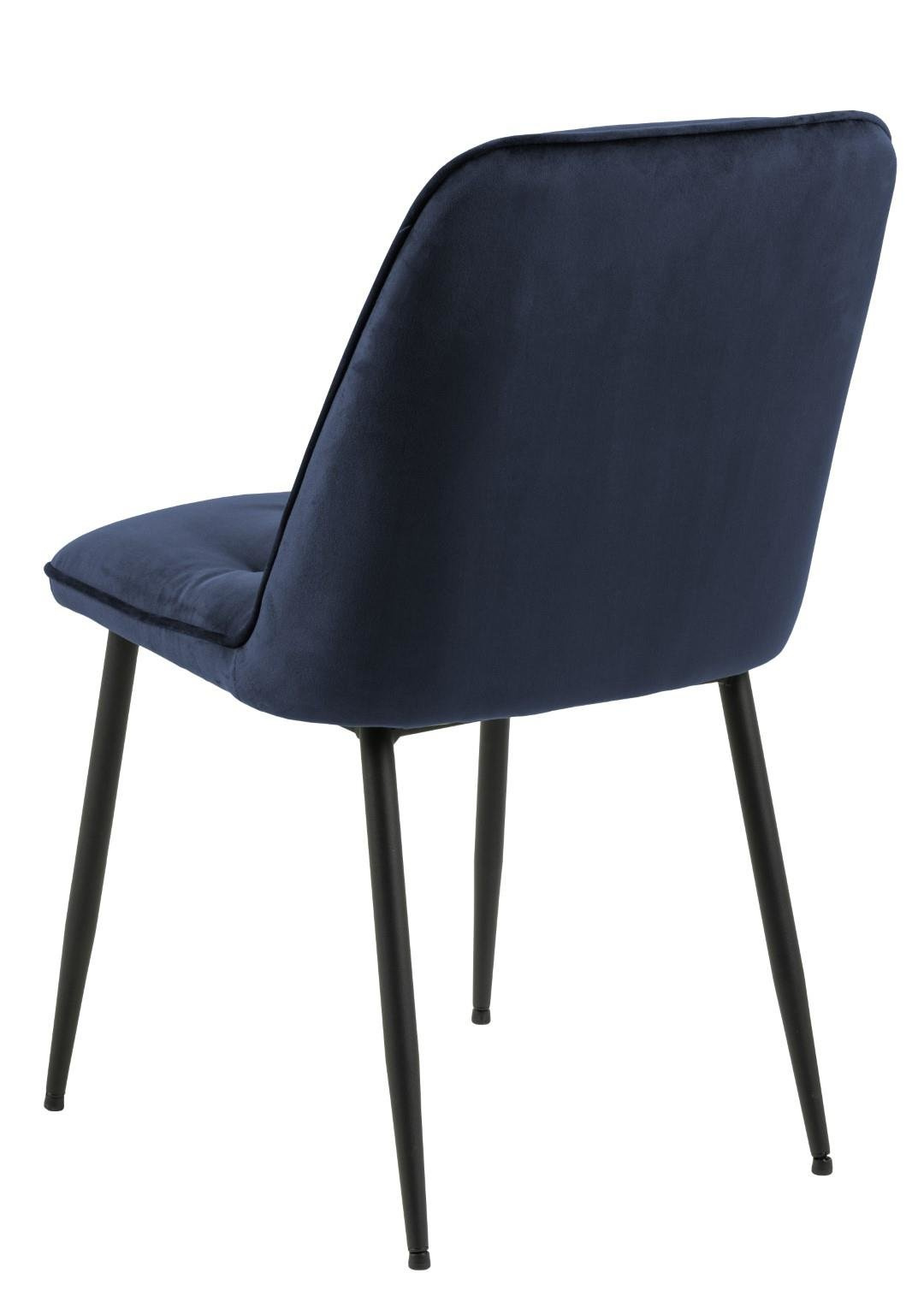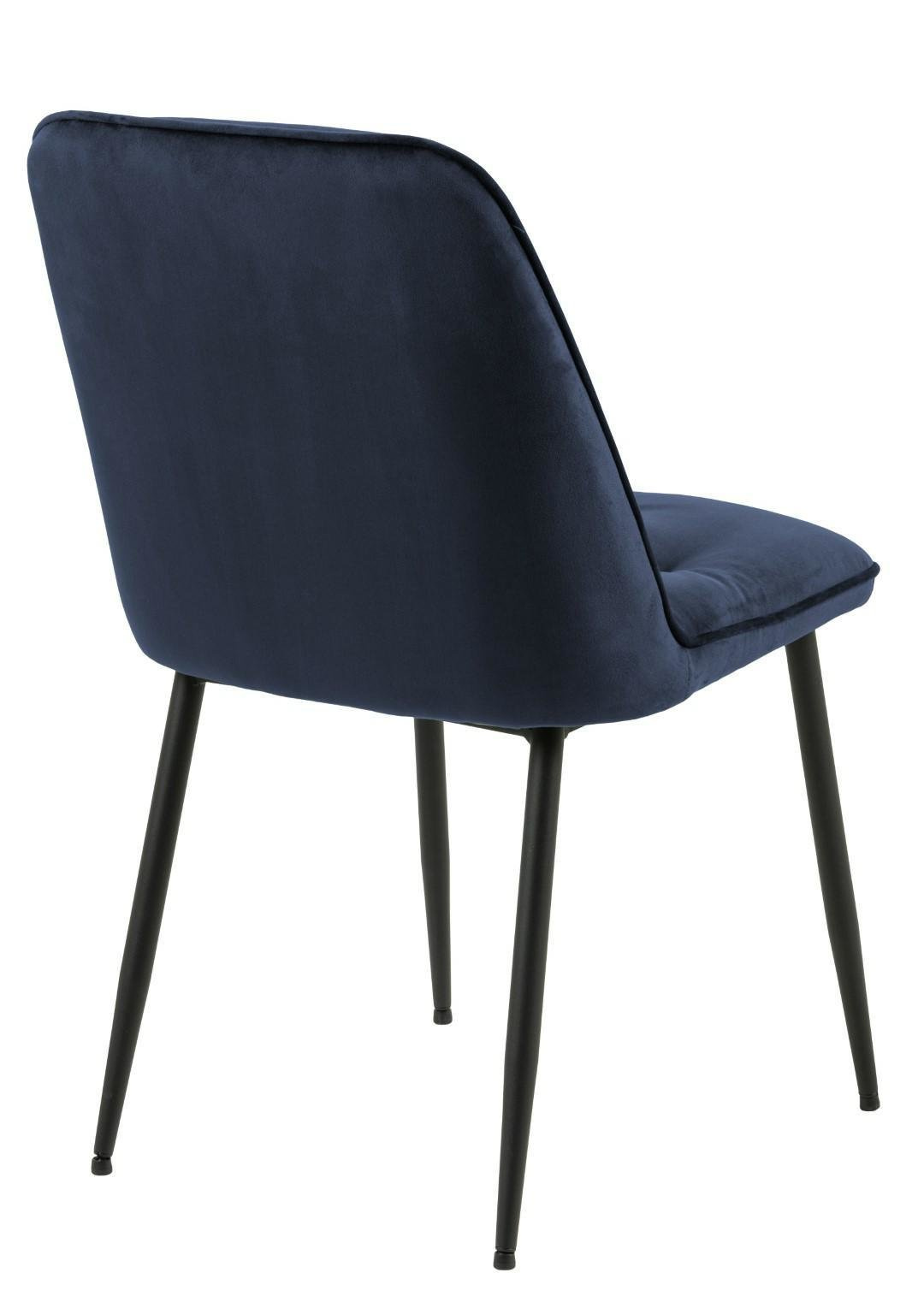 Krzesło Brooke standard jest krzesłem tapicerowanym miękką welwetową tkaniną Vic fabric midnight blue 77AC FR. Krzesło posiada wygodne oparcie, które zostało ozdobione pikowaniem dodającym mu stylu. Podstawą krzesła są malowane proszkowo na czarno metalowe nogi. Maksymalne obciążenie: 120 kg.