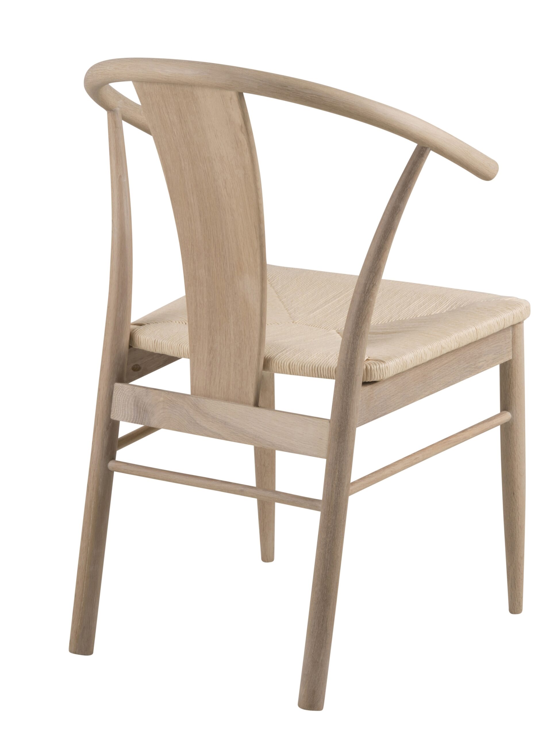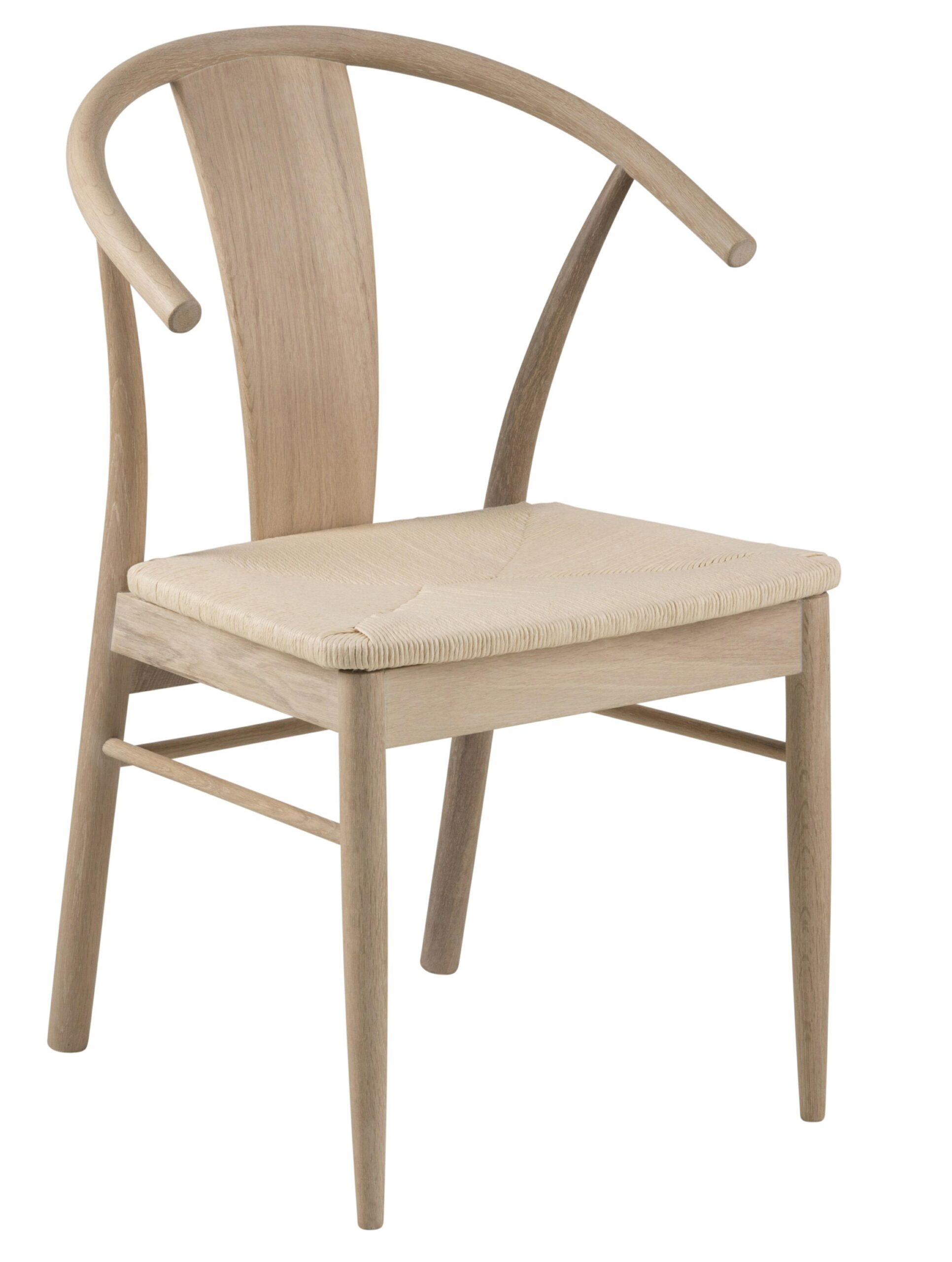 Krzesło Janik wykonane jest z drewna dębowego w kolorze naturalnym. Siedzisko pokryte jest plecionką z papieru w kolorze naturalnym. Krzesło posiada także wyodne podłokietniki, które połączone są w jeden element z oparciem. Krzesło opiera się na czterech nóżkach zwężających się delikatnie ku dołowi. Krzesło pasuje idealnie do wnętrz w stylu skandynawskim.