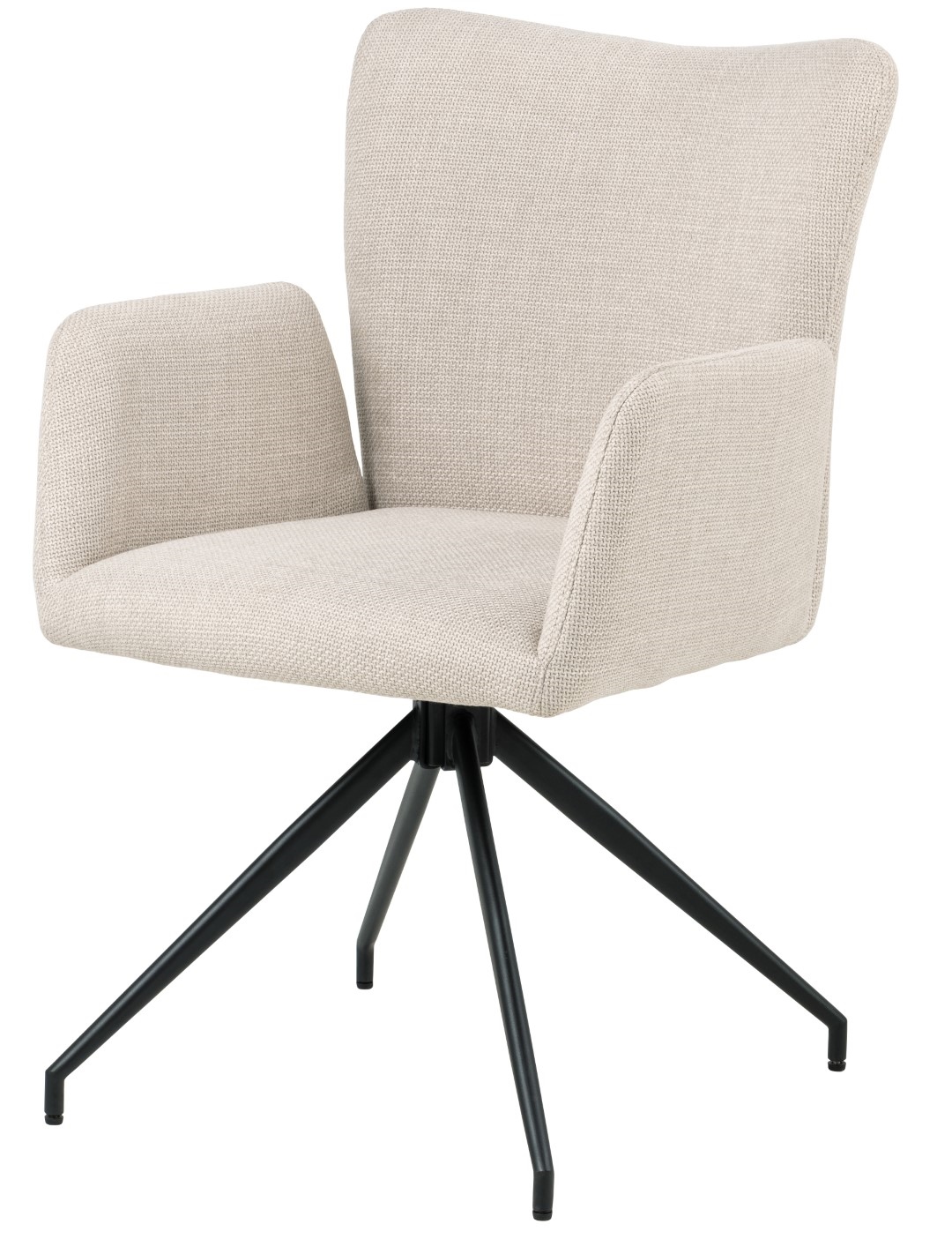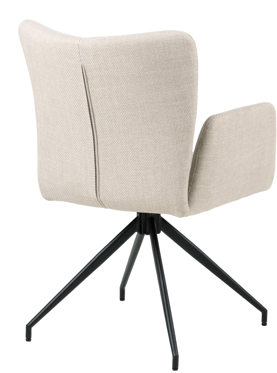 Krzesło Laura nadaje się do sali konferencyjnej, jadalni, a nawet nowoczesnej restauracji. Jest odpowiednio wyprofilowane, aby zapewnić najwyższy poziom komfortu. Posiada wygodne, wysokie podłokietniki. Jego podstawę stanowią cztery nogi malowane proszkowo na czarny kolor w matowym wykończeniu. Górna część krzesła wypełniona jest pianką poliuretanową i tapicerowana tkaniną Basel fabric beige 24. Krzesło posiada funkcję obrotu. Ilość kartonów: 1 Wymiary kartonów: 57,5x66x59cm Waga kartonów: 11,7kg