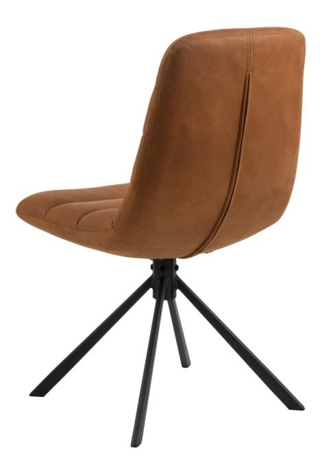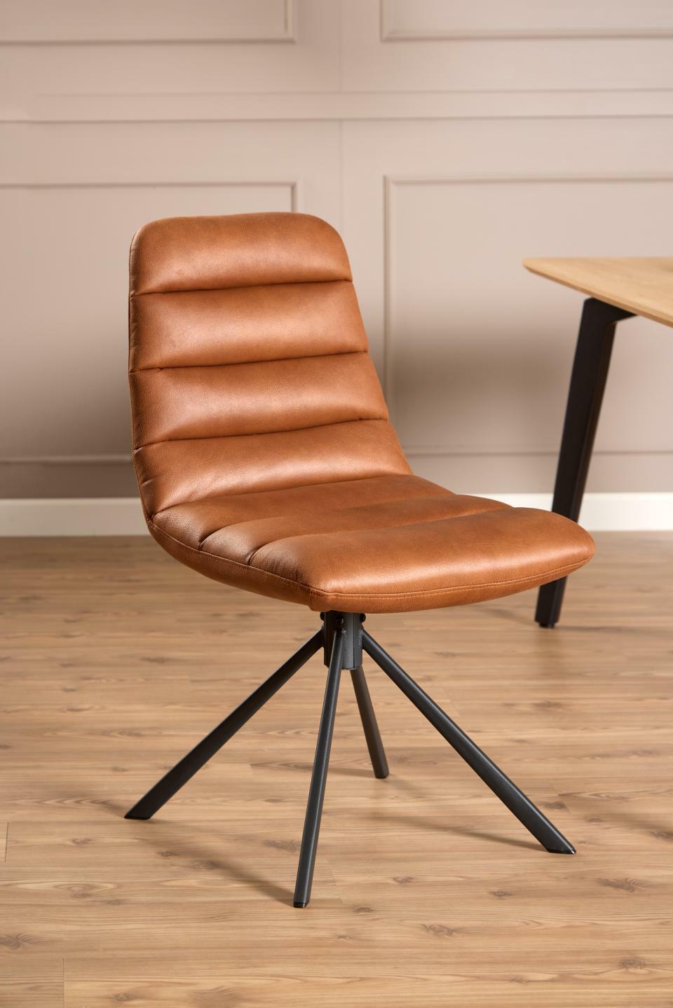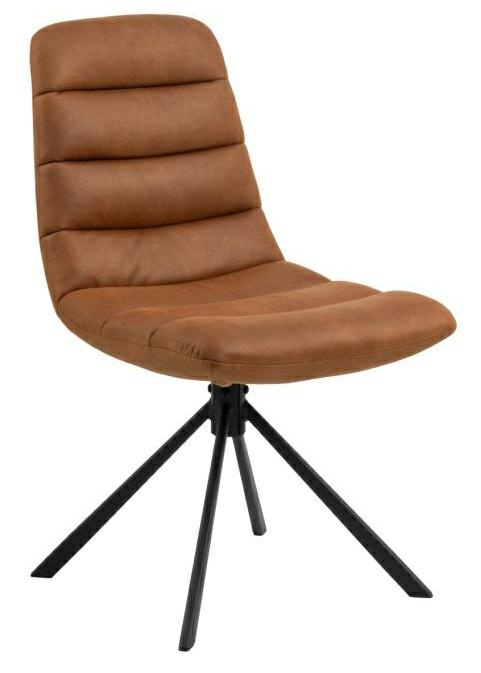 To krzesło do jadalni, charakteryzujące się fakturą i nowoczesnym stylem, wyróżnia się zakrzywionym i lekko obszernym siedziskiem z poziomymi przeszyciami, które nadają mu puszysty wygląd i podkreślają jego przytulny charakter. Jeśli chodzi o styl i funkcjonalność, krzesło spełnia wszystkie wymagania dzięki skórzanemu pokrowcowi w kolorze brandy i czarnej, 4-ramiennej, obrotowej podstawie.