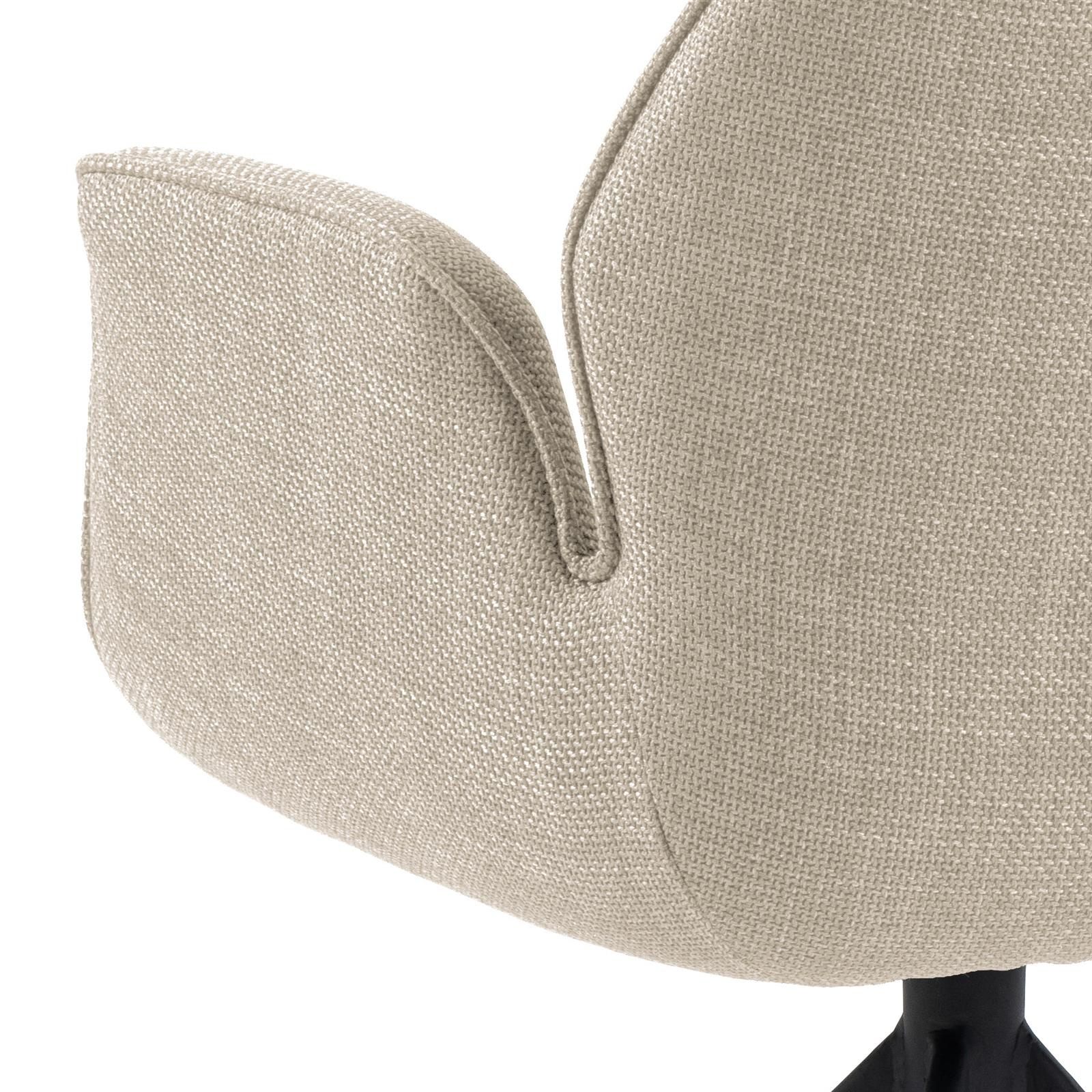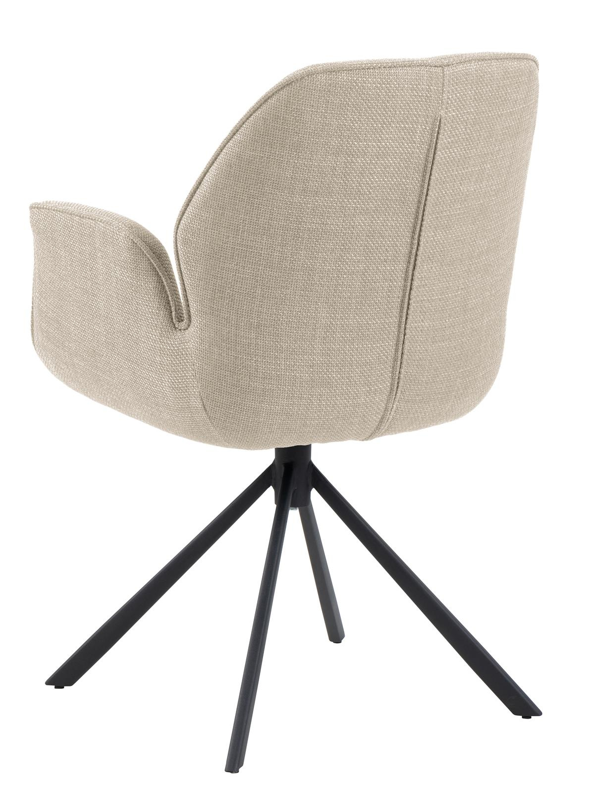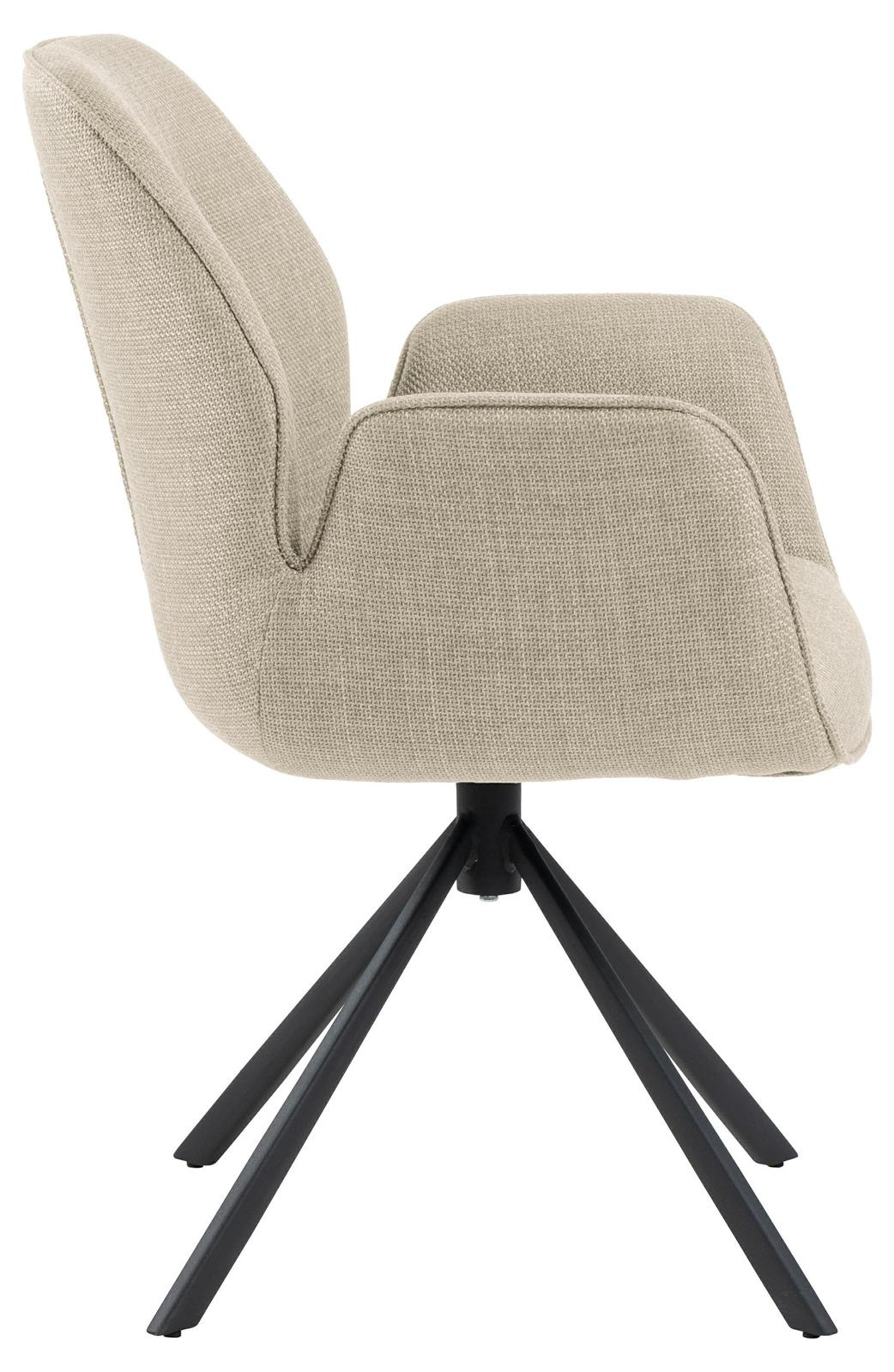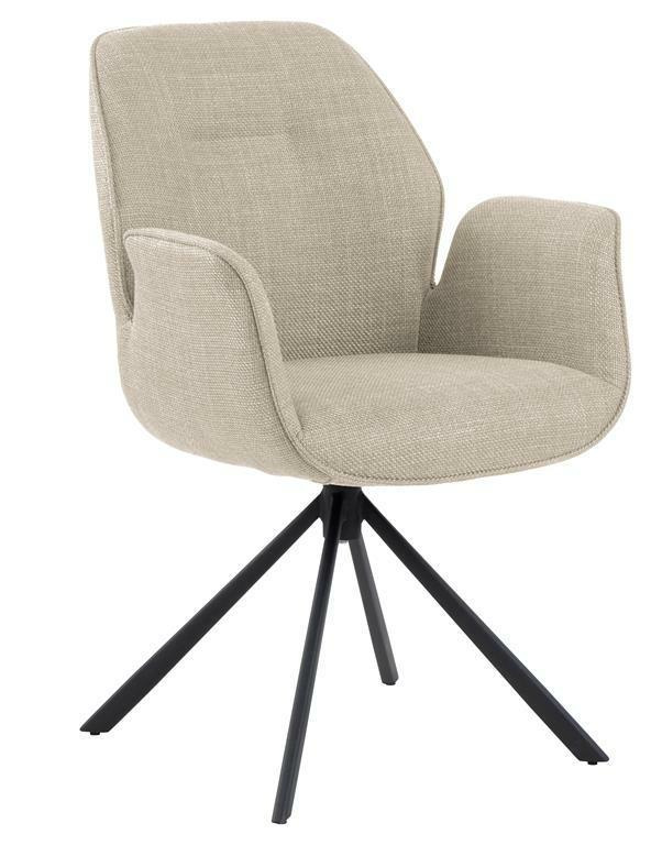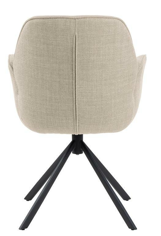 Krzesło obrotowe z podłokietnikami Aura posiada charakterystyczną sylwetkę i cechuje się nowoczesną elegancją. To krzesło do jadalni jest idealne do każdego nowoczesnego domu. Siedzisko tapicerowane jest beżową tkaniną o eleganckim wyglądzie. Aby jeszcze bardziej podkreślić nowoczesny wygląd przy projektowaniu wykorzystano czarną metalową podstawę w kształcie 4 ramiennej gwiazdy. Co ważne podstawa ma funkcję obrotową.