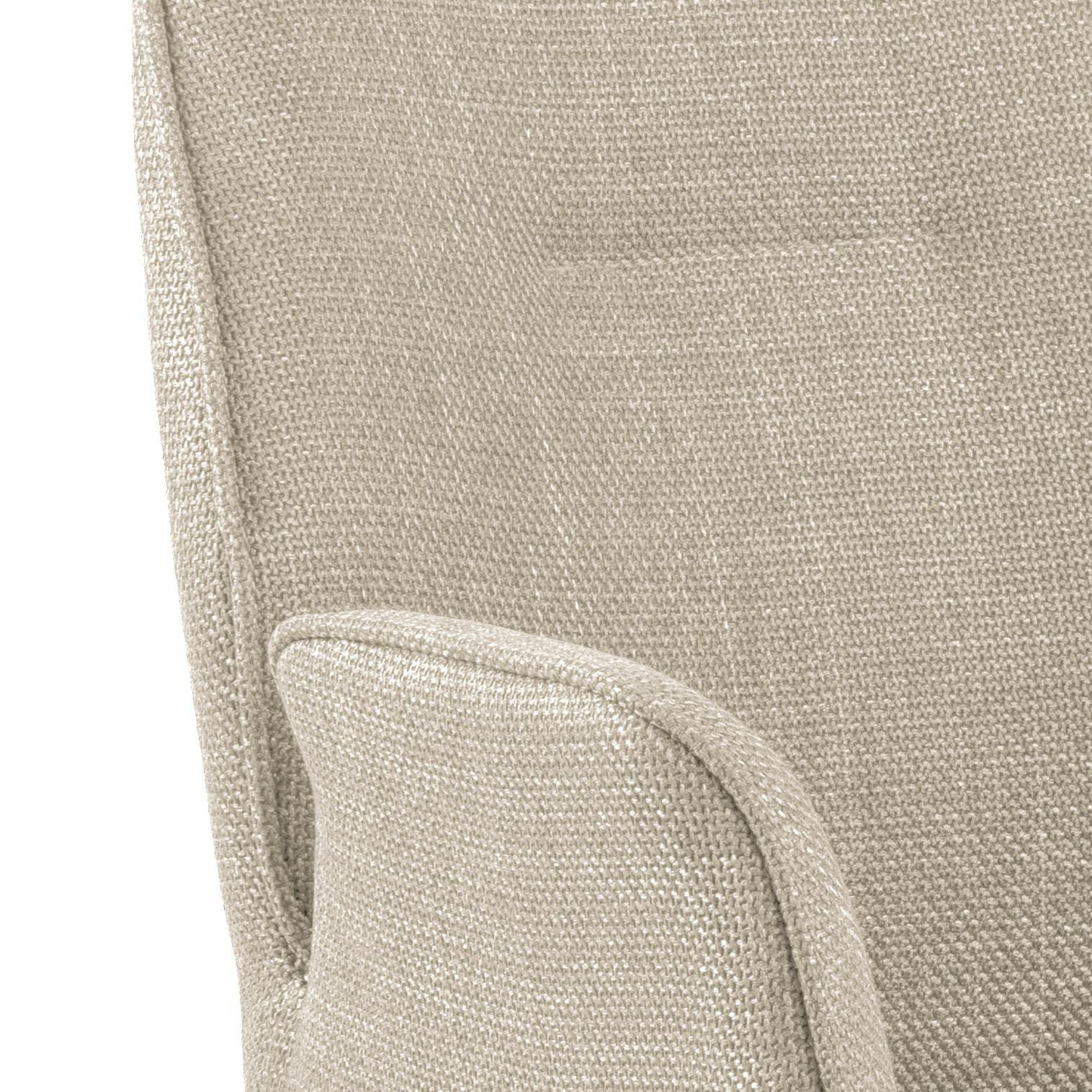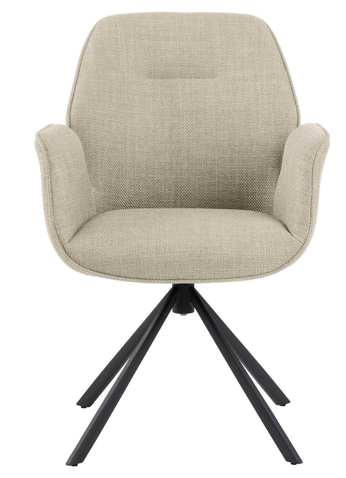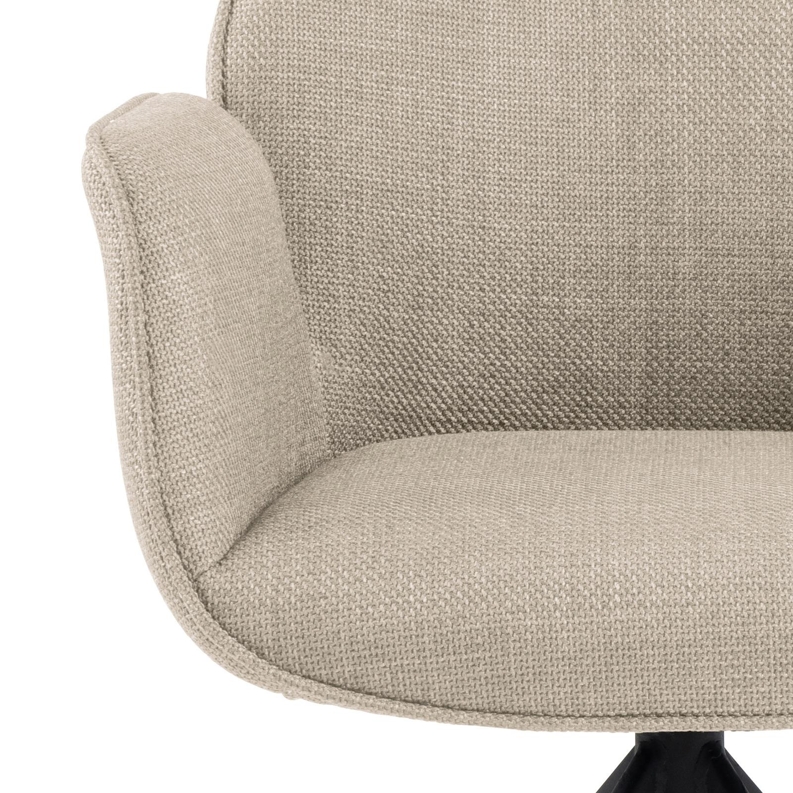 Krzesło obrotowe z podłokietnikami Aura posiada charakterystyczną sylwetkę i cechuje się nowoczesną elegancją. To krzesło do jadalni jest idealne do każdego nowoczesnego domu. Siedzisko tapicerowane jest beżową tkaniną o eleganckim wyglądzie. Aby jeszcze bardziej podkreślić nowoczesny wygląd przy projektowaniu wykorzystano czarną metalową podstawę w kształcie 4 ramiennej gwiazdy. Co ważne podstawa ma funkcję obrotową.