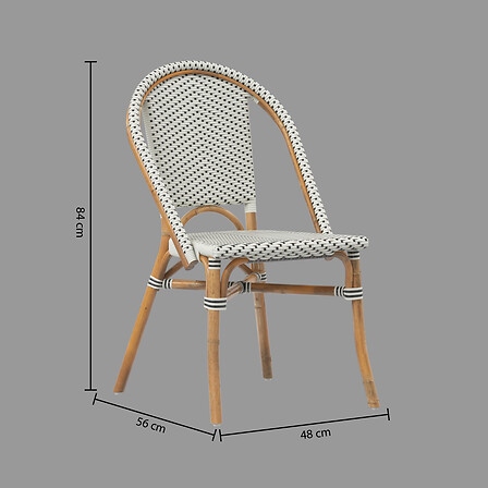 Wykonane z syntetycznej plecionki przypominającej rattan na siedzisku i oparciu oraz drewnianych rattanowych nóg. Max. obciążenie krzesła 110kg. Nie wymaga montażu Krzesło sztapluje się w stosy do 4 krzeseł Waga krzesła 3,67kg