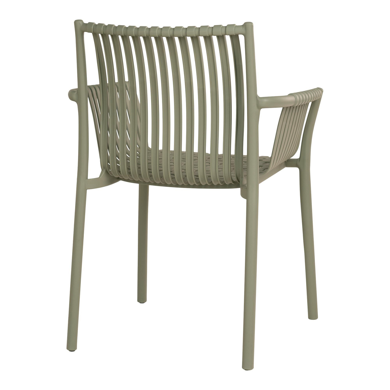 Krzesło z tworzywa sztucznego z podłokietnikami sprawdzi się w ogrodzie, na balkonie lub tarasie. Modne krzesło w szałwiowym kolorze wykonane z pasów z plastiku doda eleganckiego wyglądu. Komfortowe, wyprofilowane siedzisko gwarantuje podparcie lędźwi.