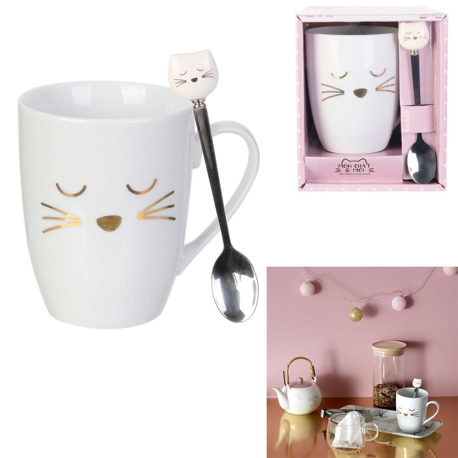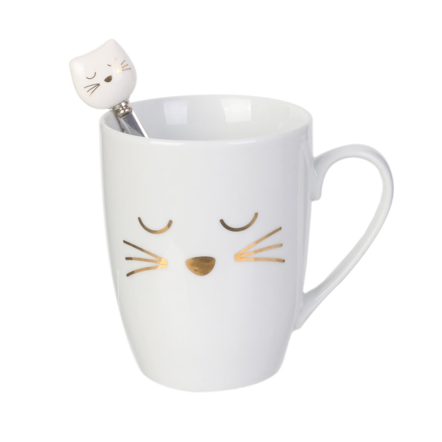 Ceramiczny kubek z łyżeczką o pojemności 350ml osłodzi każde śniadanie. Kubek ze złotymi ozdobami imitującymi pyszczek kota w zestawie posiada metalową łyżeczkę zakończoną porcelanową główką kota. Kobek i łyżeczka dzięki wspólnemu elementowi tworzą ciekawy komplet. Kubek zapakowany został w ozdobne pudełko, które sprawia, że jest on idealną propozycją na prezent dla nastolatki lub miłośnika kotów. Kubek można myć w zmywarce.