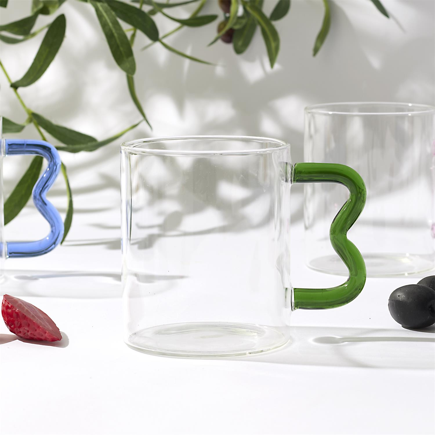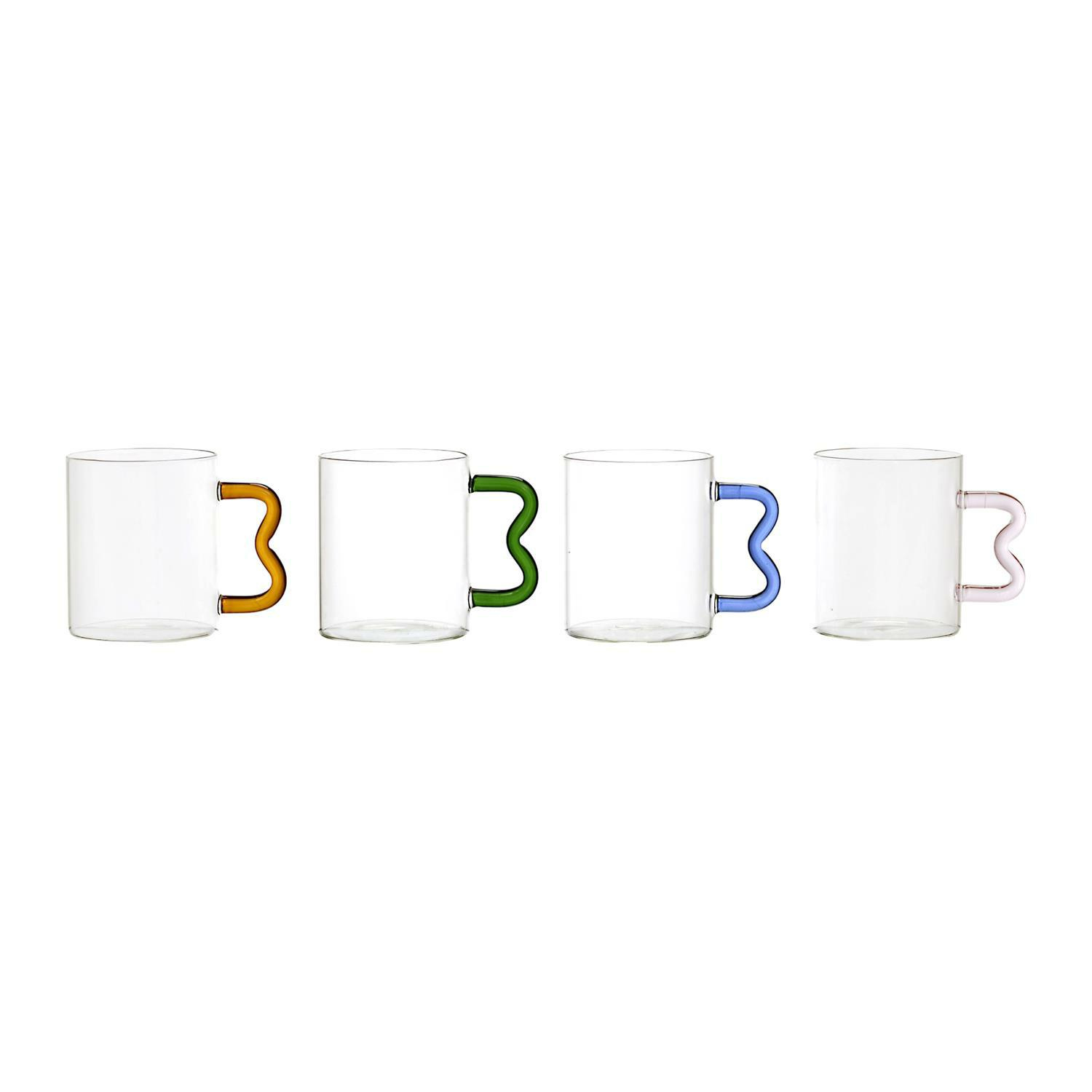 Szklany kubek ze szkła borowokrzemowego ozdobiony został uchem o niespotykanym kształcie. Dodatkowo kolor ucha idealnie współgra z czystą, transparentną szlaną pwoiechnią kubka. Pojemnośc 350 ml. Można myć w zmywarce, Można używać w mikrofalówce. Nie używać w piekarniku.