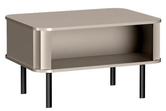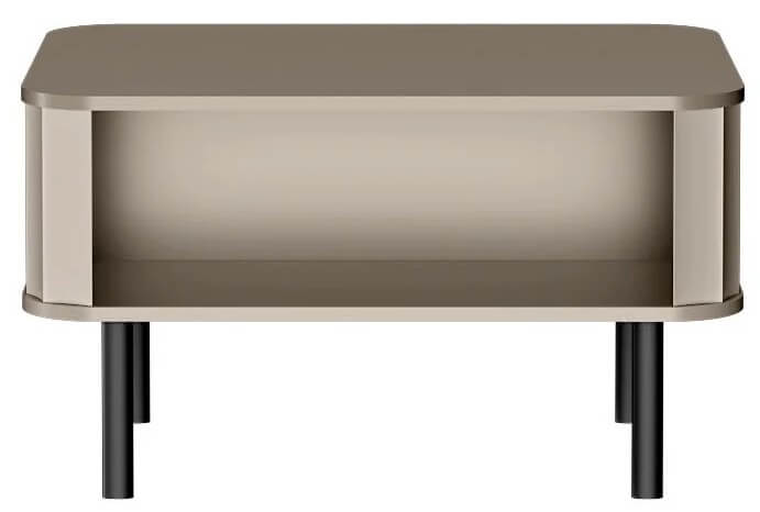 Model NOVADO-10 wyróżniają zaokrąglone krawędzie blatu, nadające całości miękkości oraz bezpieczeństwa w codziennym użytkowaniu. Ustawiony na smukłych, owalnych nogach, prezentuje się lekko, a jednocześnie stabilnie – bez zbędnej masywności. Dwie otwarte wnęki zlokalizowane po przeciwnych stronach ławy umożliwiają wygodne przechowywanie codziennych przedmiotów – takich jak piloty, czasopisma, książki czy podkładki – dzięki czemu blat może pozostać uporządkowany i czysty.