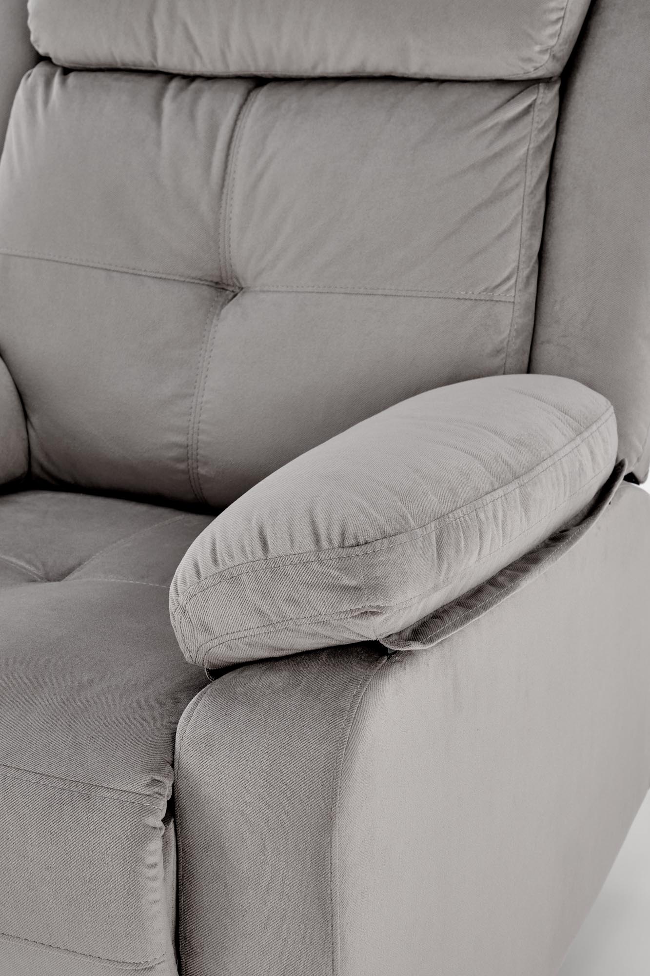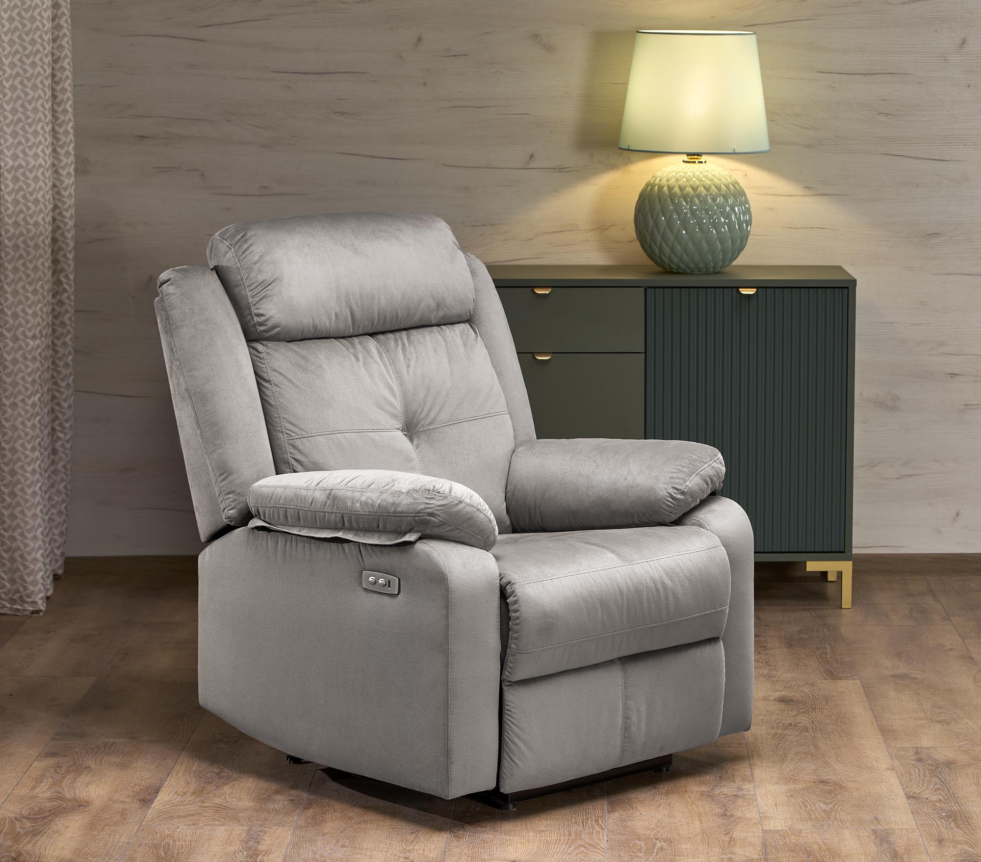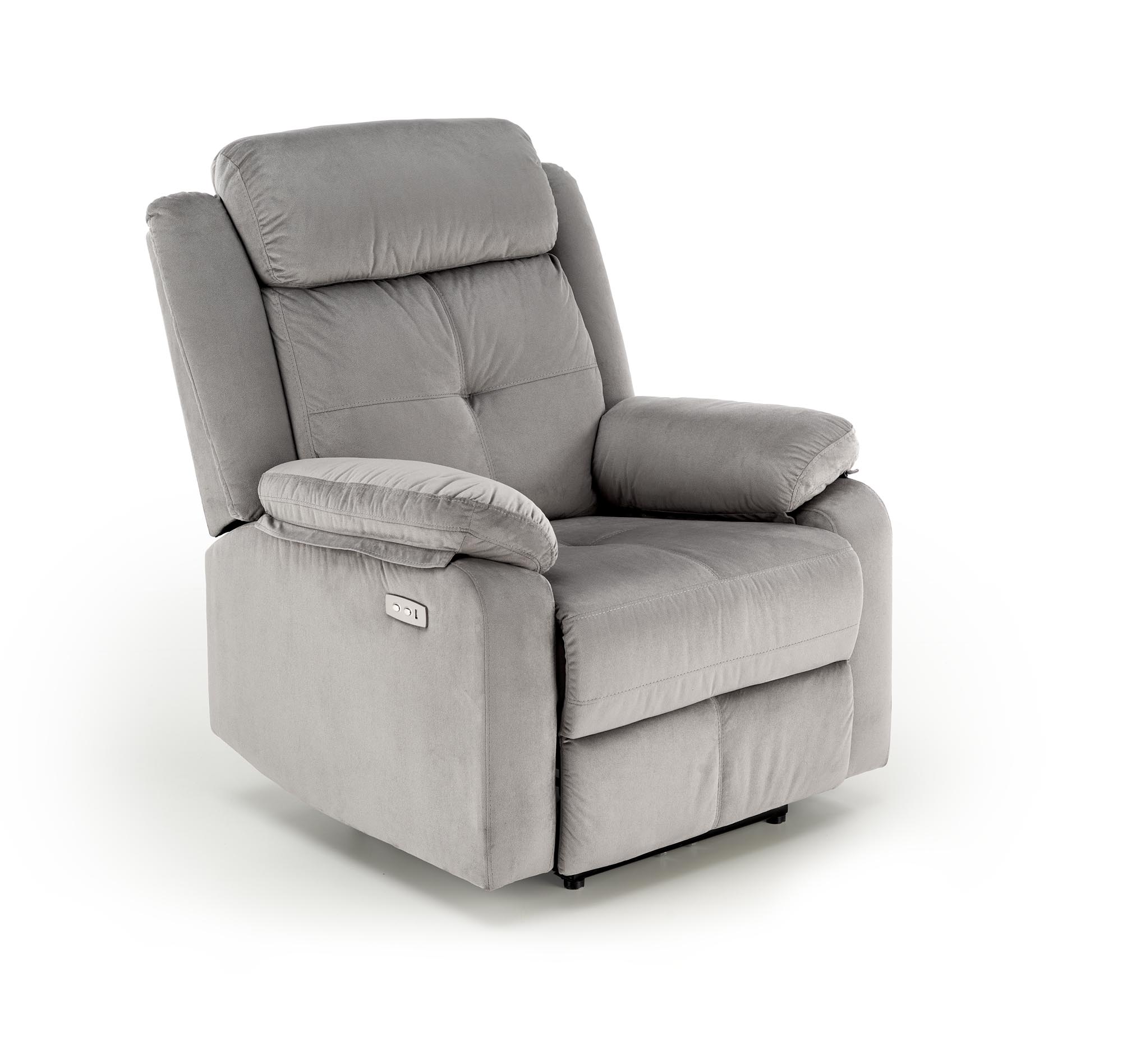 wymiary: 85/95-162/105/45 cm; fotel z funkcją elektrycznego rozkładania / gniazdo USB, materiał: tkanina, kolor popielaty