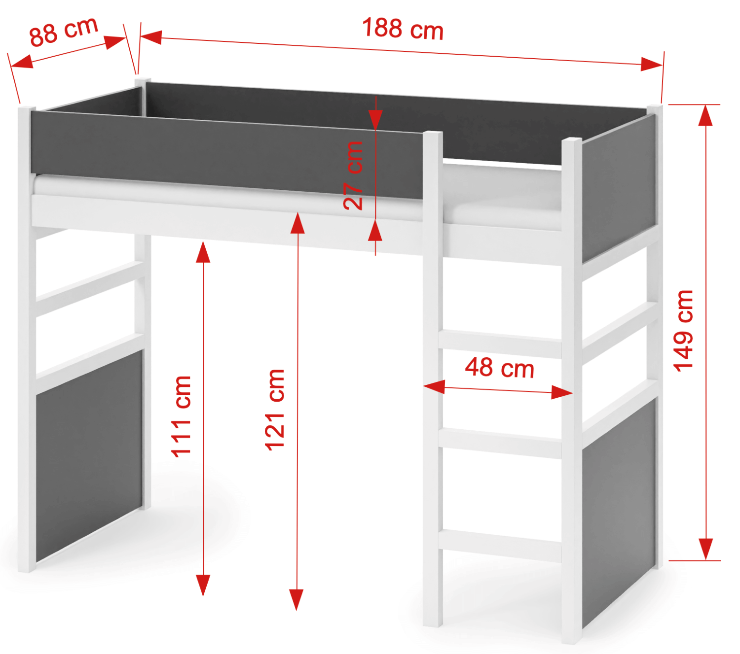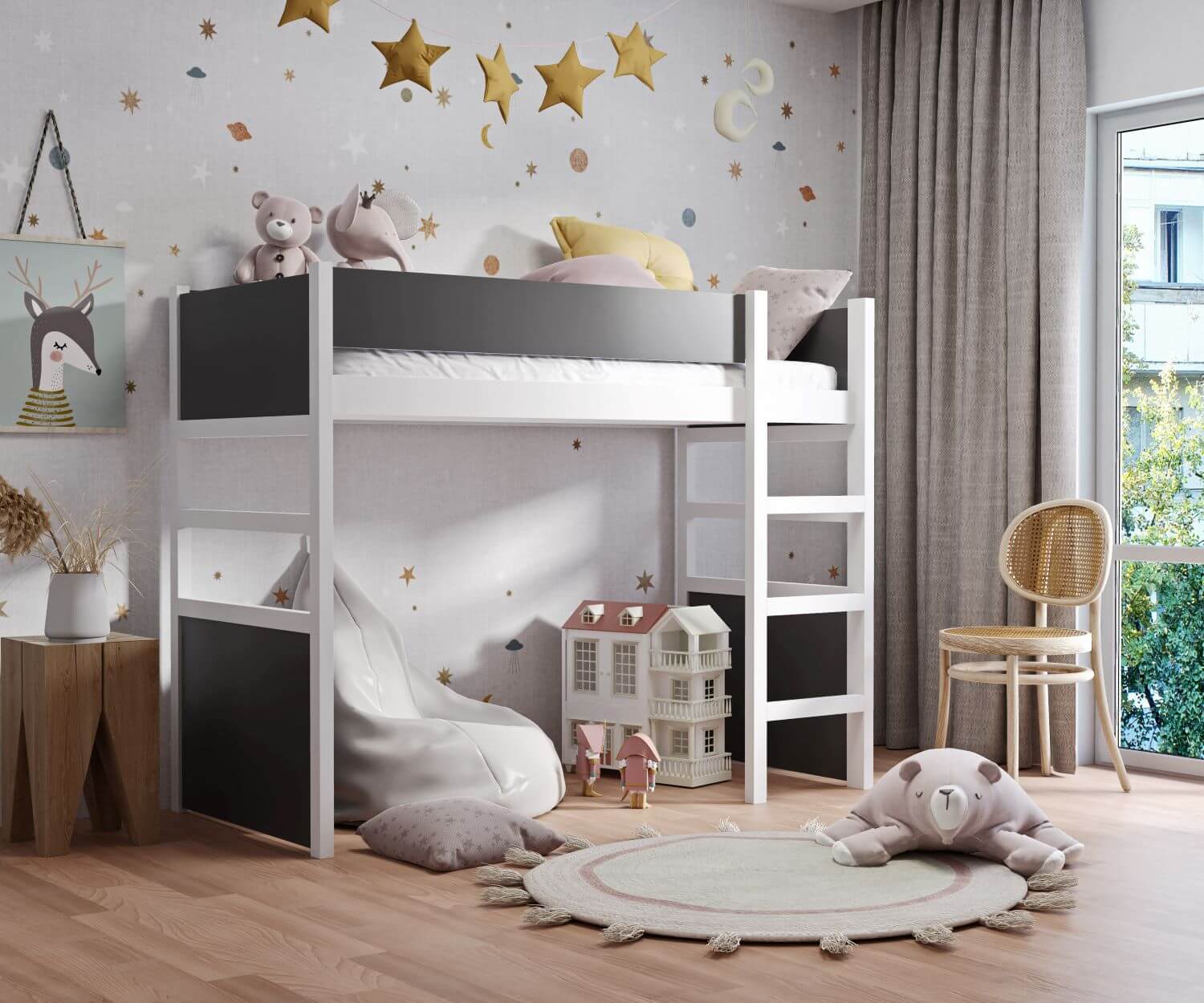 SAVANA to kolejna odsłona łóżka, którego konstrukcja tworzy antresolę. Rozwiązanie to pozwala nam w pełni wykorzystać miejsce w pokoju dziecka poprzez umieszczenie pod łóżkiem np. biurka lub pozostawienie tam wolnej przestrzeni na zabawę dla dziecka. Wykorzystanie elementów drewnianych tworzących ramę łóżka (kolor biały akryl) sprawia, że model ten z racji swojego przeznaczenia staje się bardziej bezpieczny podczas użytkowania, użycie natomiast płyty laminowanej (kolor antracyt) jako dodatku do konstrukcji daje nam więcej możliwości dopasowania łóżka do istniejącej już zabudowy meblowej w pokoju dziecka. Materac nie występuje w komplecie z łóżkiem, należy domówić go oddzielnie.