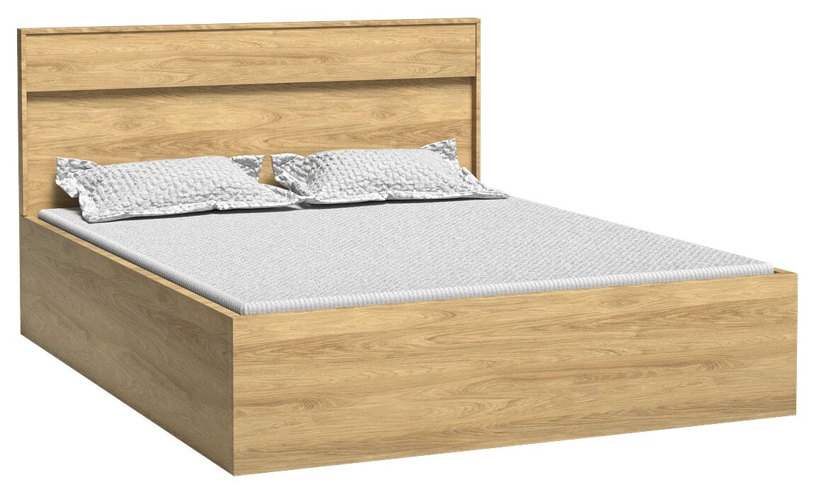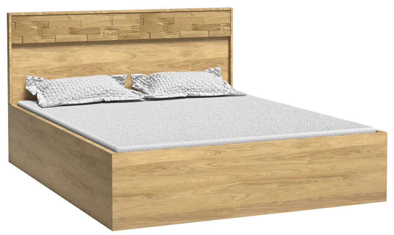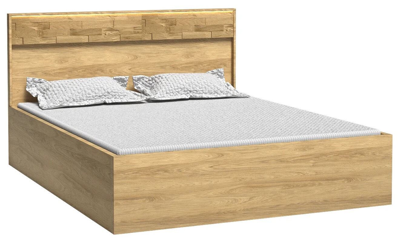 Łóżko z kolekcji MEDIOLAN pod materac w rozmiarze 140×200. Prosta bryła, wysoki zagłówek. W komplecie z pojemnikiem i stelażem. Pojemnik podnoszony na siłownikach gazowych. W opcji dodatkowej możliwość dodania dekoracyjnej, drewnianej deski wykonanej z dębu. Deska rzeźbiona w ciekawy, łupkowy wzór. Dodając oświetlenie w formie LEDów, sypialnia nabiera pięknego, ciepłego i przytulnego klimatu.