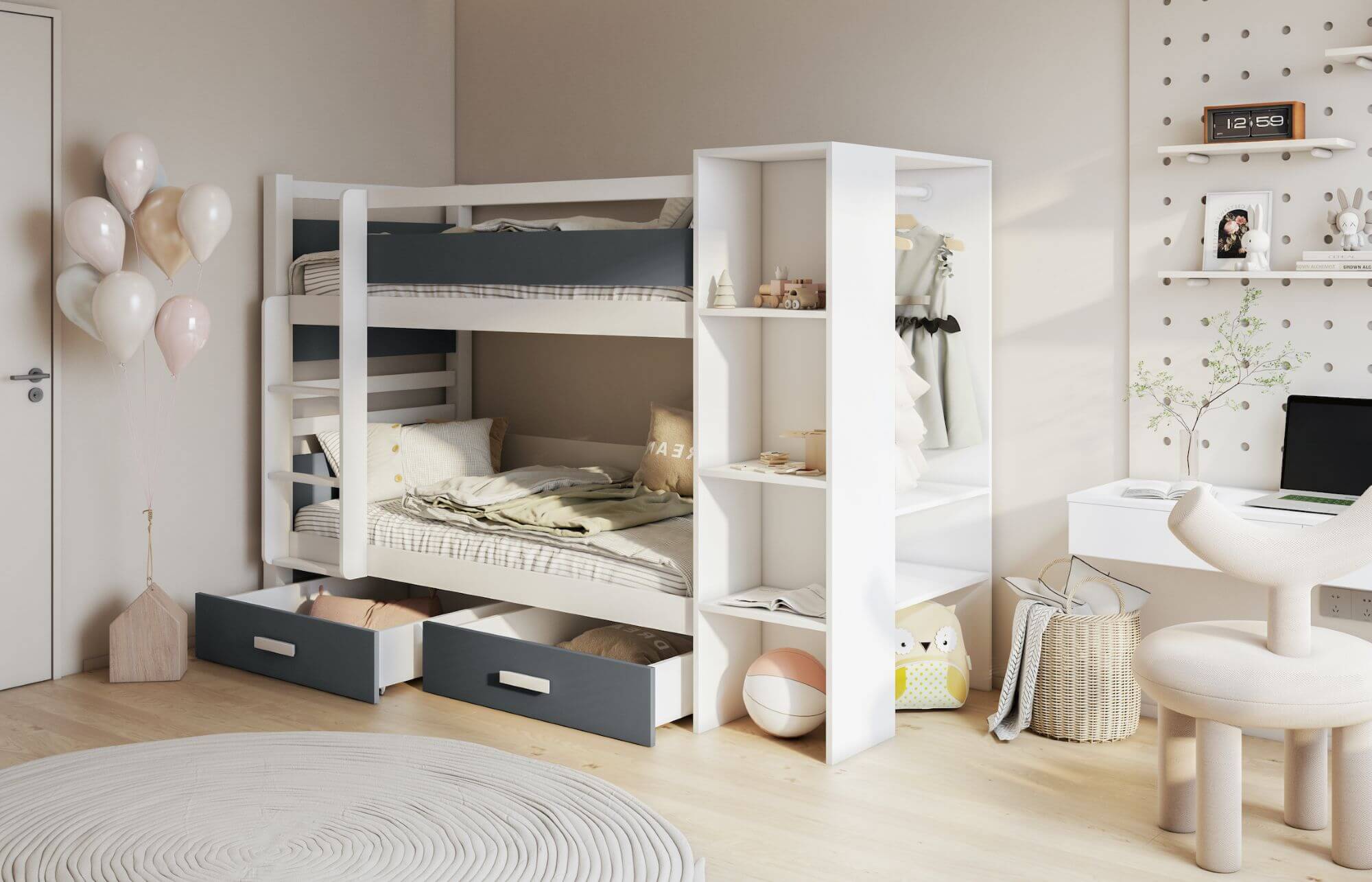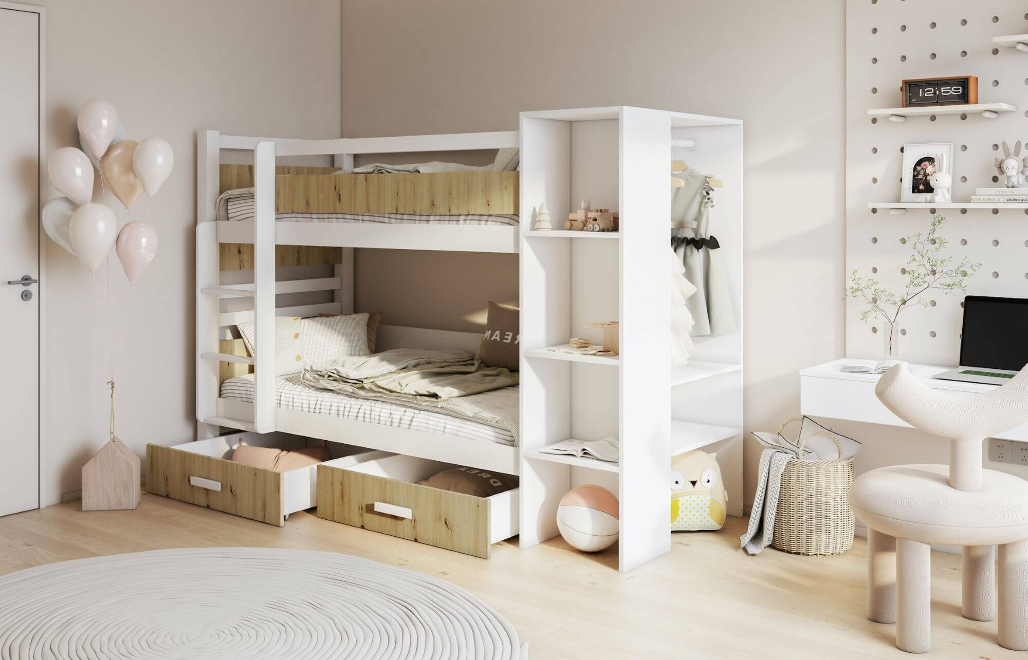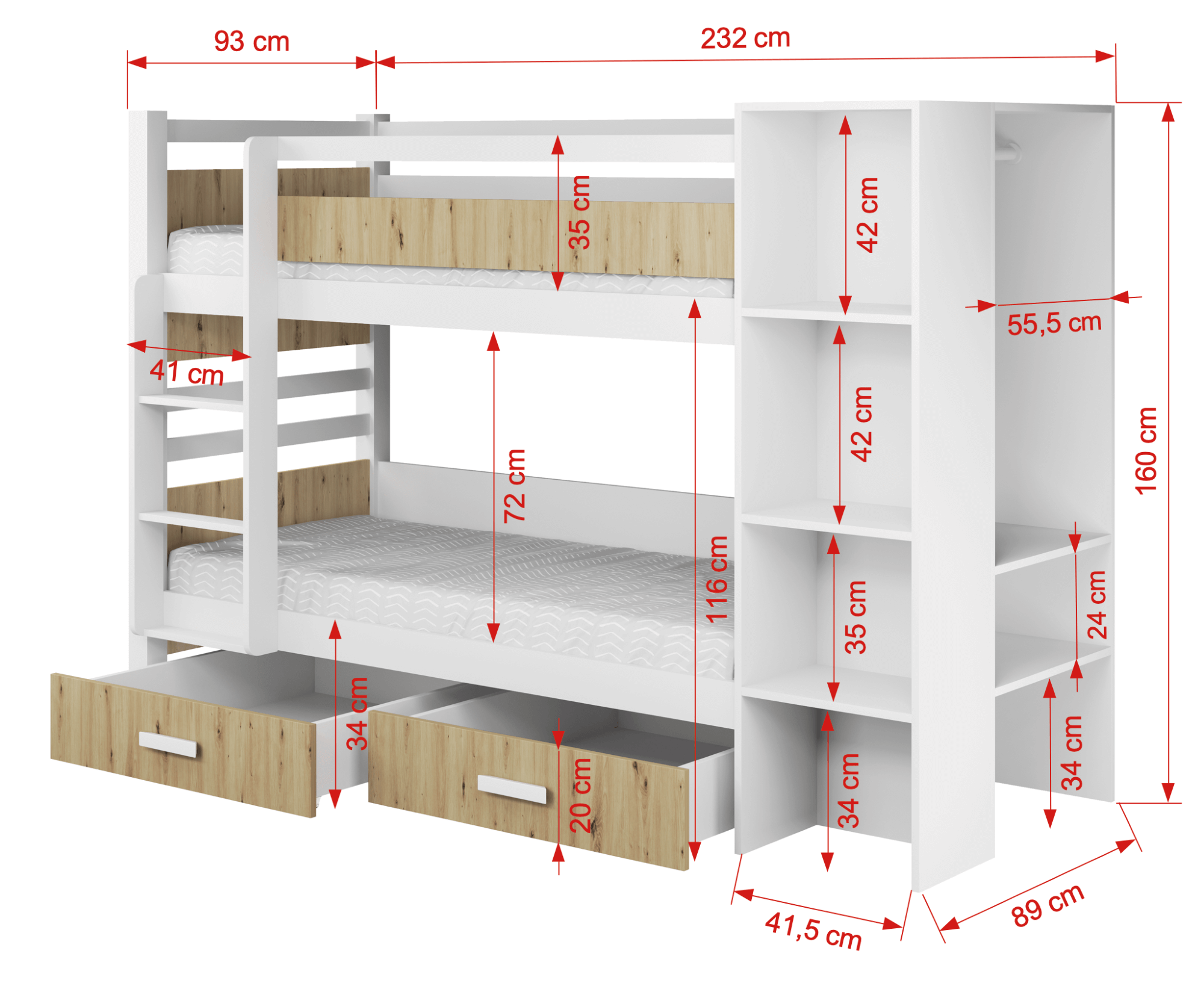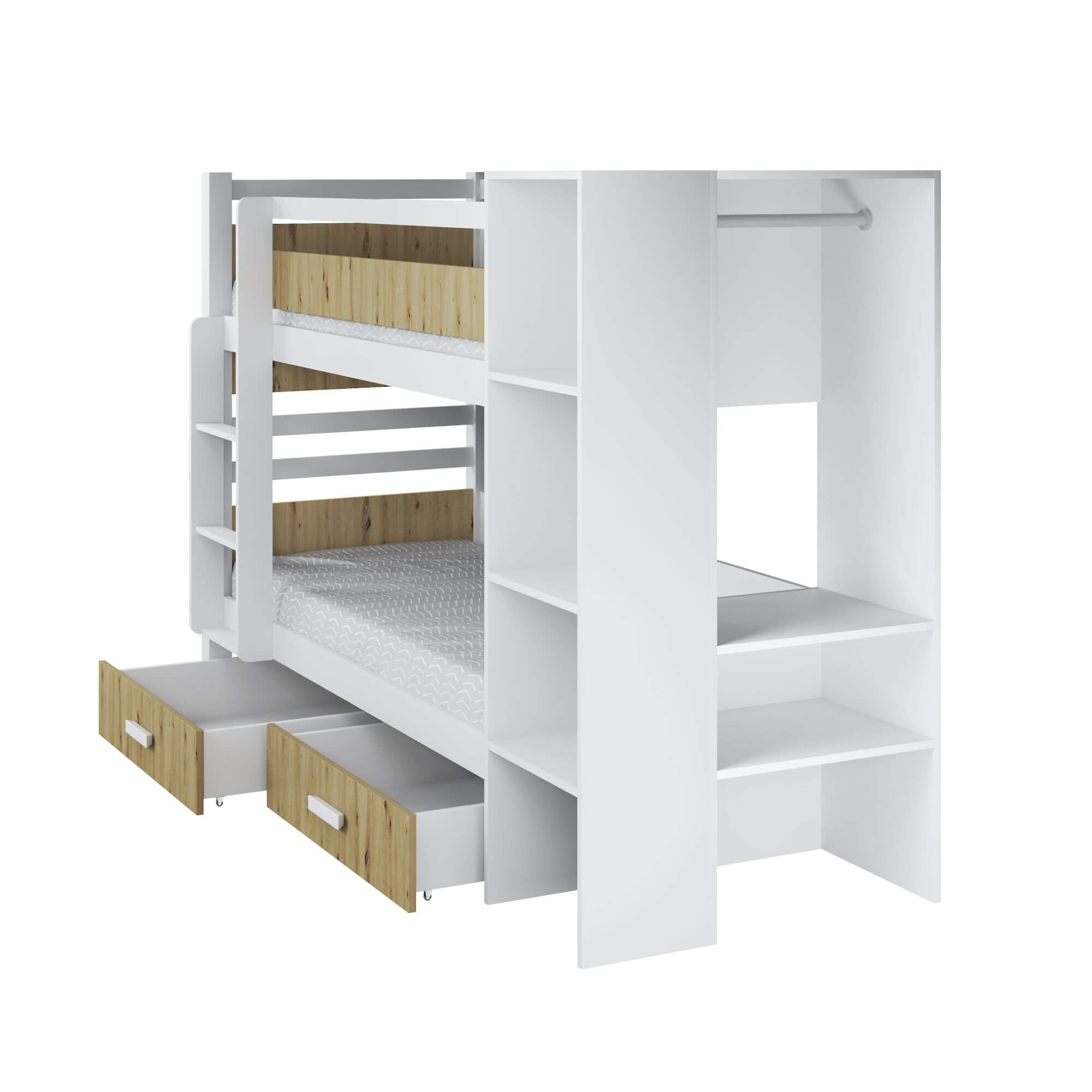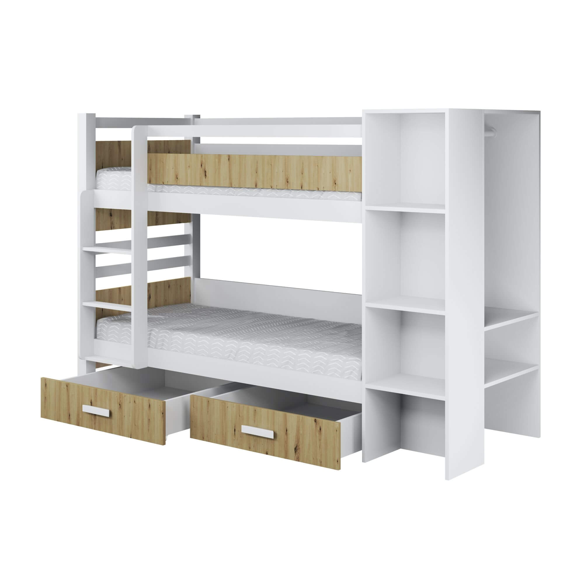 APOLLO – nowoczesny wygląd tego łóżka sprawia, że model ten dedykowany jest głównie dla młodzieży. Prosta forma daje możliwość idealnego dopasowania do każdego z współczesnych wnętrz. Łóżko to wykonane zostało w połączeniu drewna sosnowego w kolorze biały akryl z płytą laminowaną w kolorze dąb artisan (zdjęcie główne). Elementy konstrukcyjne łóżka takie jak nogi, drabinka, boki pomiędzy którymi leży materac od strony drabinki, wykonane są z odpowiednio selekcjonowanego drewna sosnowego natomiast regał został wykonany z płyty w kolorze białym. Projektant, tworząc ten model zadbał nie tylko o jego nowoczesny design, ale również o funkcjonalność, wplatając w konstrukcję łóżka regał. Takie rozwiązanie pozwoliło uzyskać bardzo wytrzymałą, oraz praktyczną w użytkowaniu konstrukcję. Dostępna kolorystyka poniżej. Materace nie występują w komplecie z łóżkiem, należy domówić je oddzielnie.