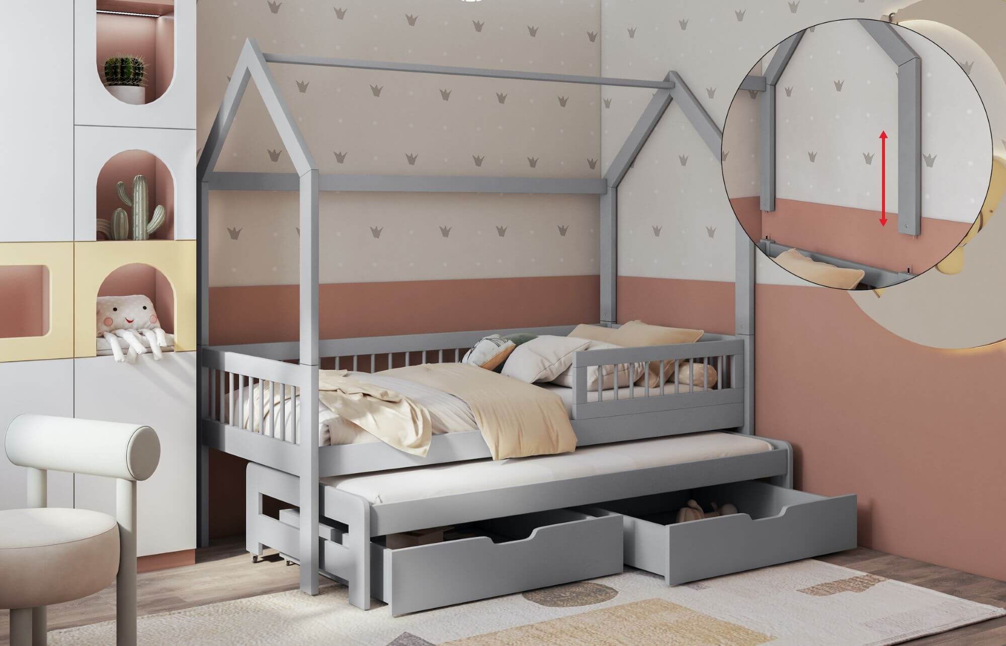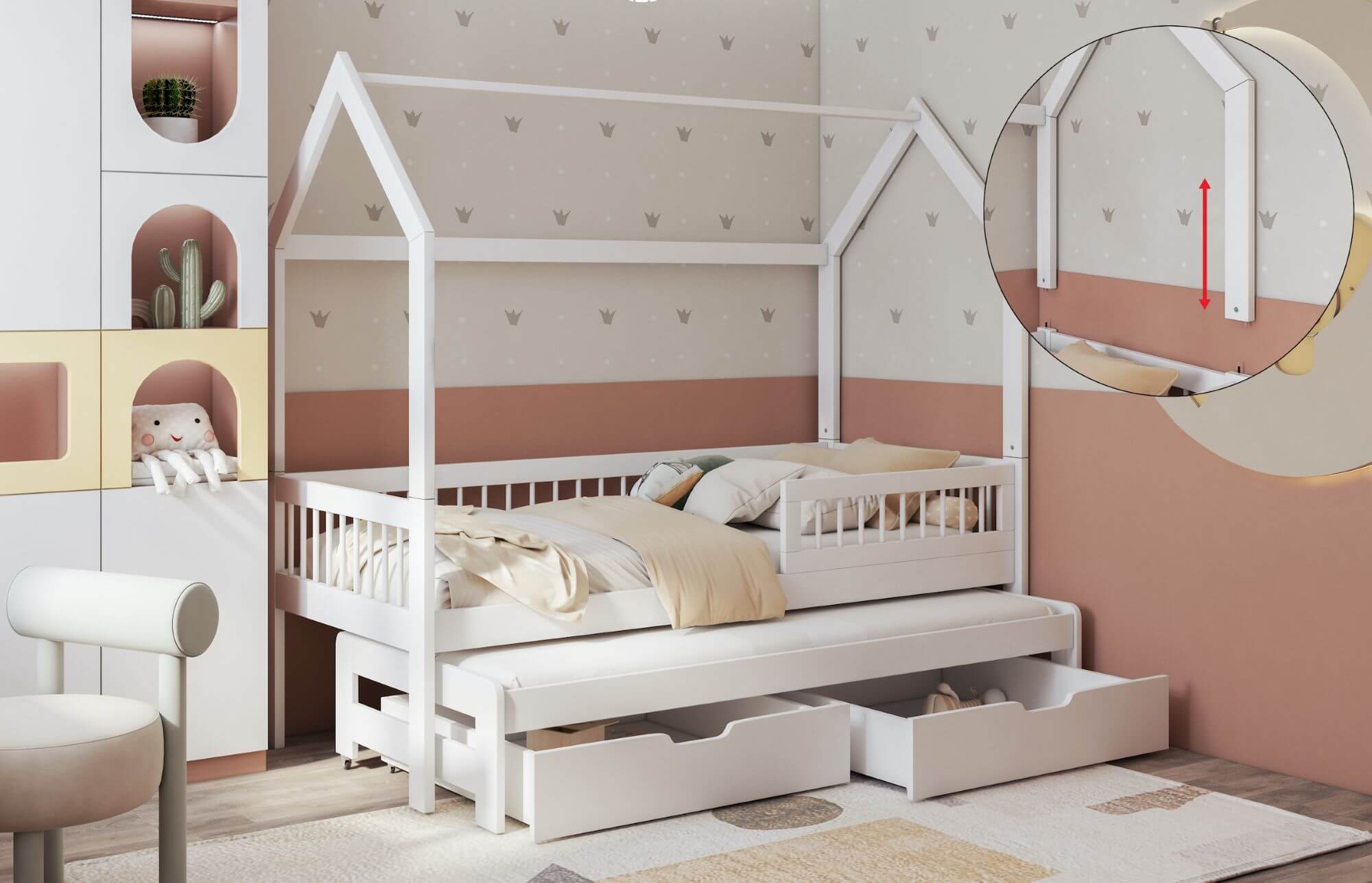ASHER II trwałe łóżko piętrowe niskie dla dwóch pociech w kształcie domku z możliwością demontażu górnej części łóżka (nadstawka w kształcie domku). Materace nie występują w komplecie z łóżkiem, należy domówić je oddzielnie. Dostępna kolorystyka poniżej.