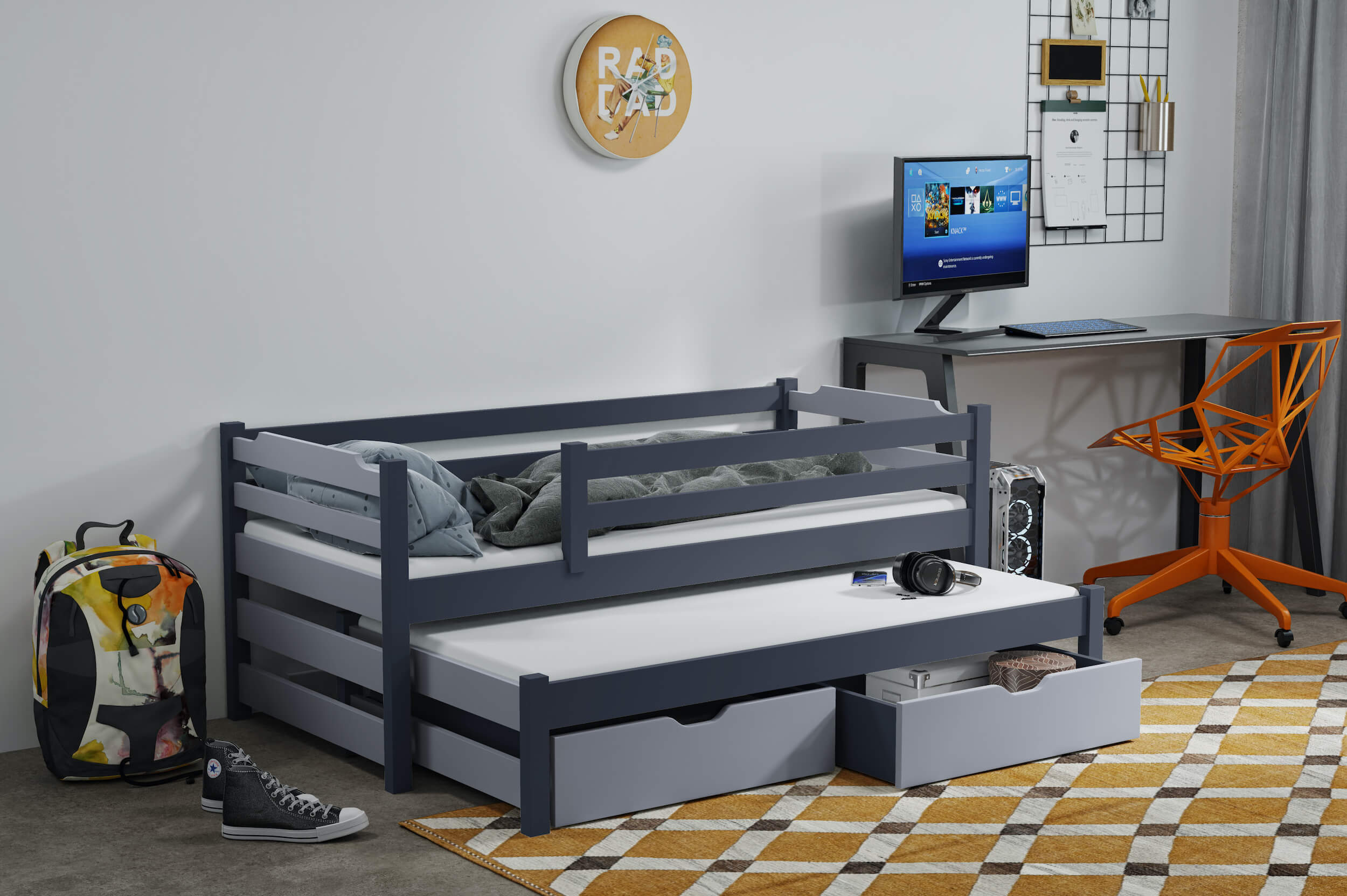 W skład zestawu wchodzi stelaż oraz 2 szuflady.