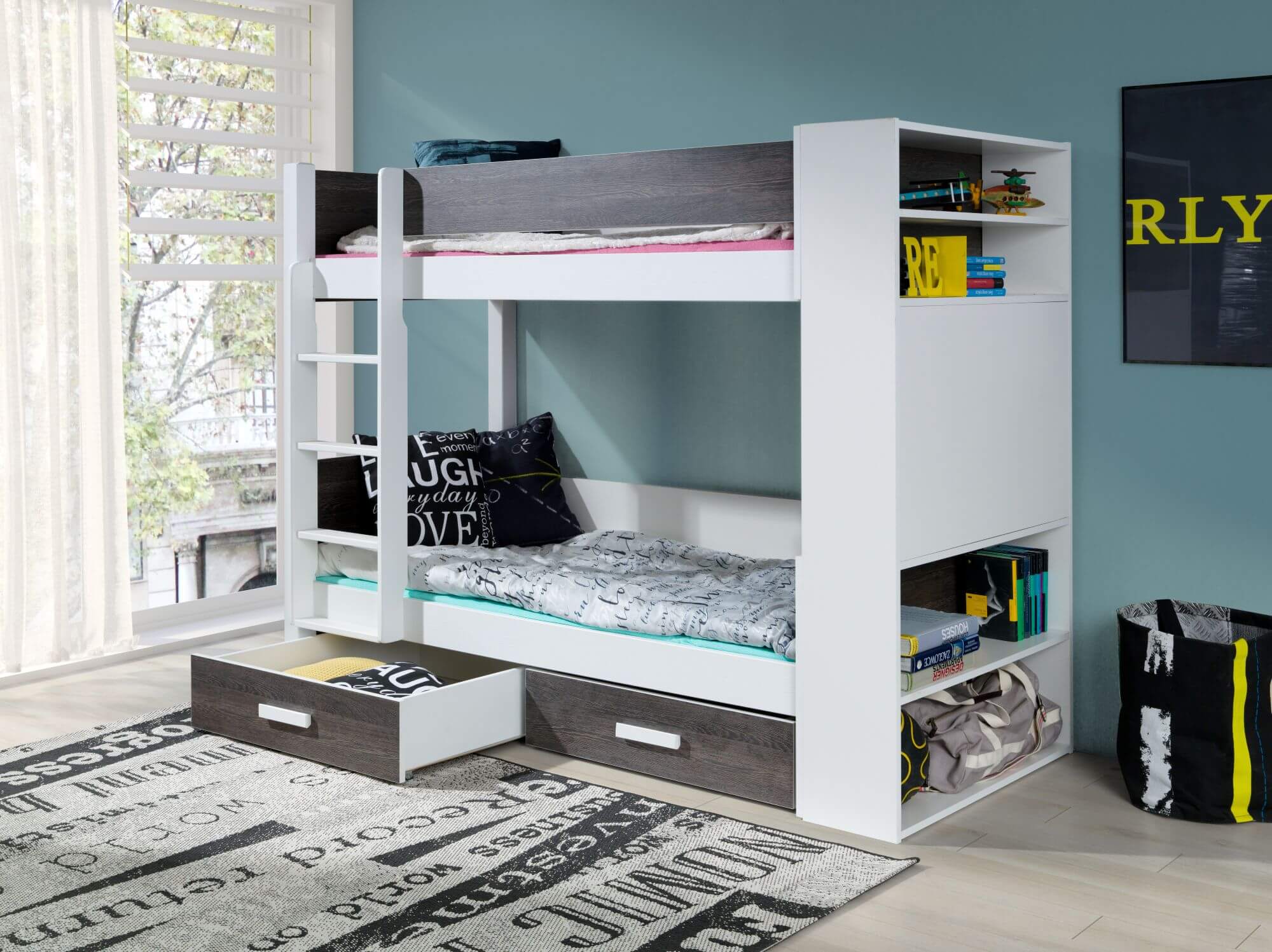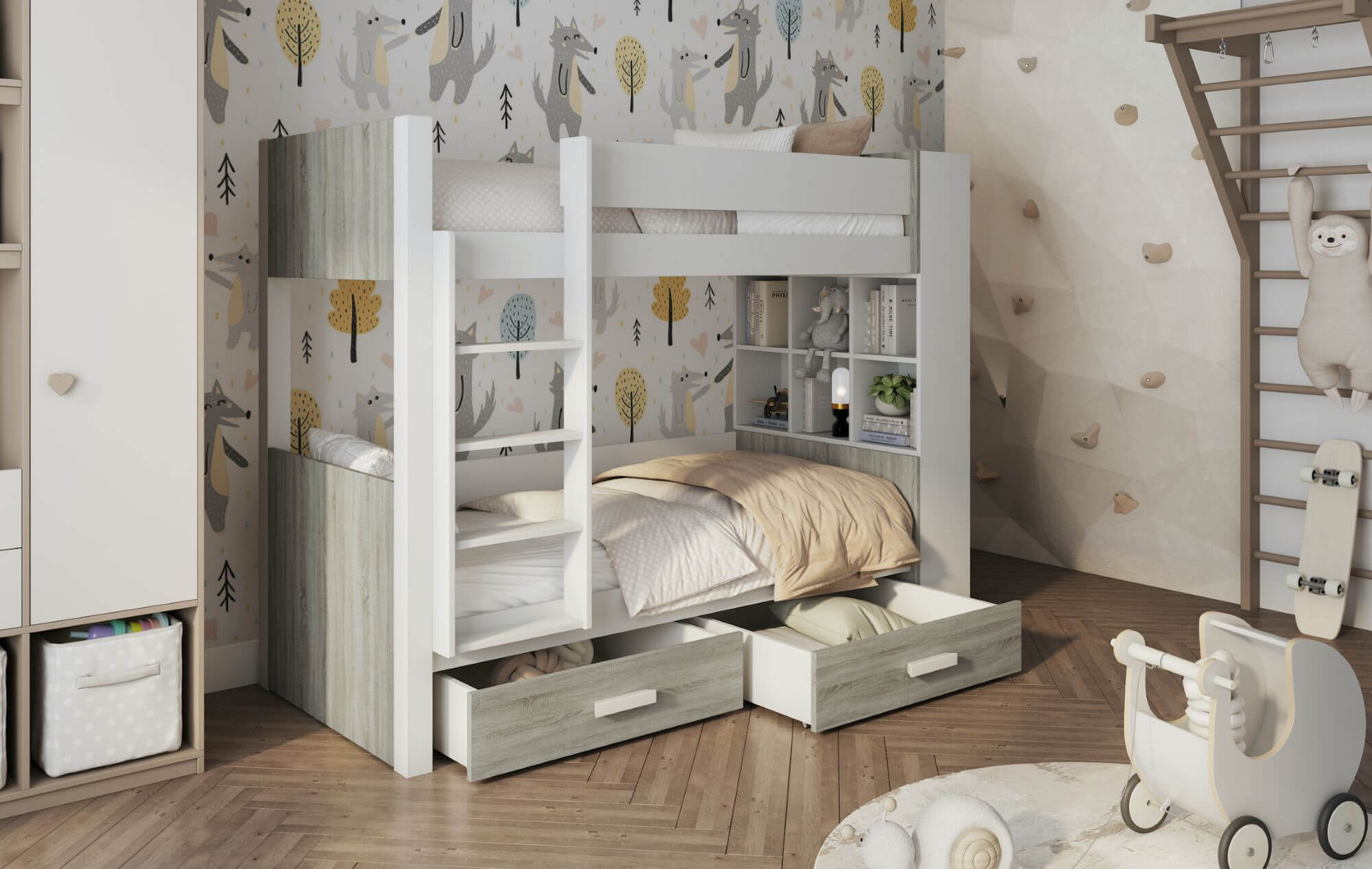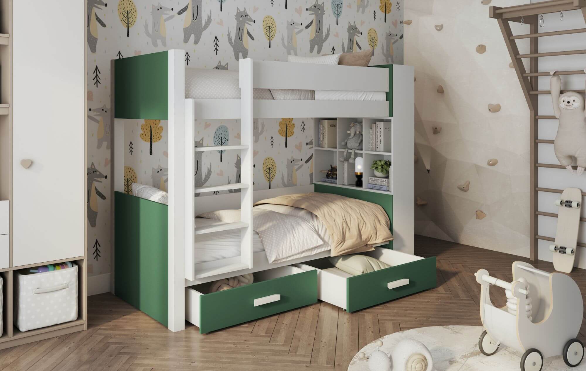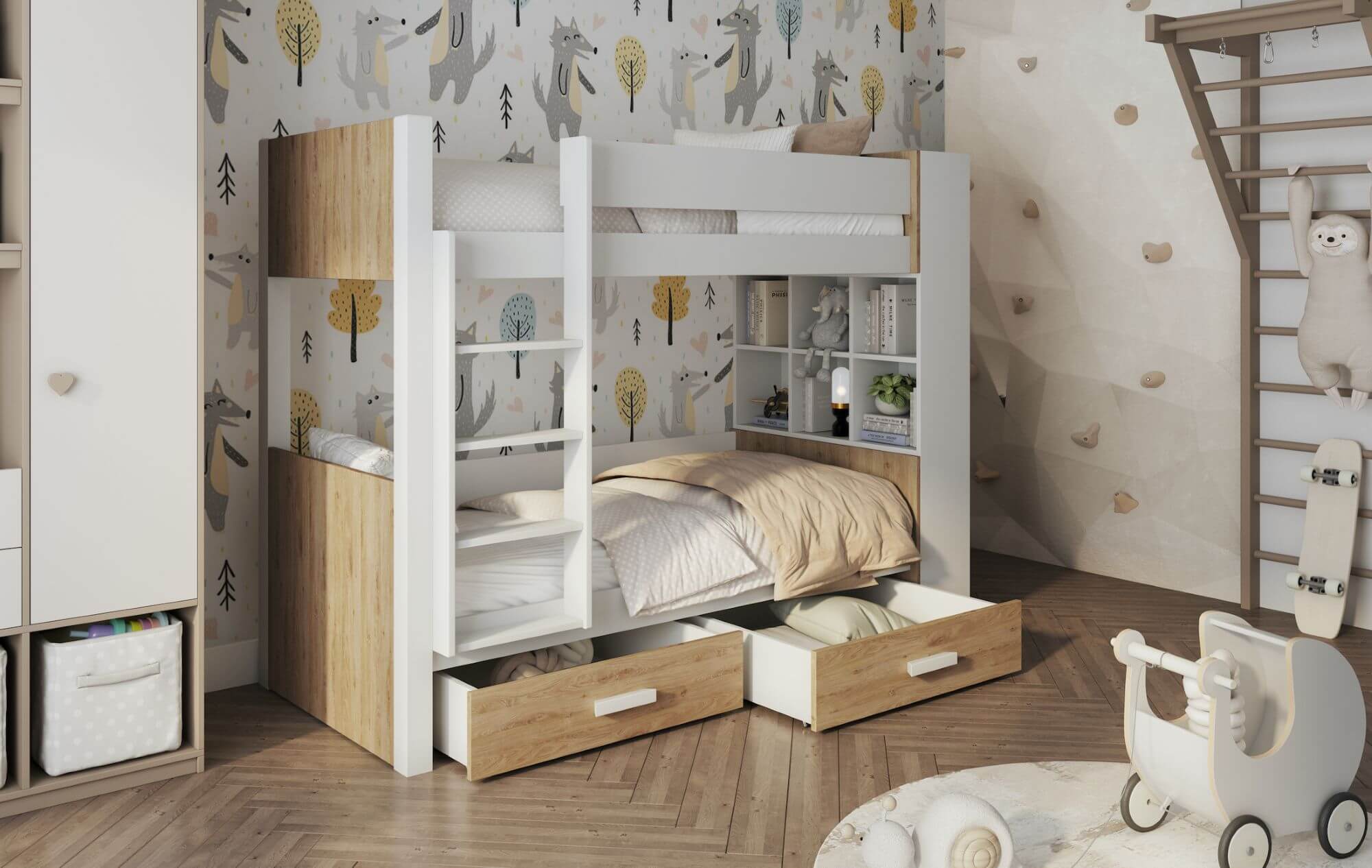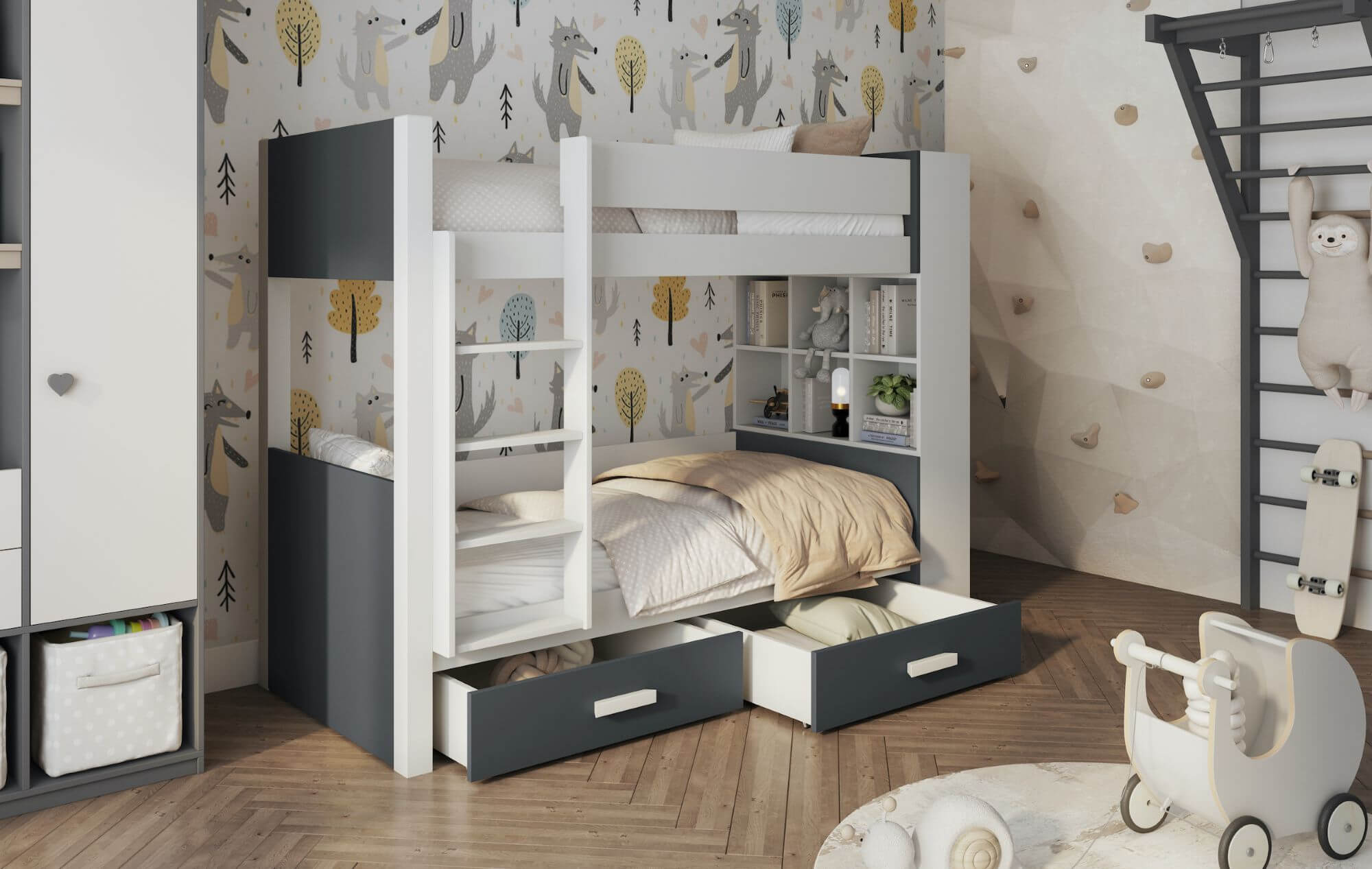 W skład zestawu wchodzi stelaż oraz 2 szuflady.