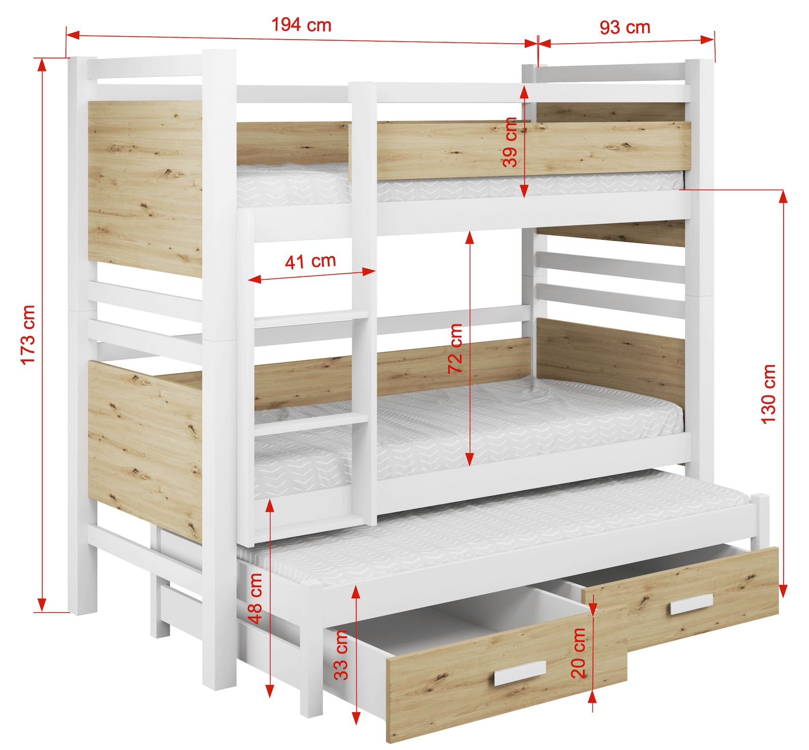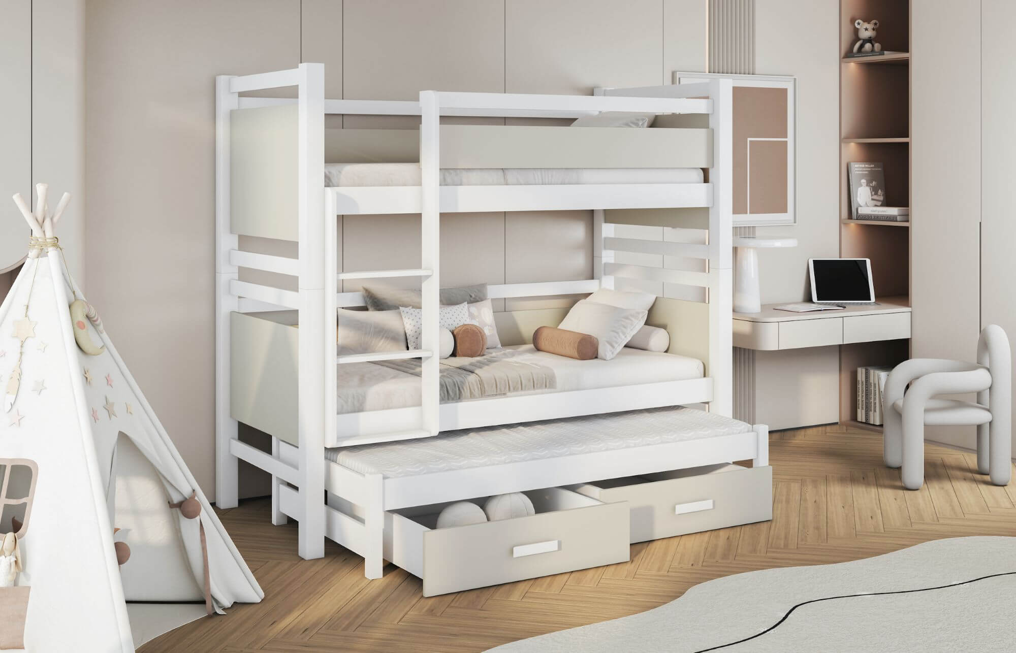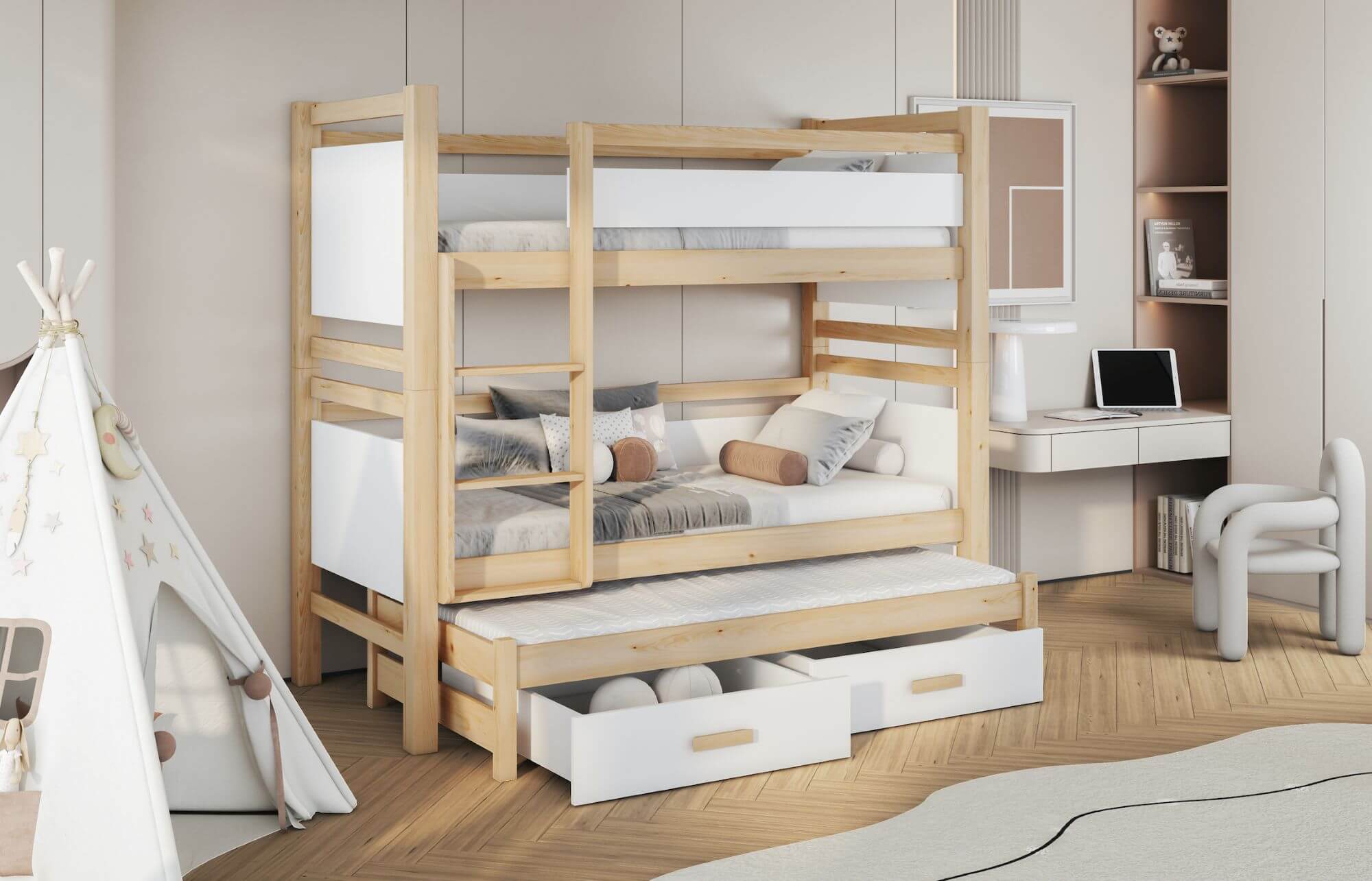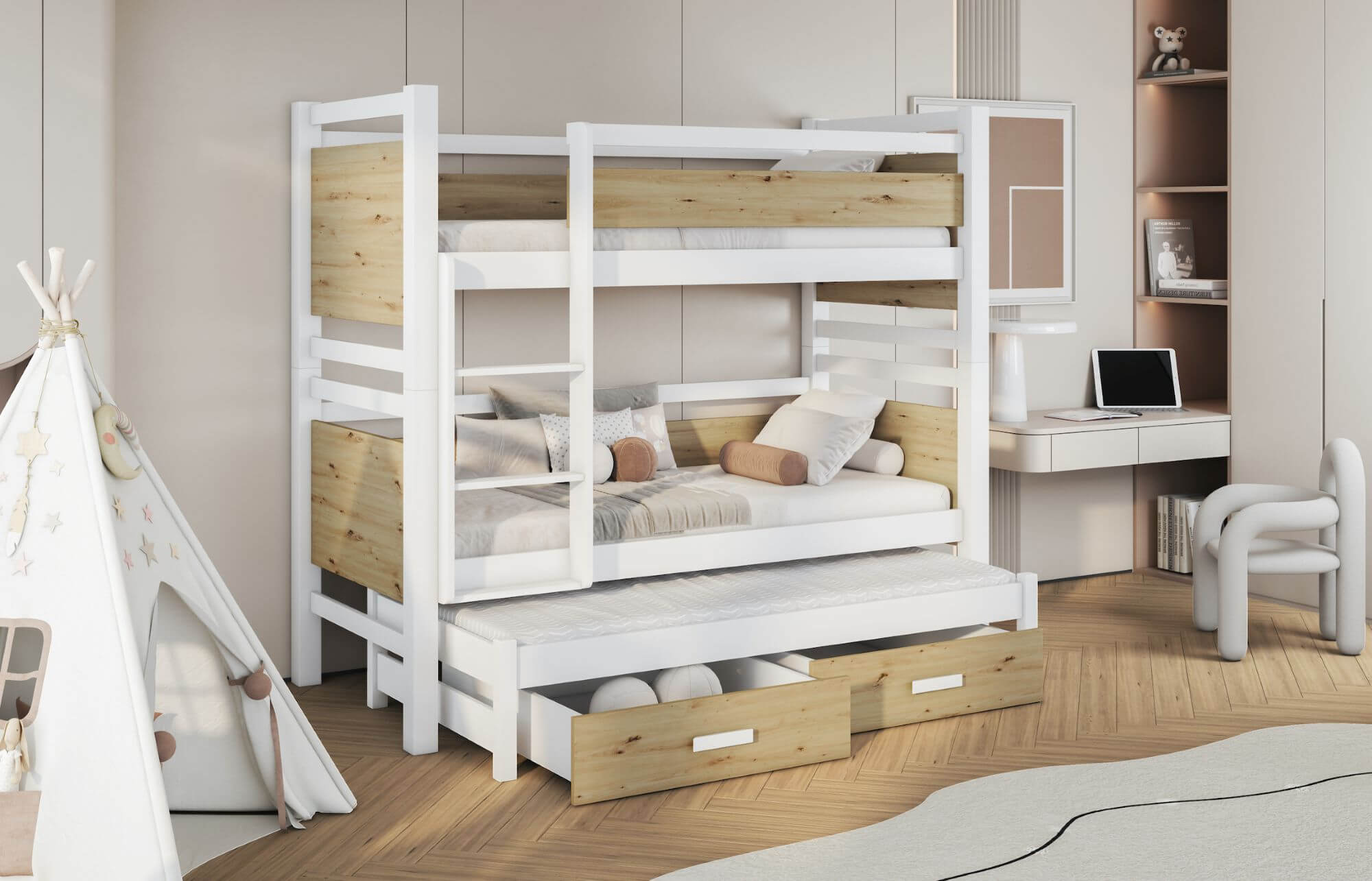 JANIS III łóżko 3 osobowe wykonane z drewna sosnowego w kolorze biały akryl w połączeniu z płytą w kolorze kaszmirowy beż (główne zdjęcie). Trzy warstwy lakieru sprawiają, że powierzchnia jest odporna na zniszczenia i zabrudzenia. Na dole znajdują się dwie pojemne szuflady. Dostępna kolorystyka drewna oraz płyty poniżej. Materace nie występują w komplecie z łóżkiem, należy domówić je oddzielnie.