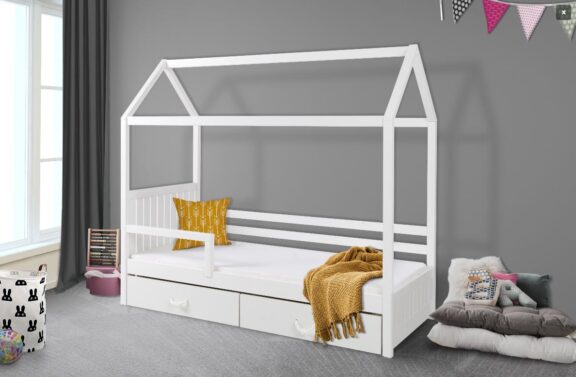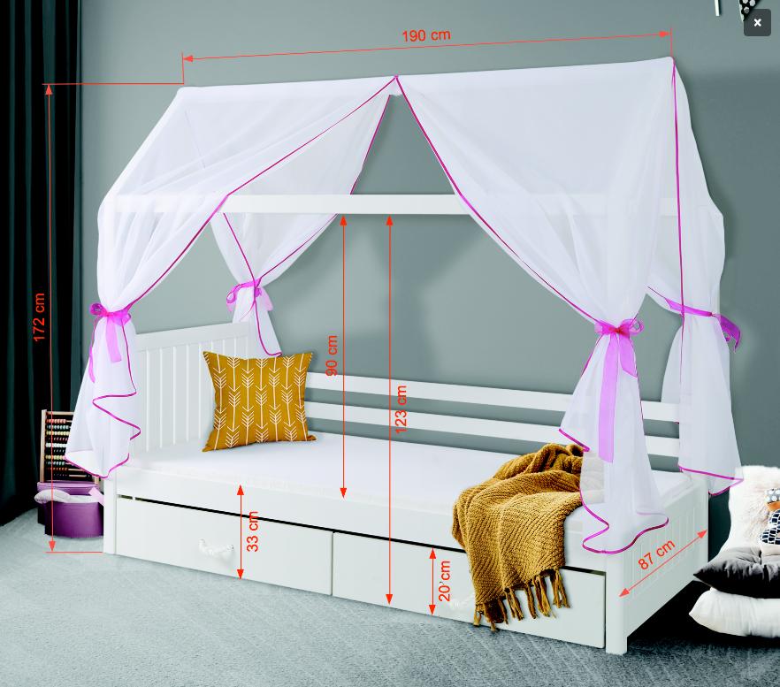 Rozalia -łóżko 1 osobowe, w modelu tym rama łóżka wykonana jest z drewna sosnowego w kolorze biały akryl. Łóżko to można wykonać w innych połączeniach, dostępna kolorystyka poniżej. Łóżko to może wystąpić w opcji z baldachimem lub bez niego. Baldachim może posiadać wykończenie niebieskie bądź różowe.