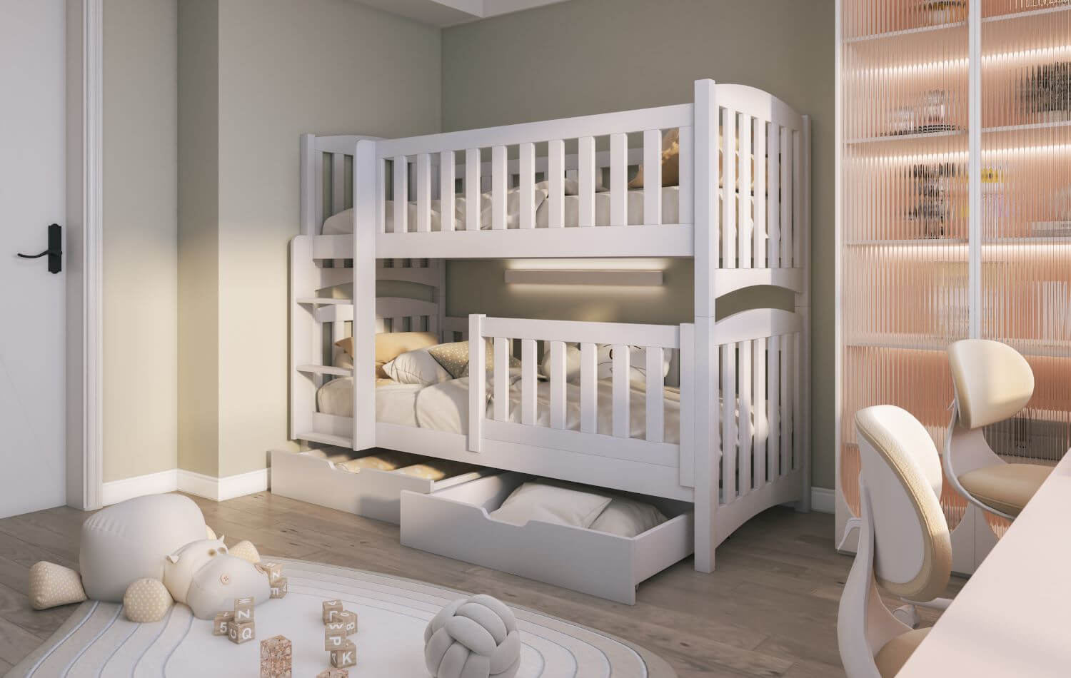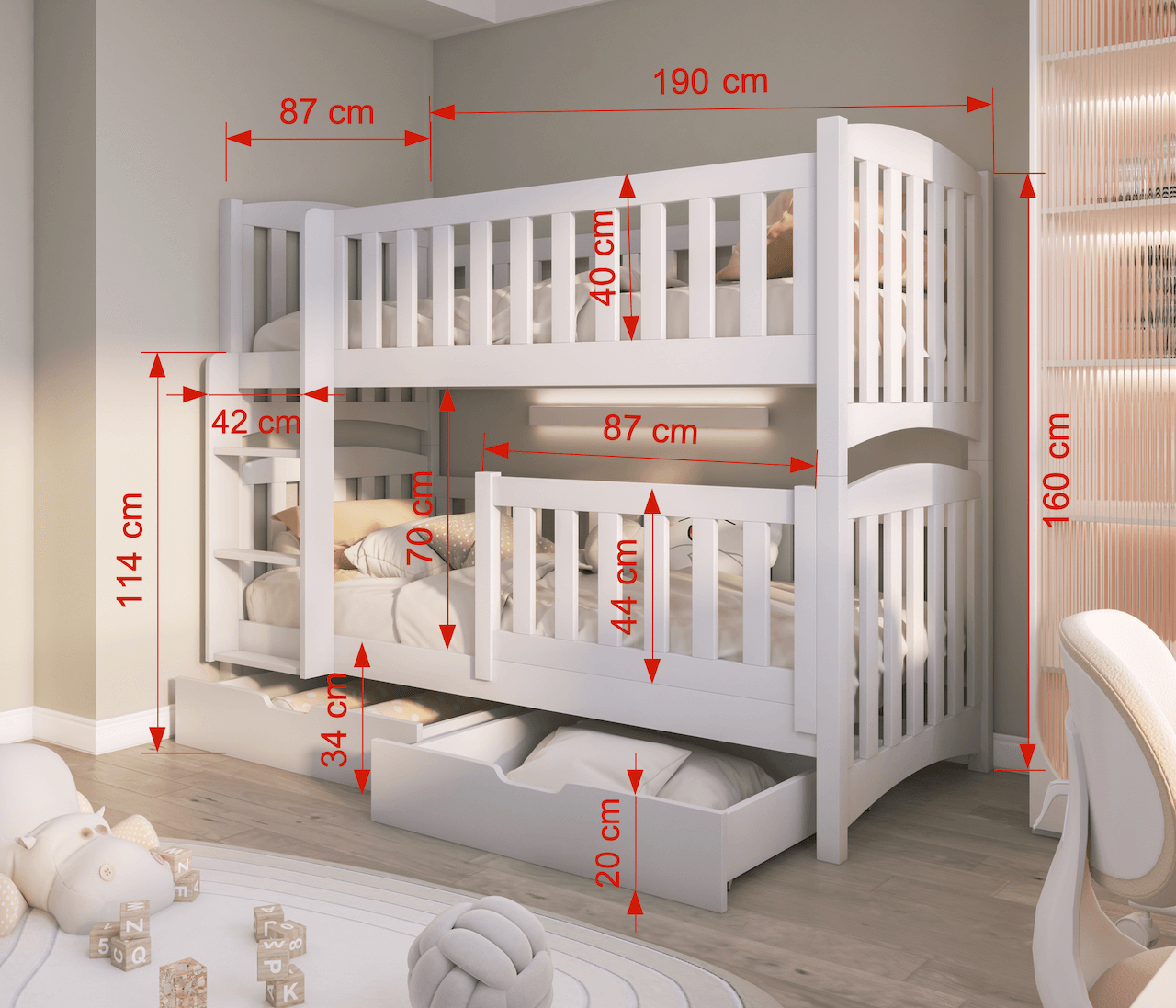 Łóżko piętrowe wysokie  zostało wykonane w całości w kolorze białym (zdjęcie główne). Powierzchnia została pokryta trzema warstwami lakieru, aby nie narażać drewna na uszkodzenia mechaniczne. Posiada wysokie barierki, dwie szuflady oraz stelaże.  Materace nie występują w komplecie z łóżkiem, należy domówić je oddzielnie.