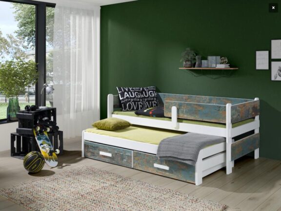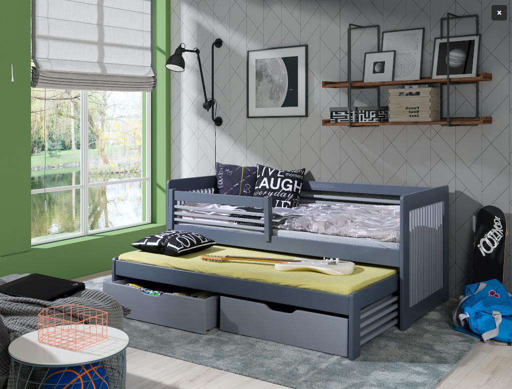 Łóżko piętrowe niskie w kolorze grafit akryl/szary akryl (zdjęcie główne) z barierką na górnym poziomie. Drugie miejsce wraz z szufladami jest wysuwane na rolkach jezdnych.
