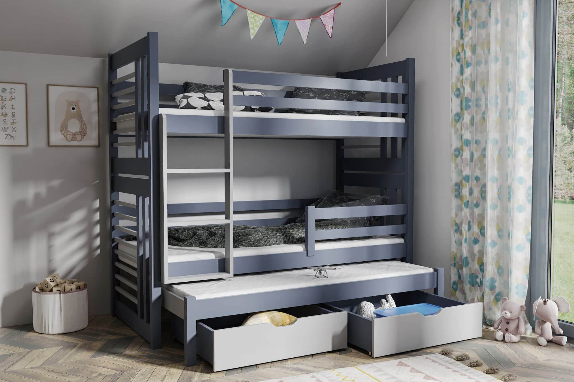 W skład zestawu wchodzi stelaż oraz 2 szuflady.