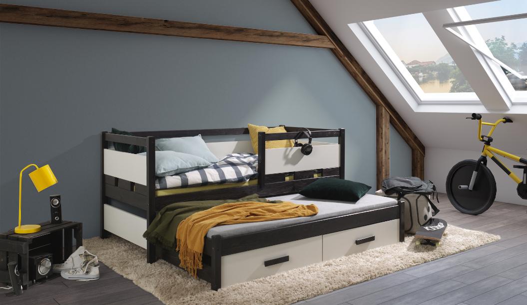 TIGRAN – łóżko 2 osobowe, w modelu tym rama łóżka została wykonana z drewna sosnowego w kolorze wenge, wstawki z płyty oklejonej obrzeżem ABS w kolorze białym dostępne również w innych kolorach. Łóżko zostało wyposażone w materac piankowy wraz z pokrowcem bawełnianym. Natomiast dolna część dla drugiej osoby i szuflady wysuwają się na rolkach jezdnych. Dostępna kolorystyka poniżej.