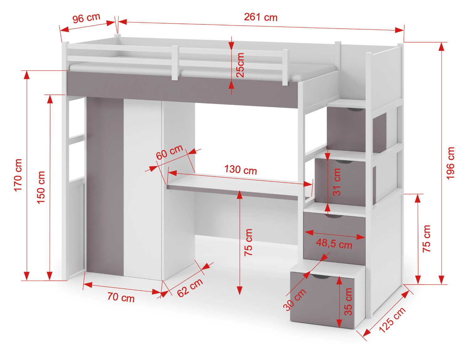 | Wymiary w cm | długość: 261 | szerokość: 96 | wysokość: 196 |