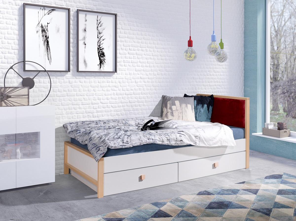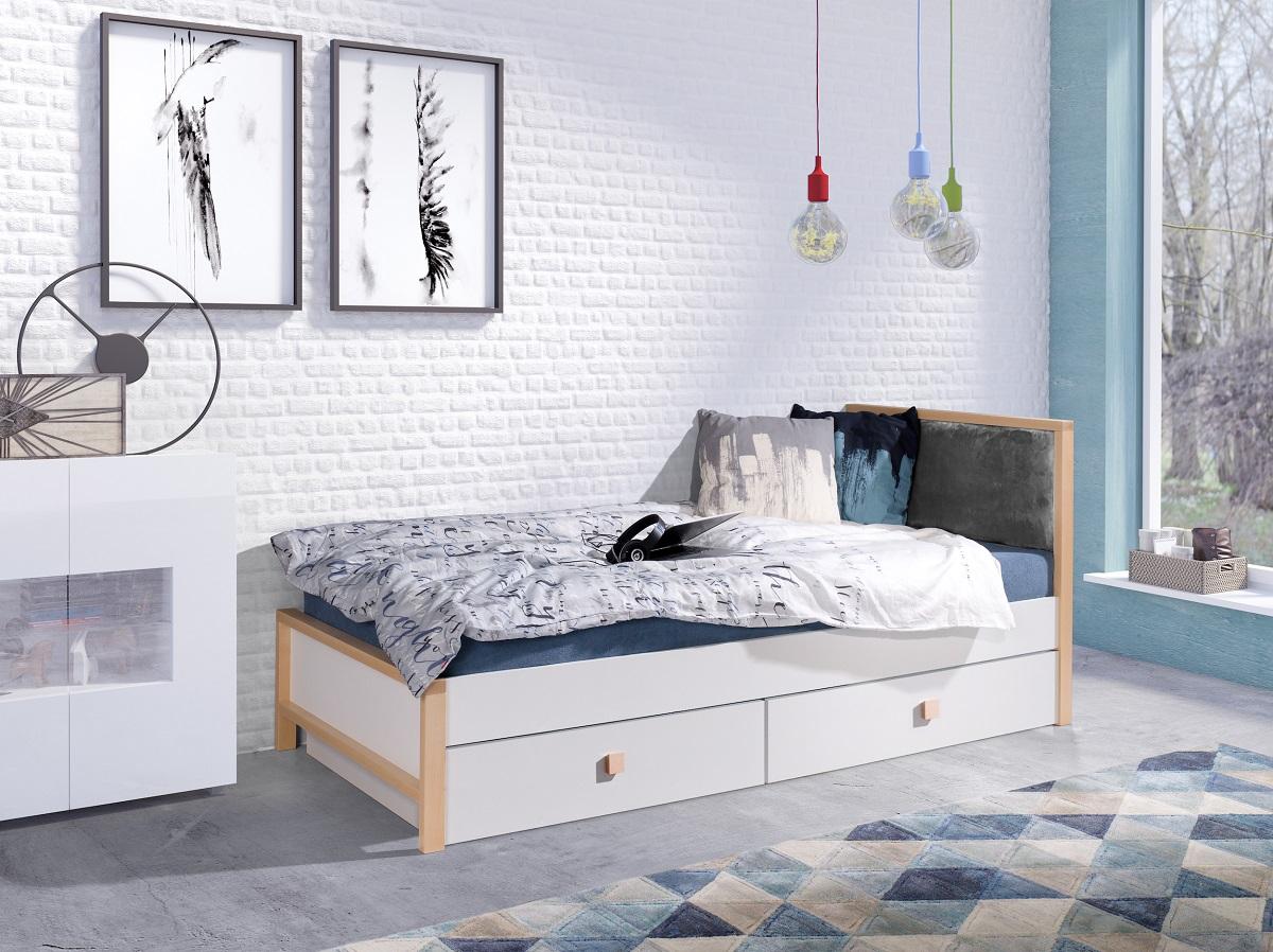 W tym modelu rama łóżka wykonana jest z drewna bukowego w kolorze naturalnym (brak możliwości zmiany) połączona z elementami wykonanymi z płyty (możliwość wyboru innej kolorystyki) oklejonej obrzeżem ABS. W szczycie łóżka została umieszczona poduszka tapicerowana nadająca charakter temu modelowi. Poduszka dostępna jest w 5 kolorach.