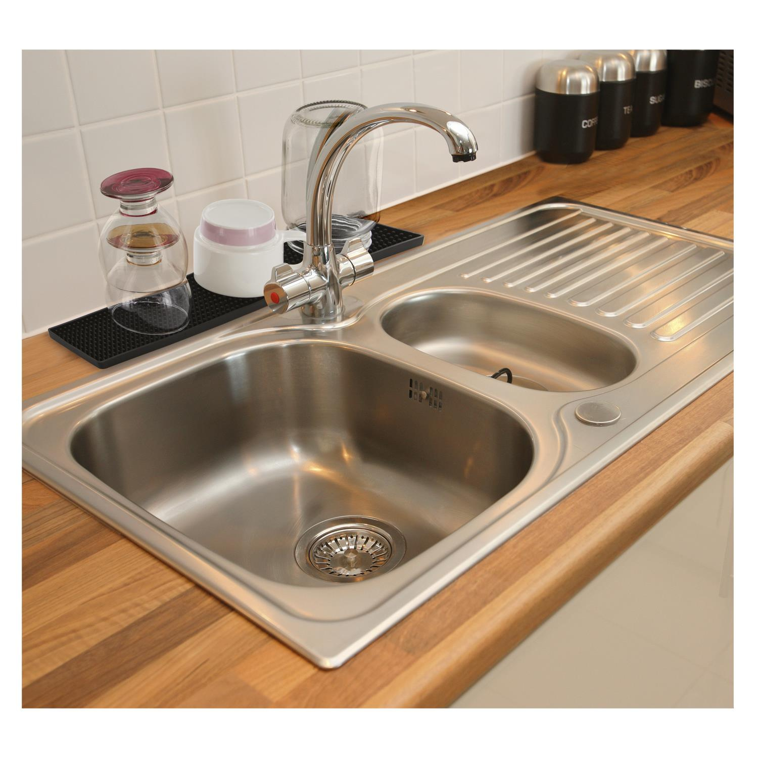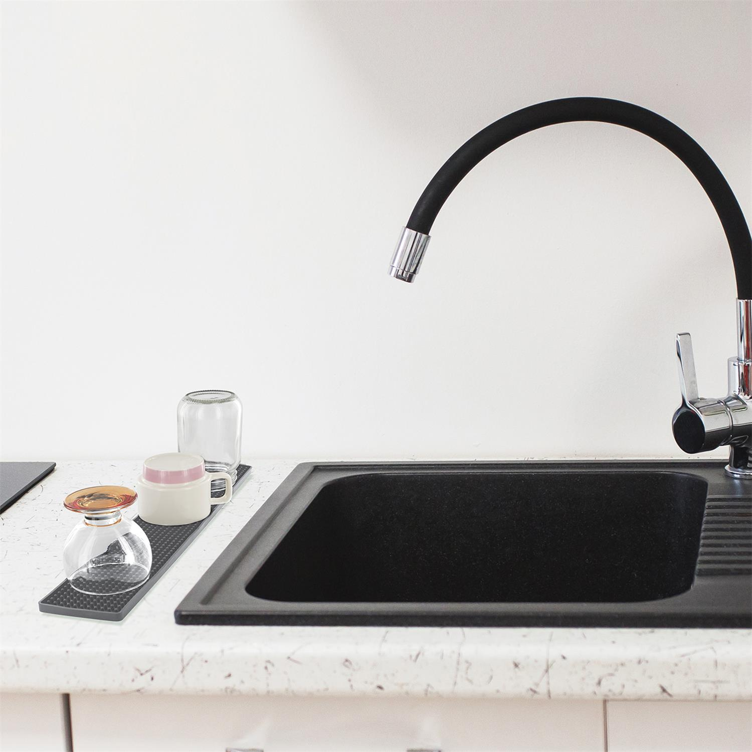 Małe przestrzenie pokochają tę długą matę ociekową. Umieść ją za zlewem kuchennym, aby zaoszczędzić jeszcze więcej miejsca. – Szybkie suszenie – Łatwe czyszczenie – Specjalna do szklanek i kubków